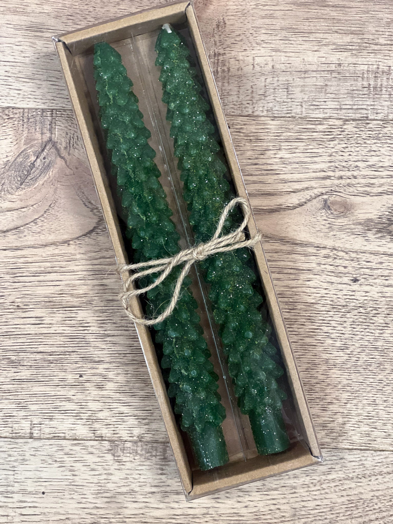 Bring holiday magic to your table with this shimmery boxed set of two 10" taper candles shaped like glittering trees. These festive candles add sparkle and charm to any celebration, creating a warm, twinkling glow that's perfect for spreading seasonal cheer. Brighten up your décor and watch the holidays shine a little brighter!