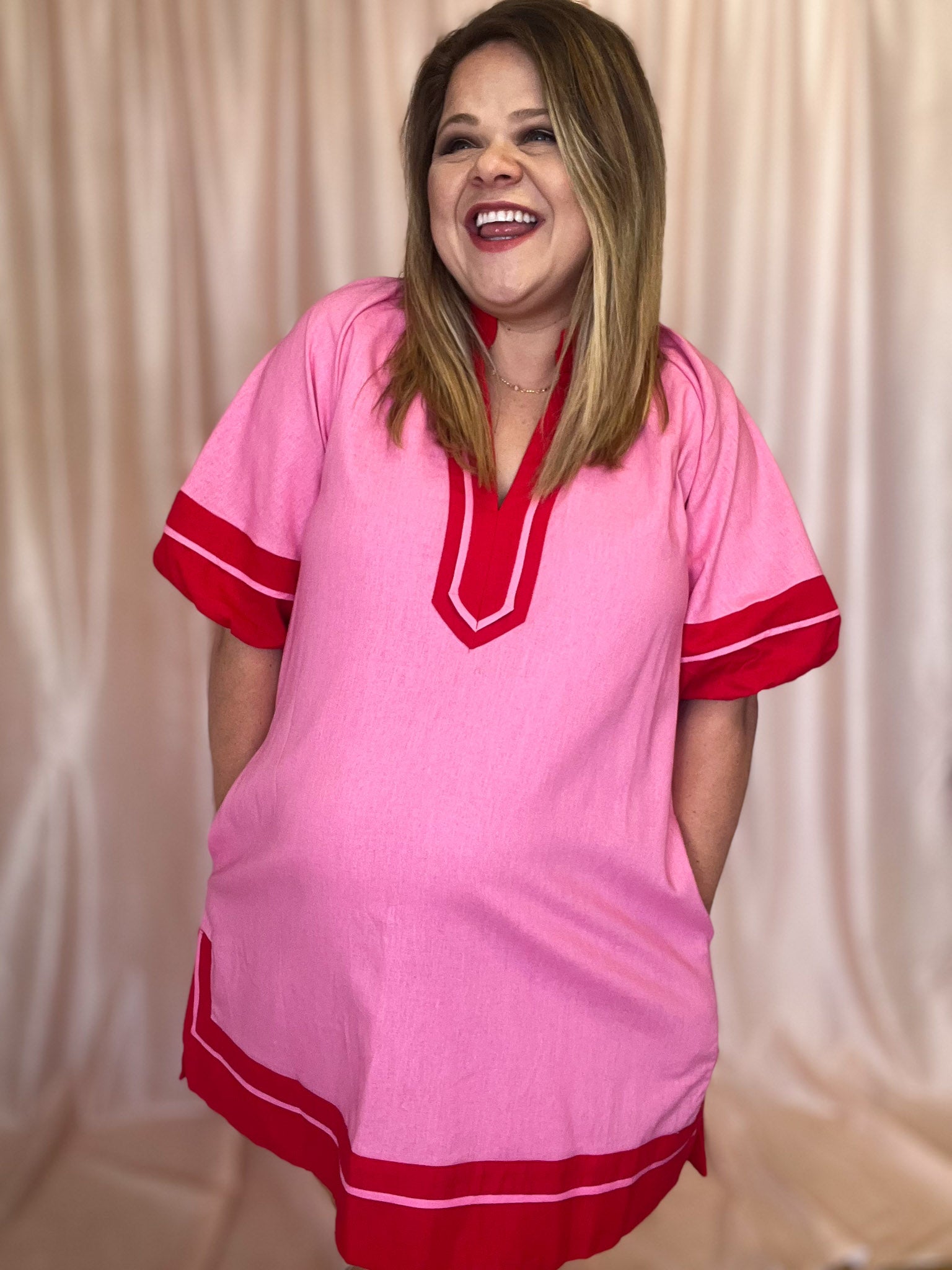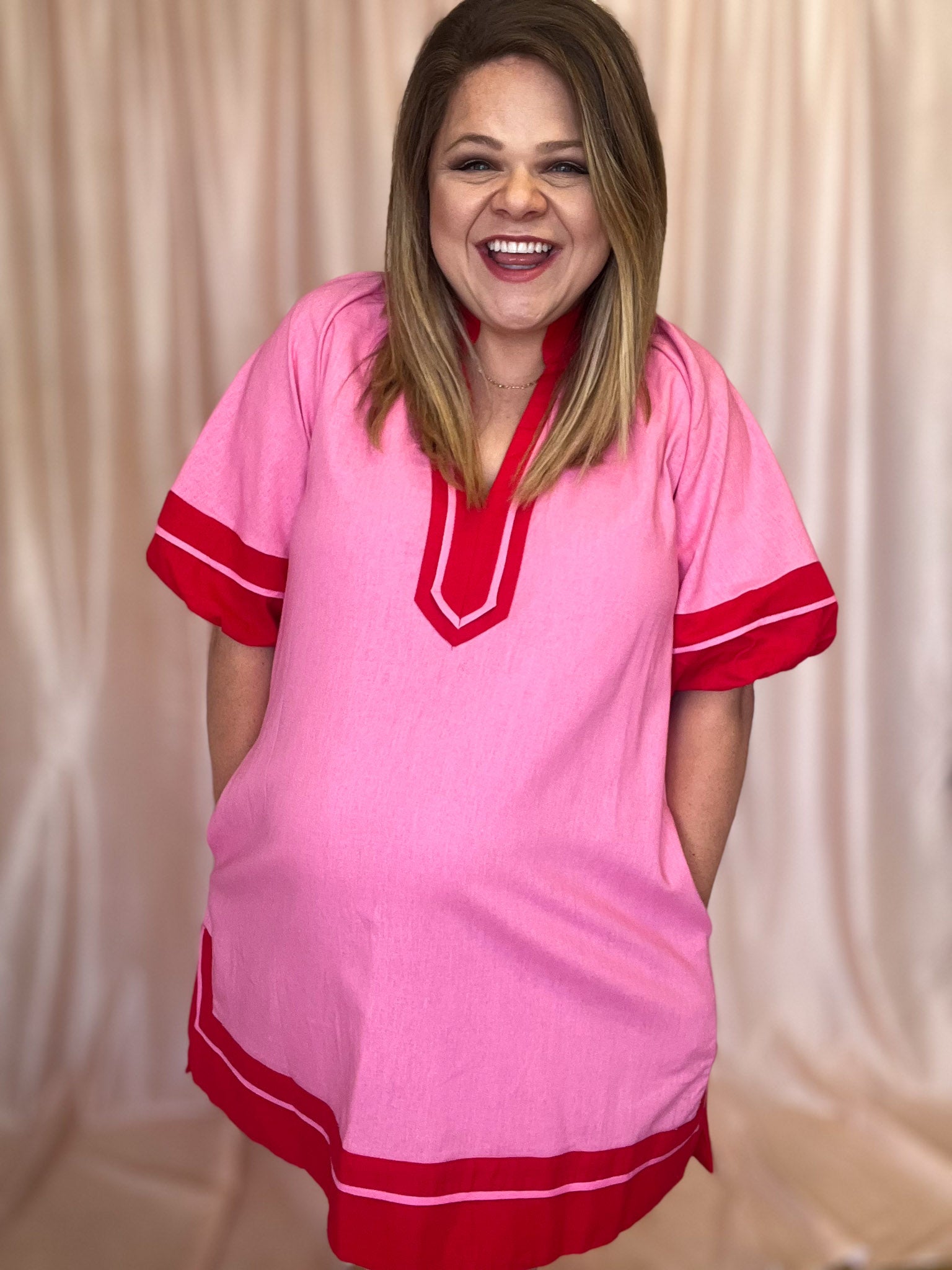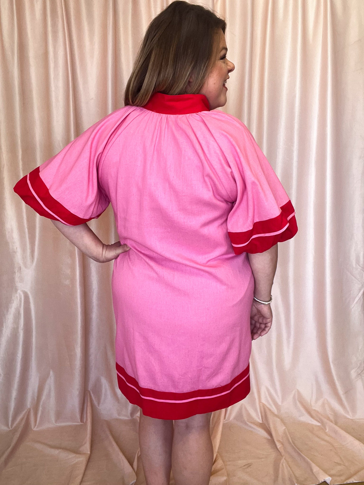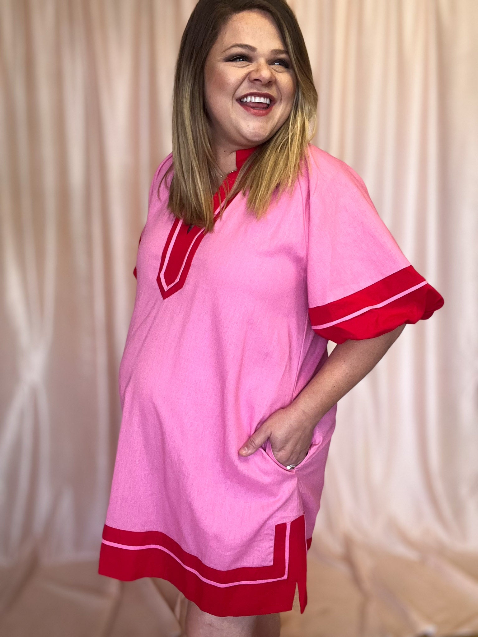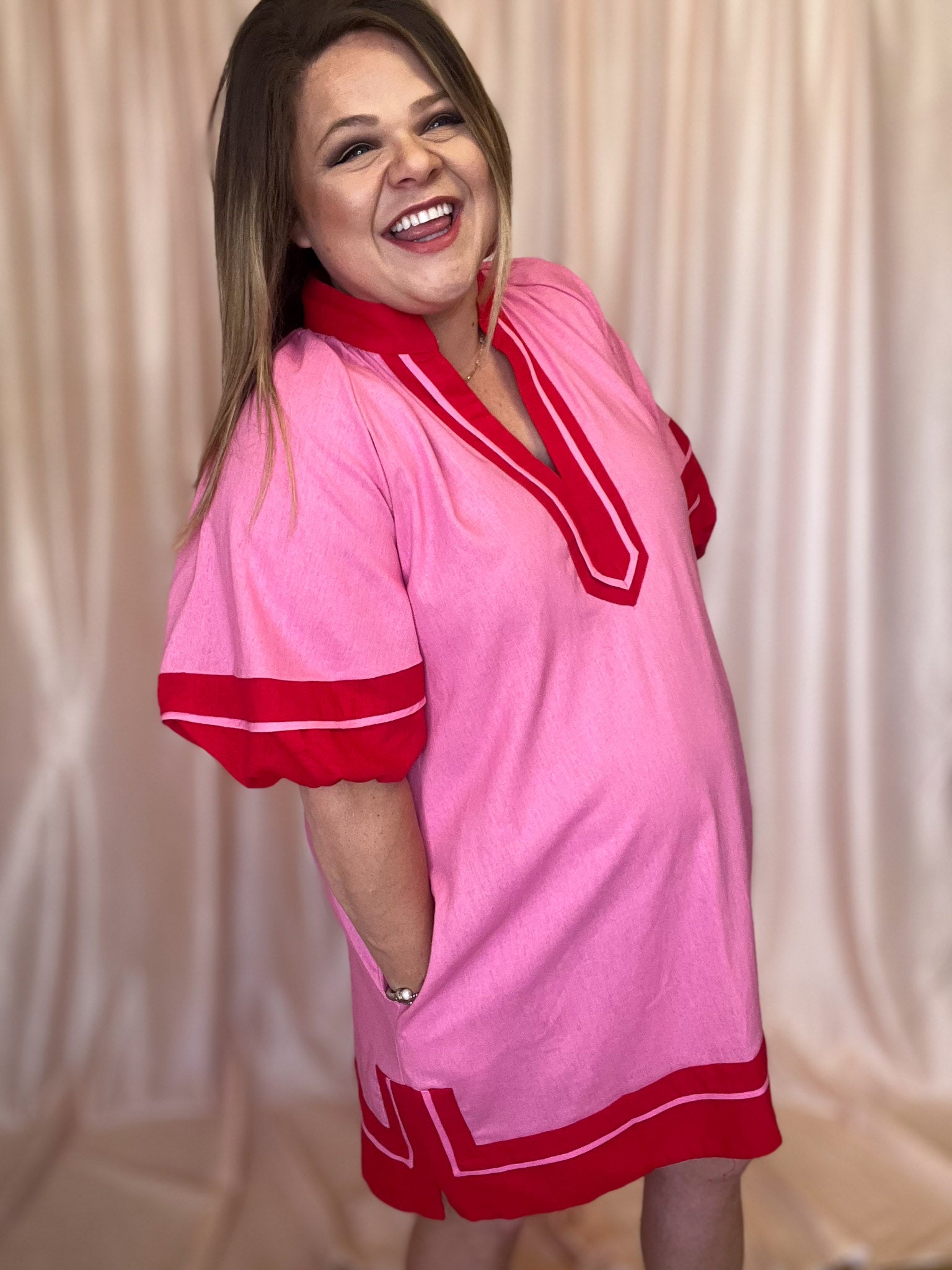 Channel your inner sophistication with this modern take on a classic look. The "A Berry Good Time" Curvy Pink & Red Dress features a pink and red contrast, v-neckline, and balloon sleeves for a trendy design with a sophisticated touch. The slimming silhouette and convenient pockets make this dress both stylish and functional. Perfect for color block lovers looking to add a touch of femininity and class to their wardrobe. Don't wait - this dress won't last long!
