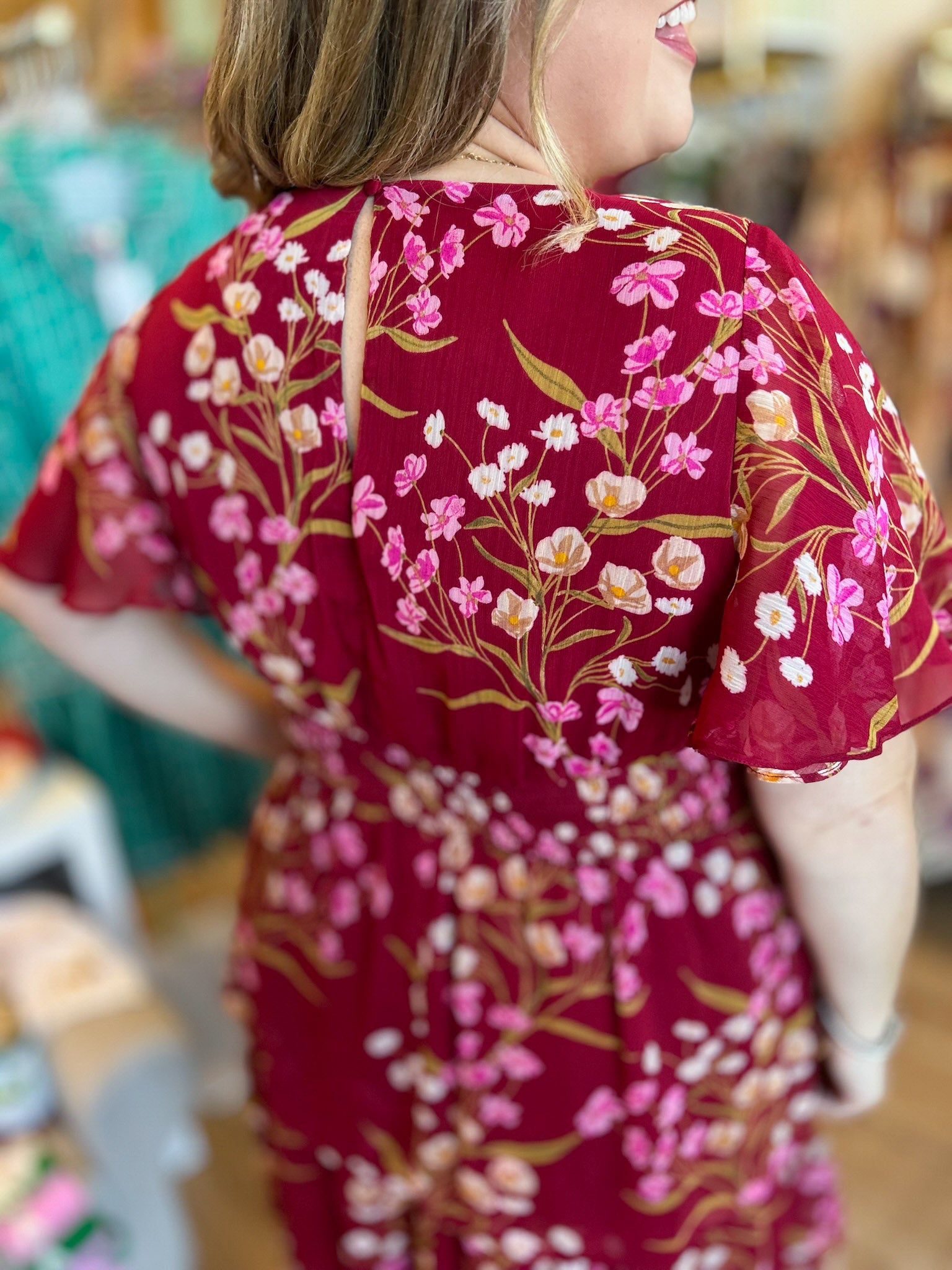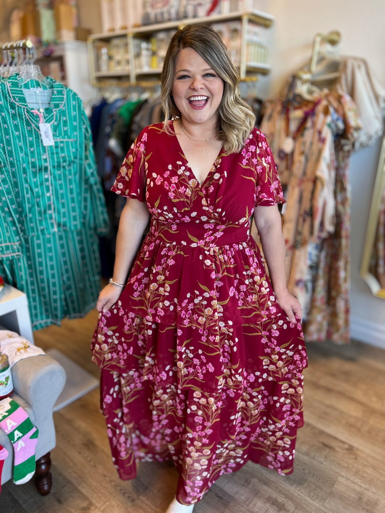 This floral-patterned maxi features a deep v-neck, short sleeves, and a tiered design with a smocked back for a flattering silhouette. Style it with any heels and a delicate clutch for a polished finish. Headed to a fall or winter wedding? Be the best-dressed guest in this A Winter Romance Curvy Tiered Maxi Dress!
