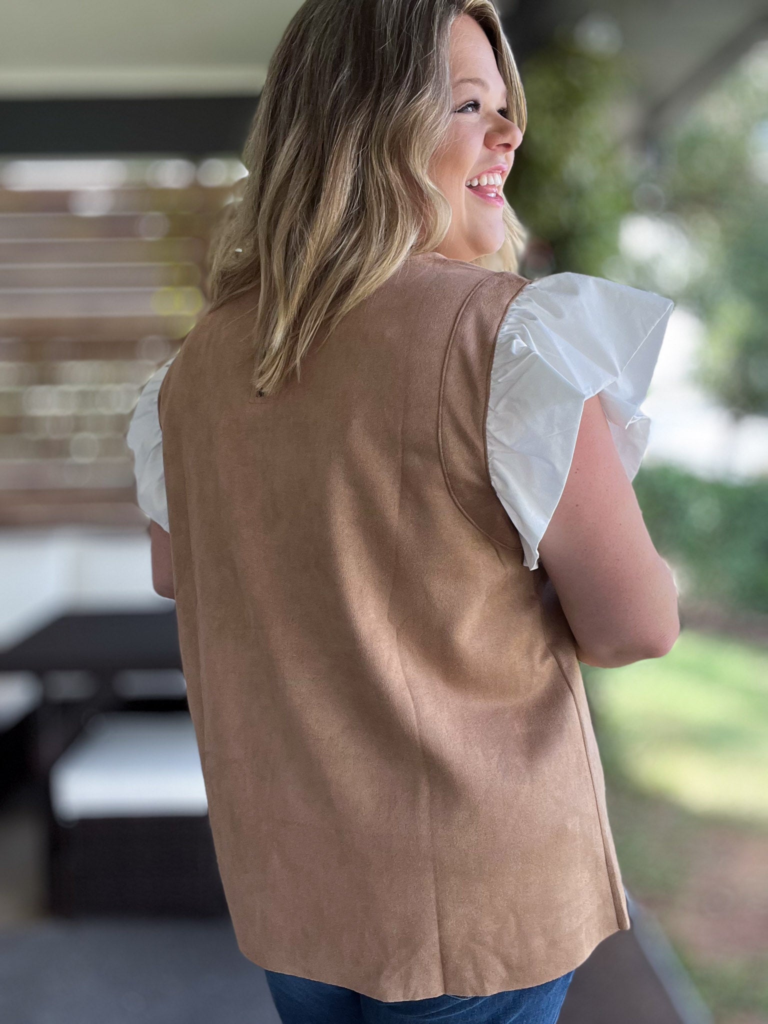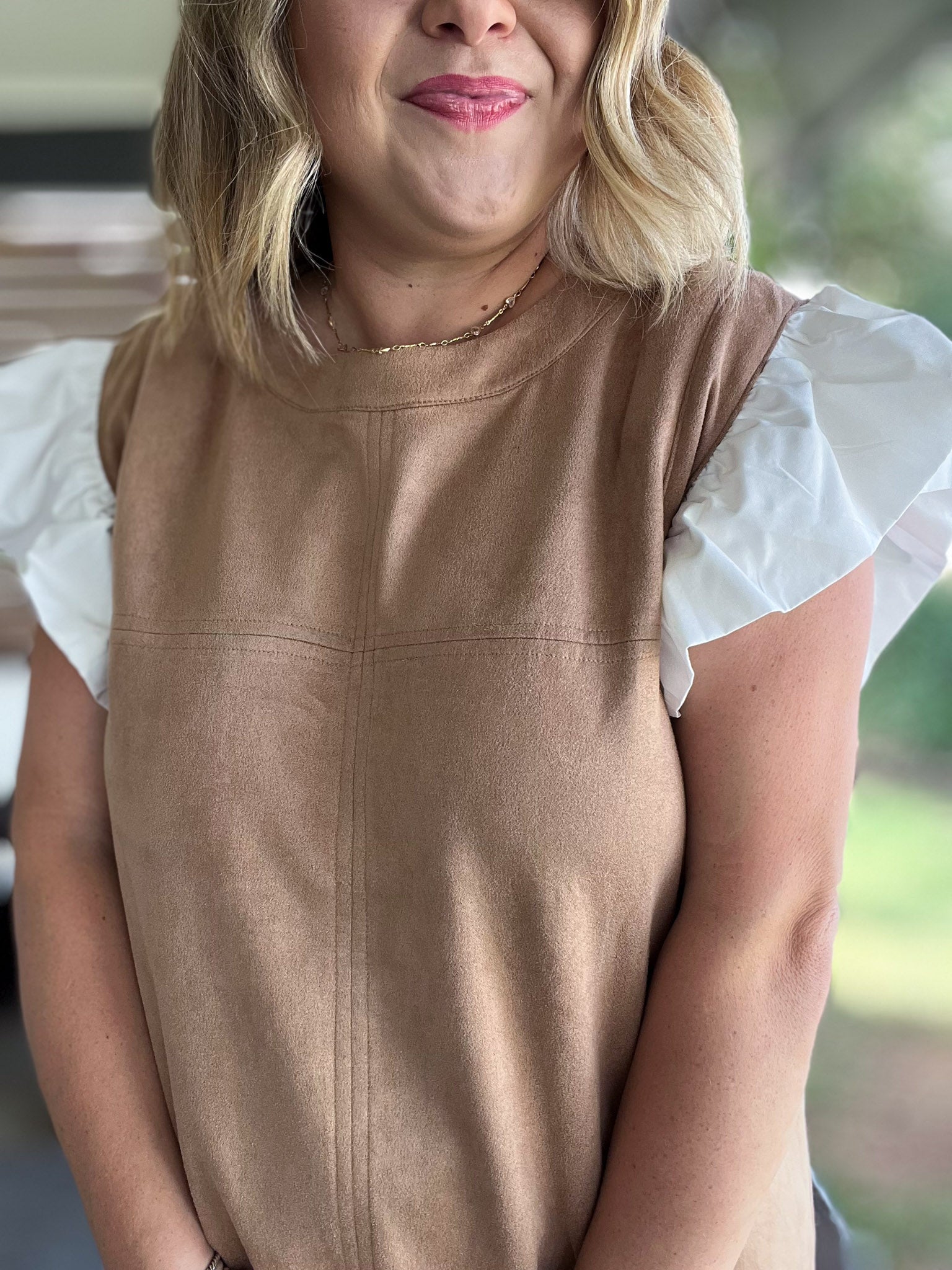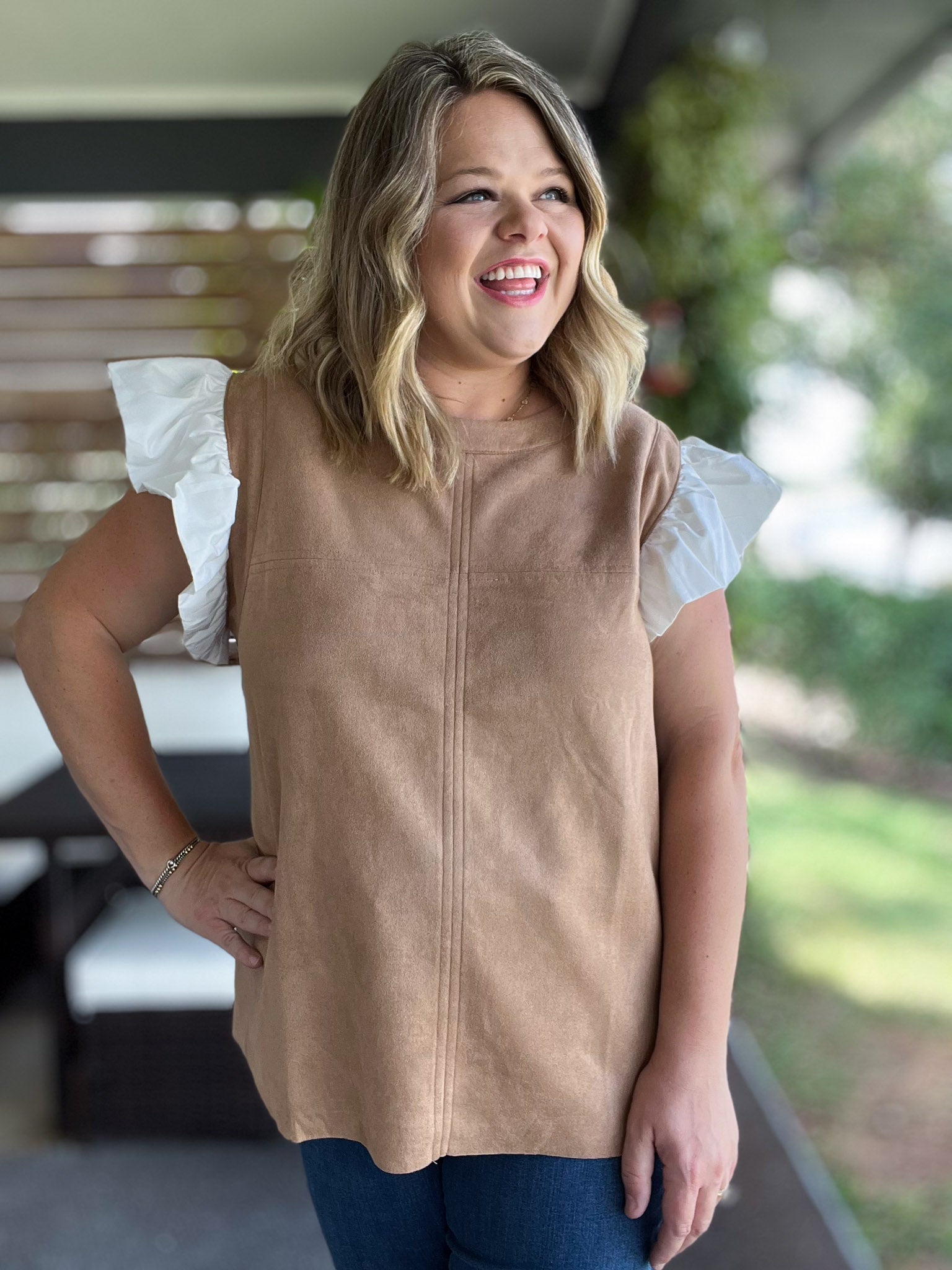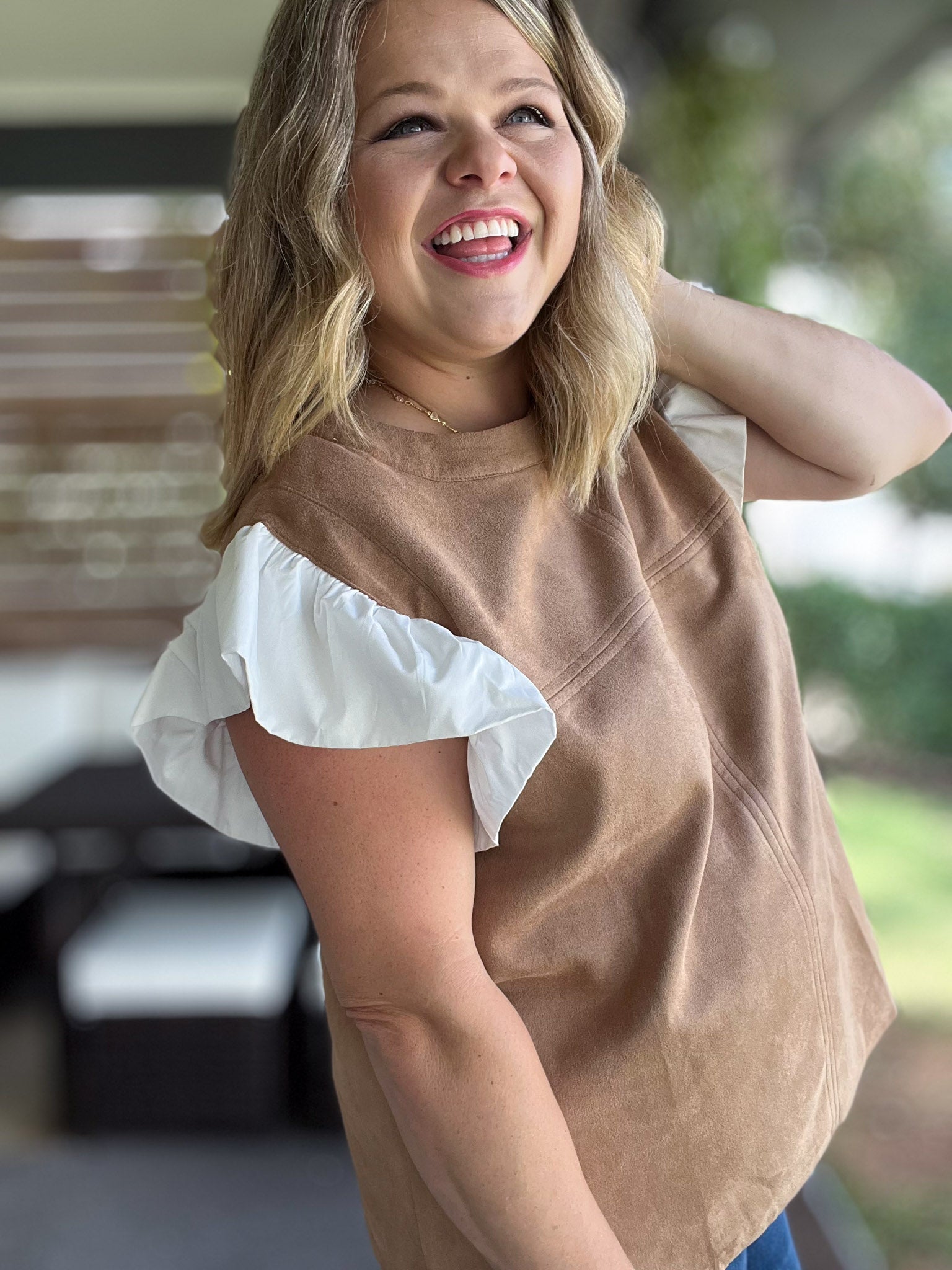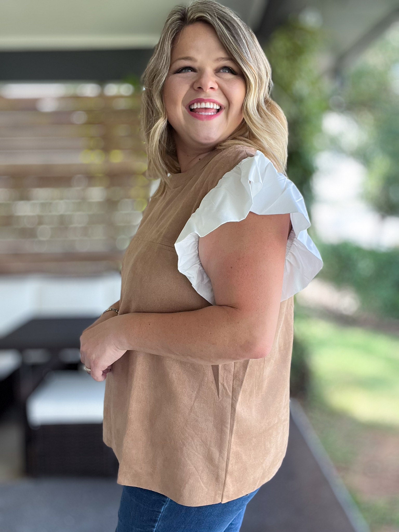 Embrace fall flair with this playful autumn-inspired top! Crafted from soft, lightweight suede-like material in a warm camel hue, this top feels "fall cozy" without the weight. The white flutter sleeves add a fun, flirty touch while keeping the look fresh. Perfect for those hot days as summer fades to fall, this plus-size gem brings comfort and style together for your seasonal wardrobe. Now available in S-3X!
