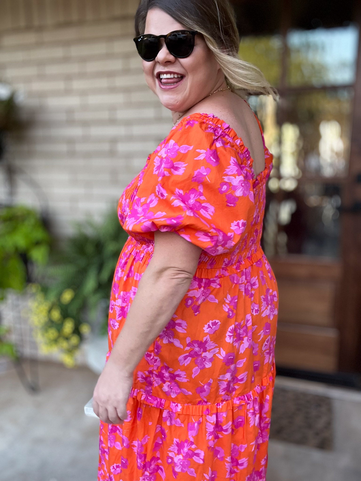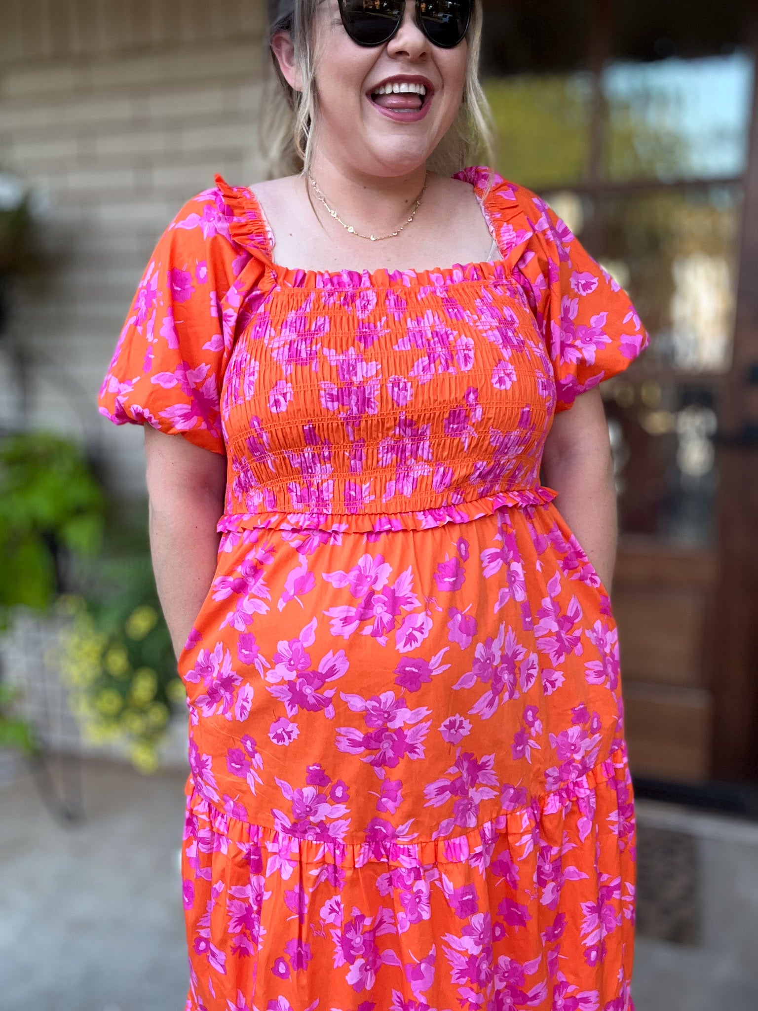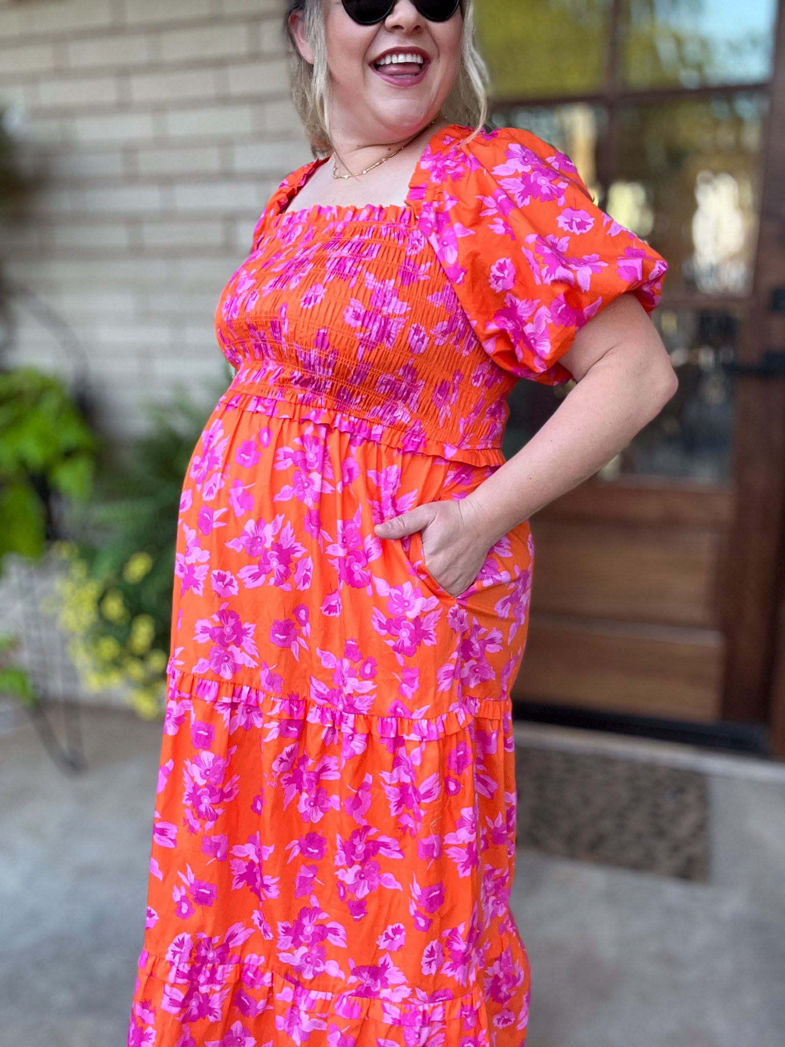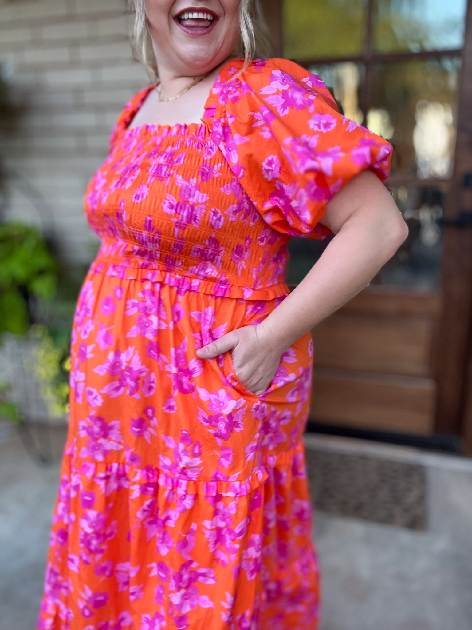 The Bellini & Brunch Plus-Size Floral Smocked Maxi Dress is sure to bring a playful, garden party chic vibe to your wardrobe! Adorned with delicate pink and orange florals, puff sleeves, and ruffled tiers, this beautiful piece radiates confidence yet is whimsical in shape and color. The square neck and smocked bodice offer a flattering fit, while convenient pockets add a touch of practicality. Perfect for brunch with the girls, this dress combines style and sophistication!