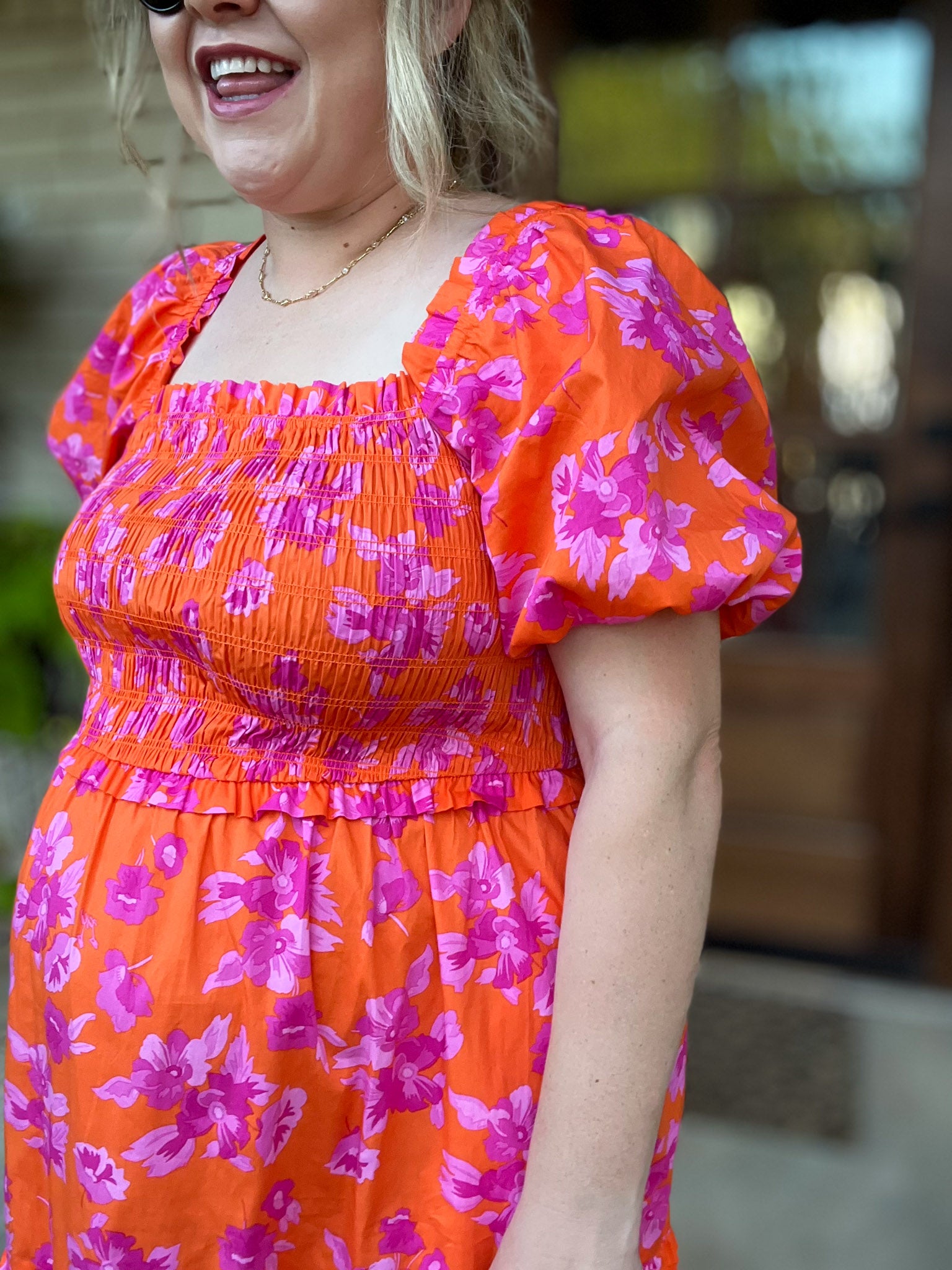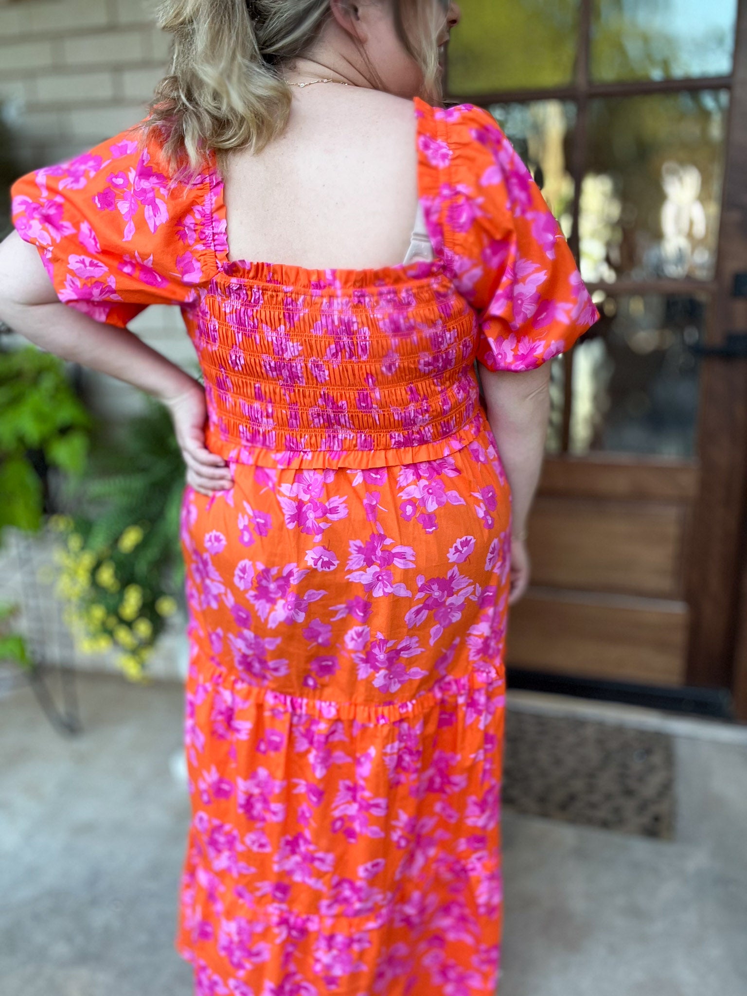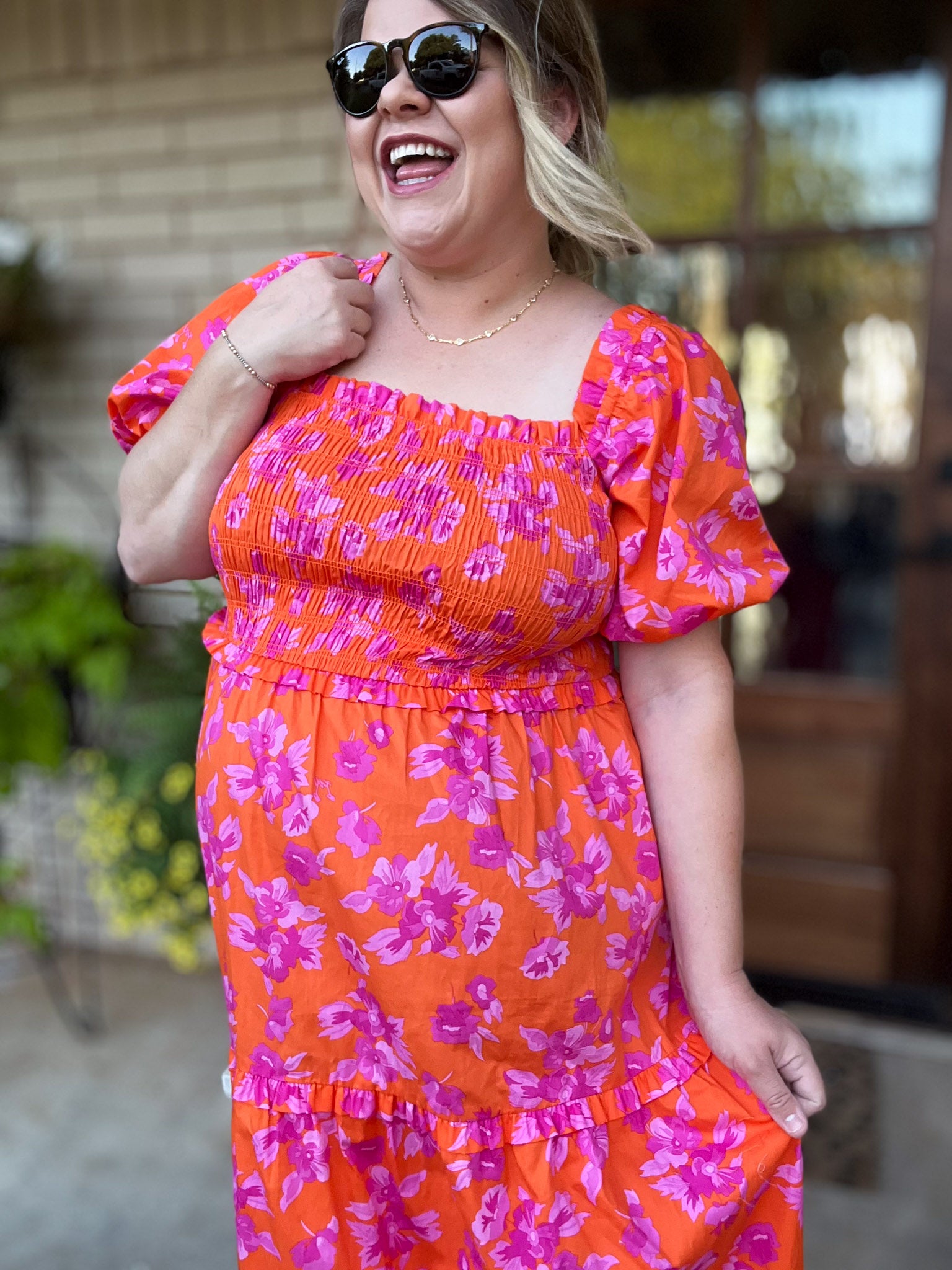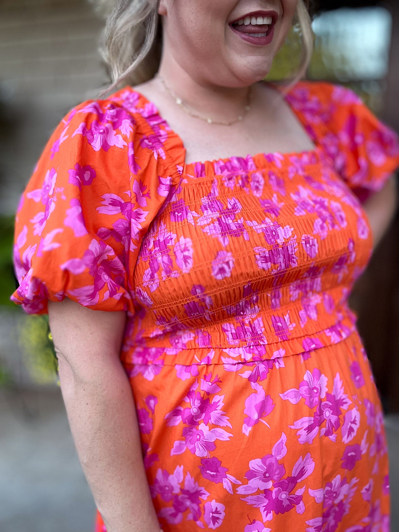 The Bellini & Brunch Plus-Size Floral Smocked Maxi Dress is sure to bring a playful, garden party chic vibe to your wardrobe! Adorned with delicate pink and orange florals, puff sleeves, and ruffled tiers, this beautiful piece radiates confidence yet is whimsical in shape and color. The square neck and smocked bodice offer a flattering fit, while convenient pockets add a touch of practicality. Perfect for brunch with the girls, this dress combines style and sophistication!