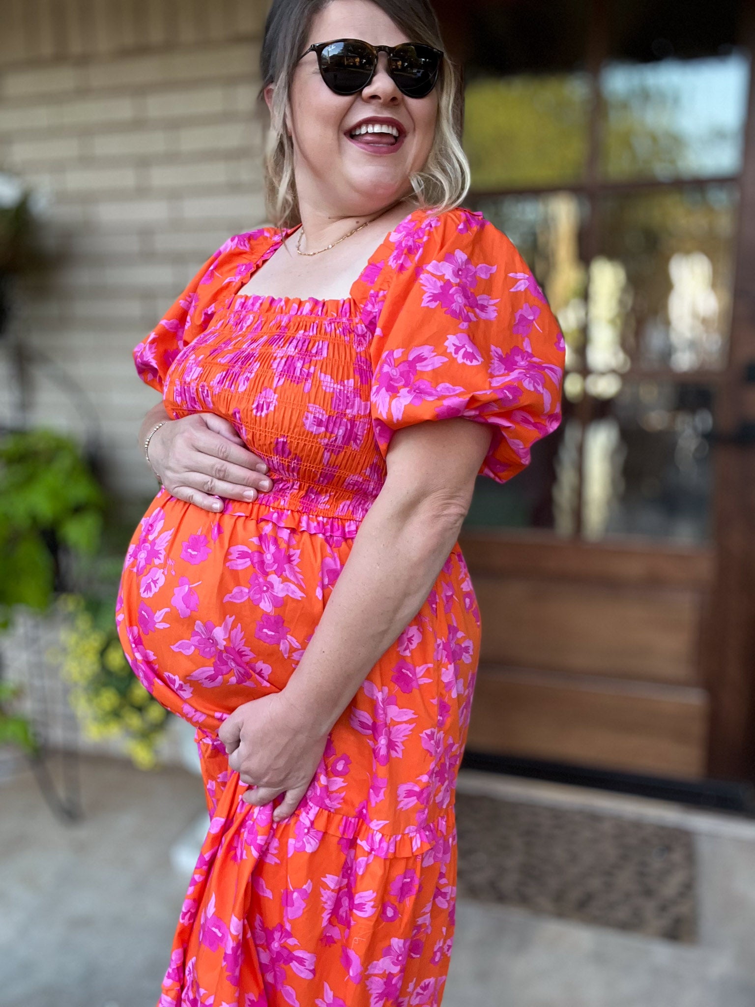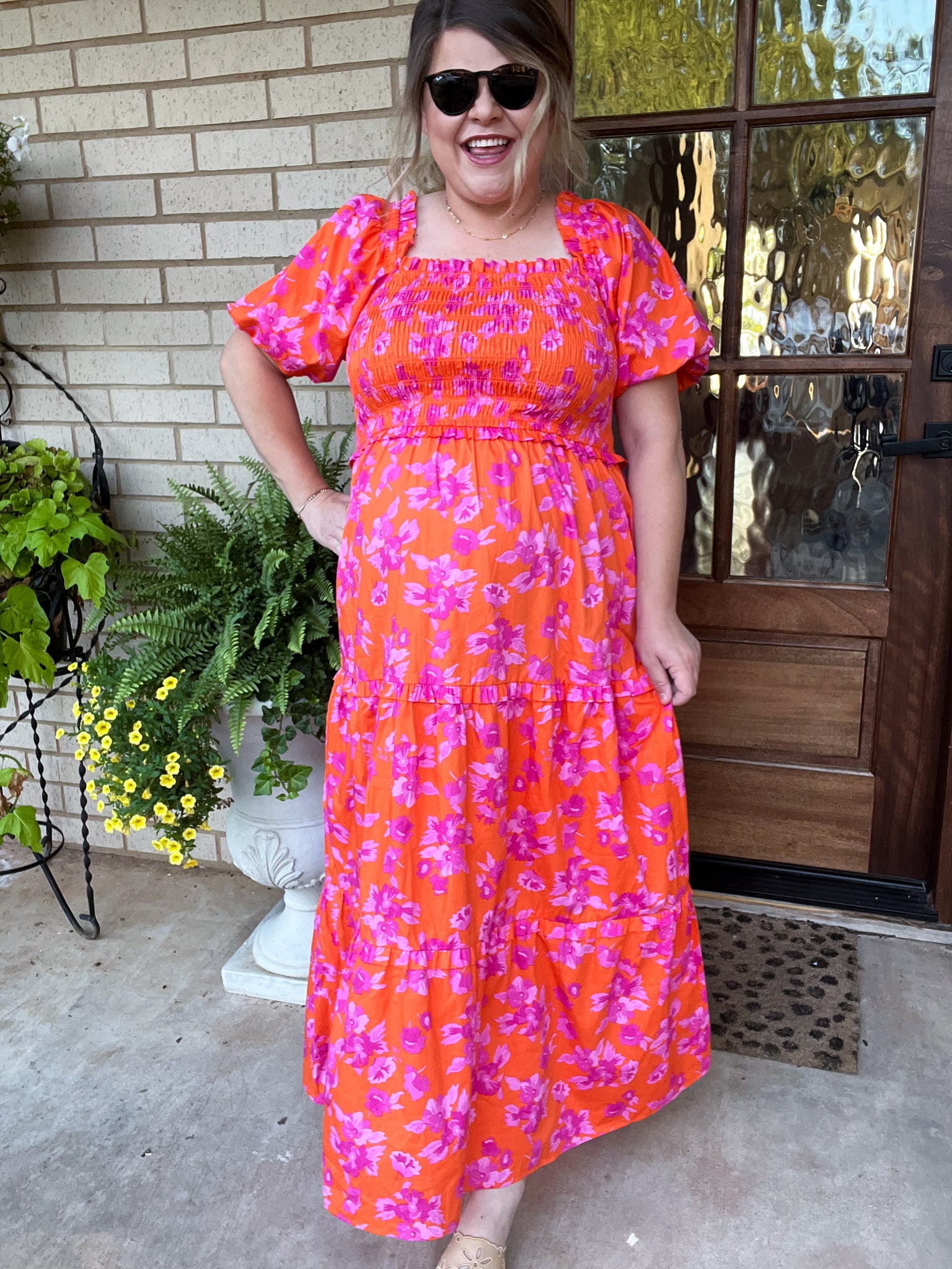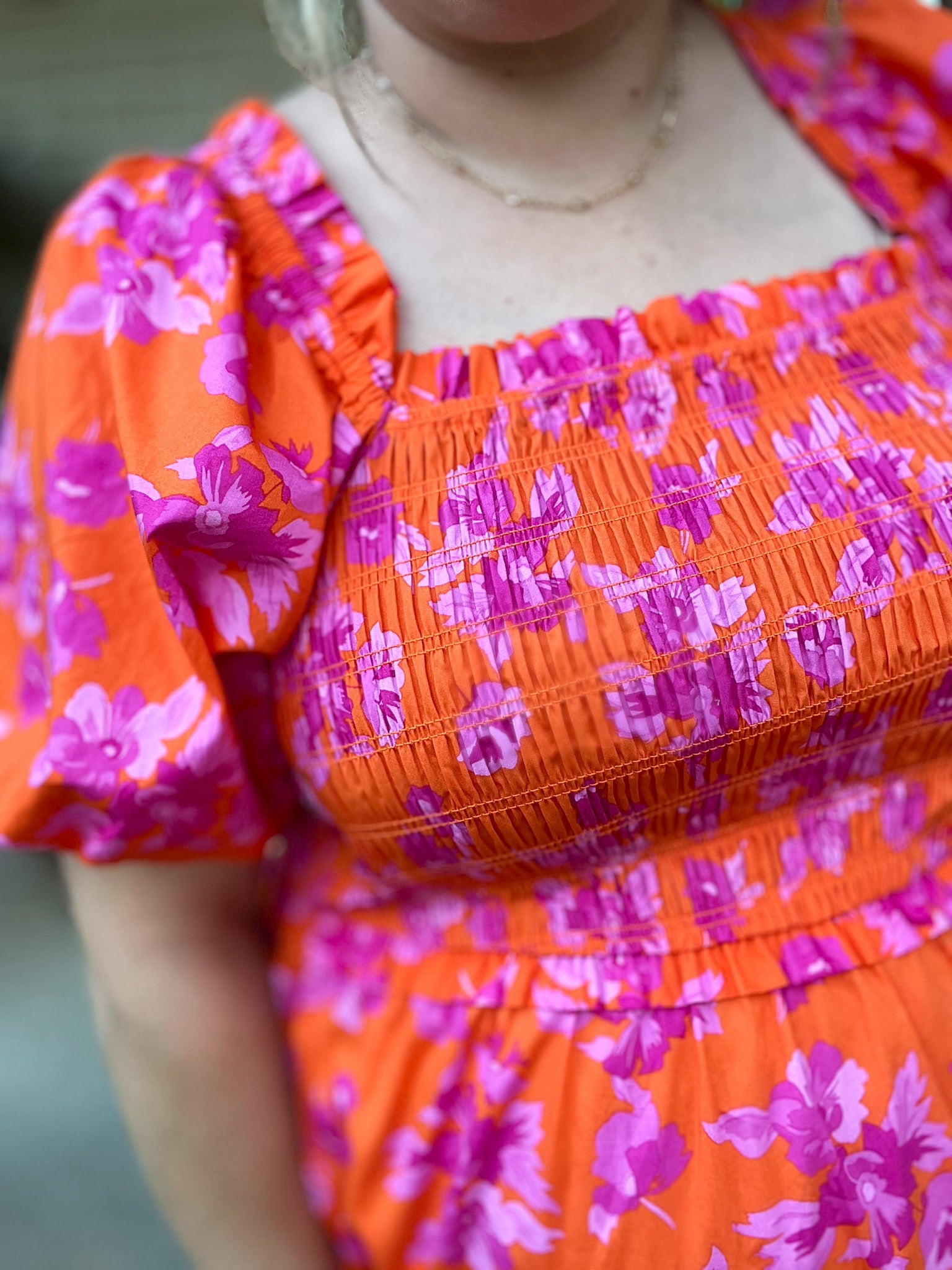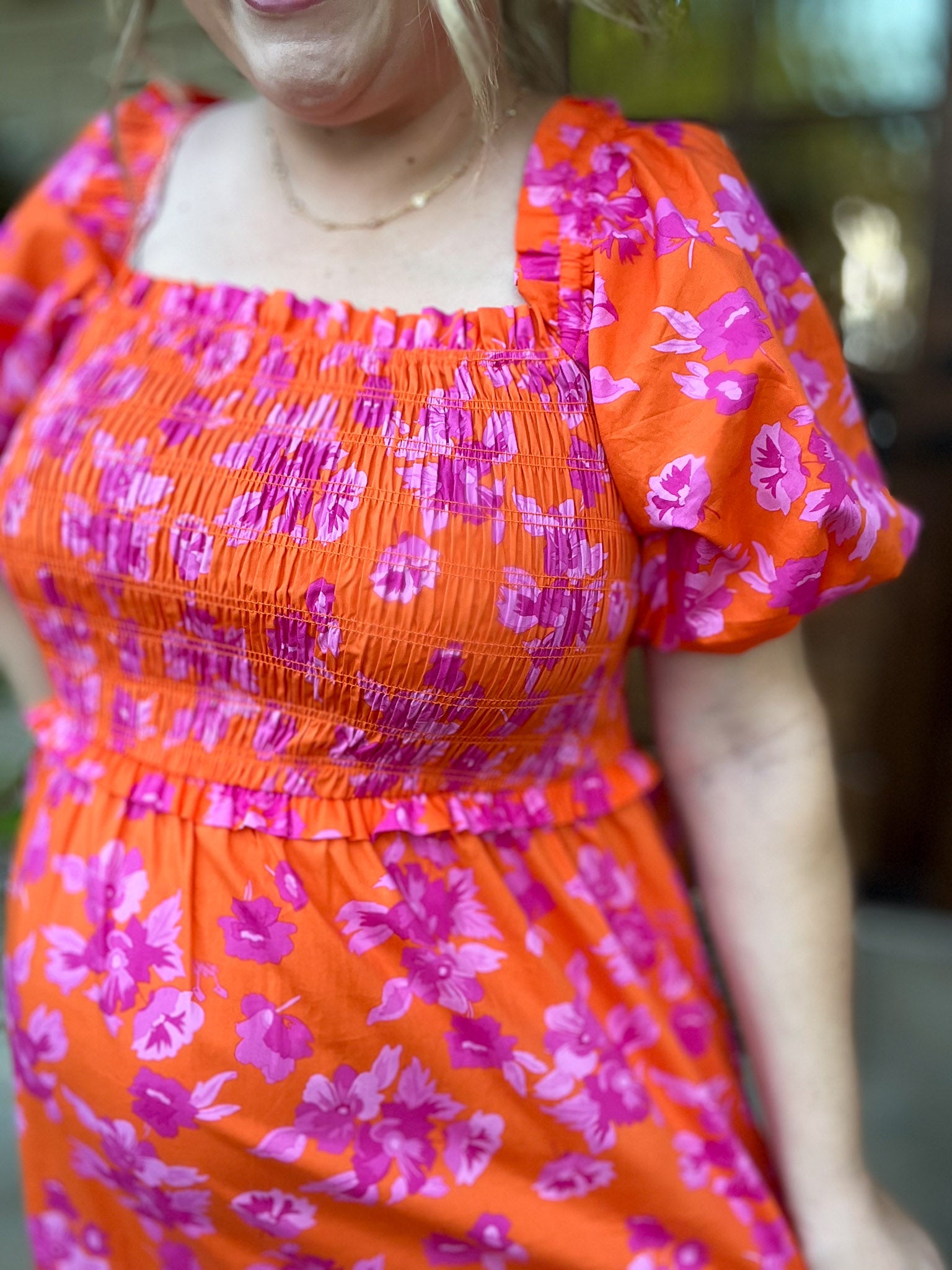 The Bellini & Brunch Plus-Size Floral Smocked Maxi Dress is sure to bring a playful, garden party chic vibe to your wardrobe! Adorned with delicate pink and orange florals, puff sleeves, and ruffled tiers, this beautiful piece radiates confidence yet is whimsical in shape and color. The square neck and smocked bodice offer a flattering fit, while convenient pockets add a touch of practicality. Perfect for brunch with the girls, this dress combines style and sophistication!