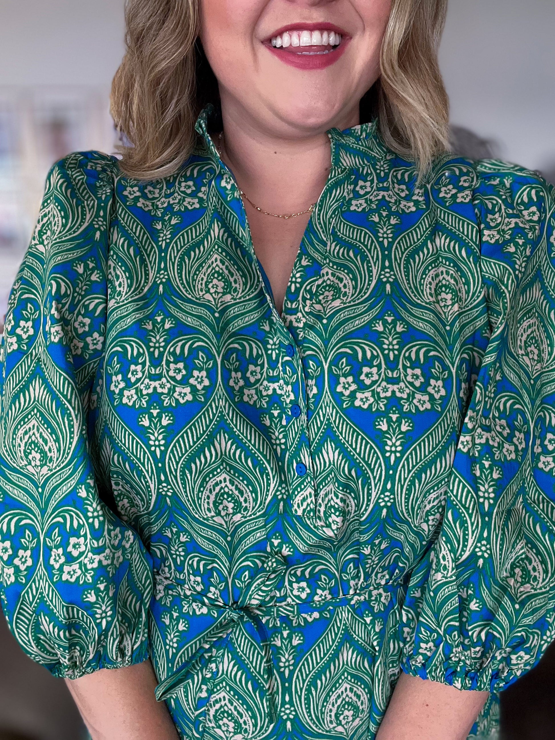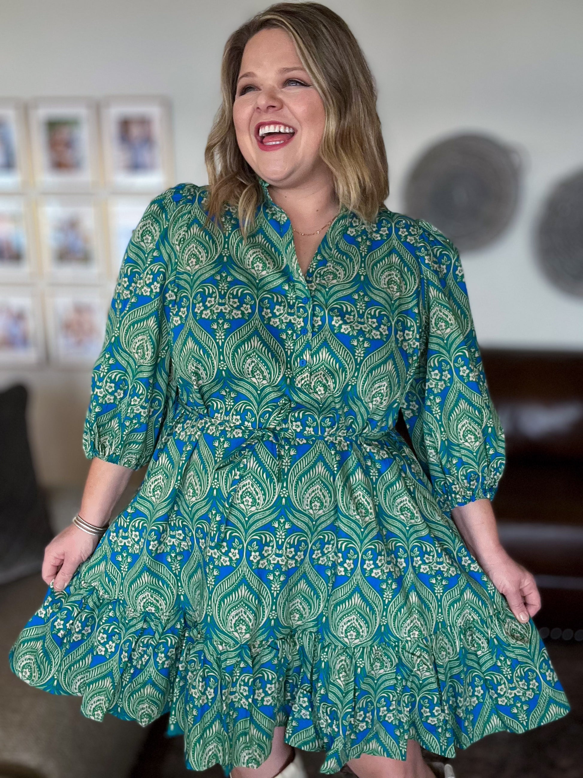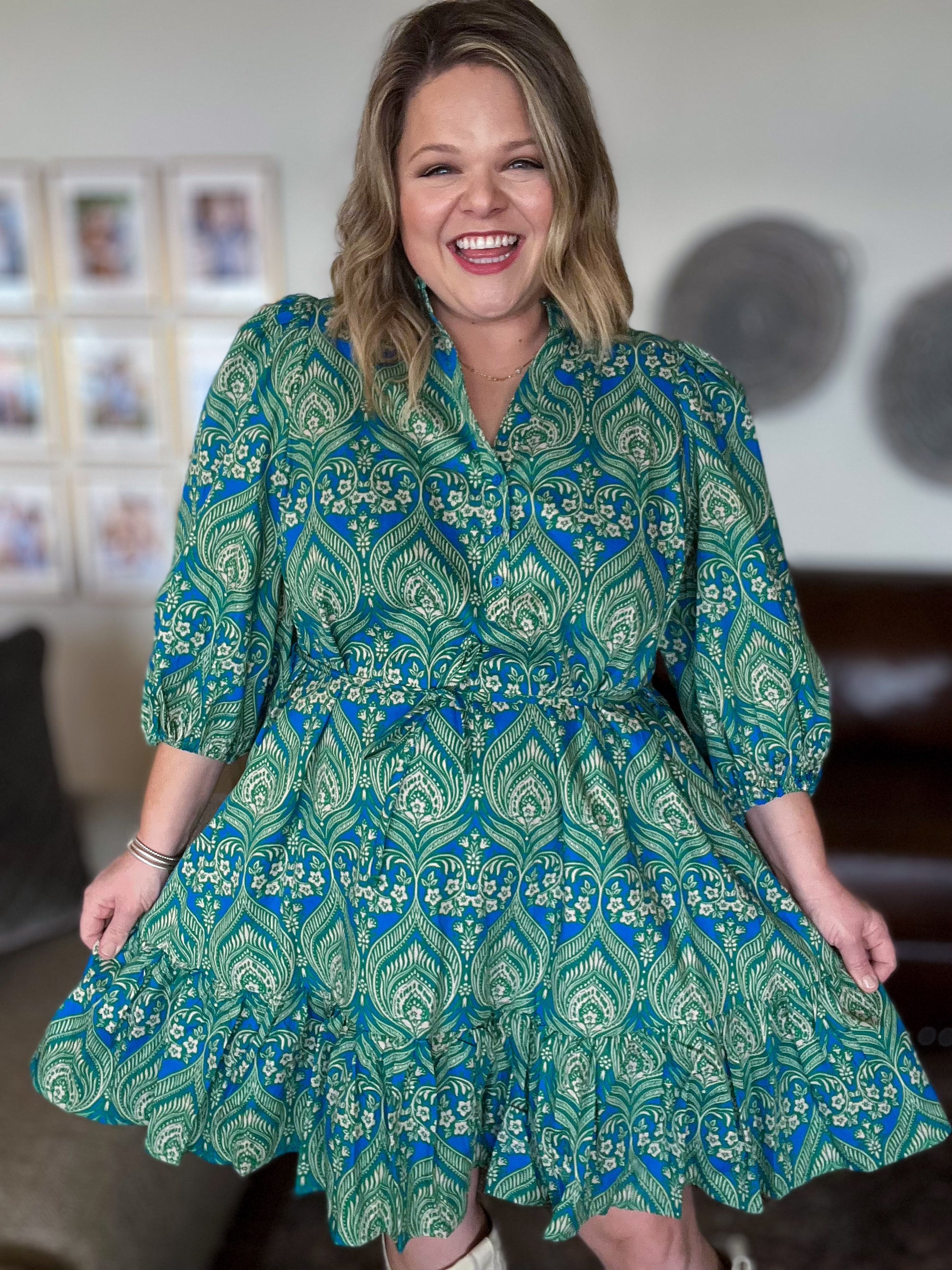 Springtime sass blooms in this Birds of a Feather Plus-Size Paisley Mini Dress. This button down mini features a split neck with button details to the waist, an optional, thin tie at waist, pockets and 3/4 ballon sleeves. Pair it with sandals and a woven bag for daytime charm, or heels and statement earrings for an elevated event.
