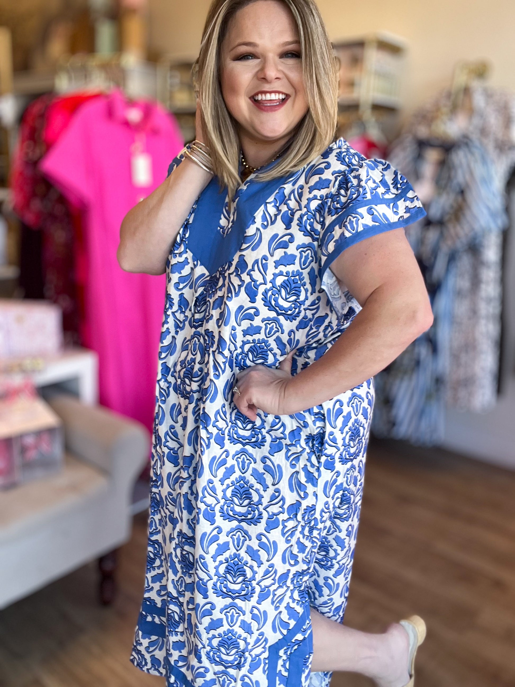 Make a BOLD statement in this two-tone blue midi dress that celebrates curves in style and comfort! The split V-neck features a striking contrast panel that draws the eye, while flutter sleeves add a playful touch of movement. Cut in a relaxed, flowy silhouette that skims (and slims!) the body beautifully, this unlined dress is perfect for those who refuse to play it safe. Perfect for springtime, from Easter Sunday to chasing students around in the classroom to breezy strolls shopping downtown. The possibilities are truly endless!