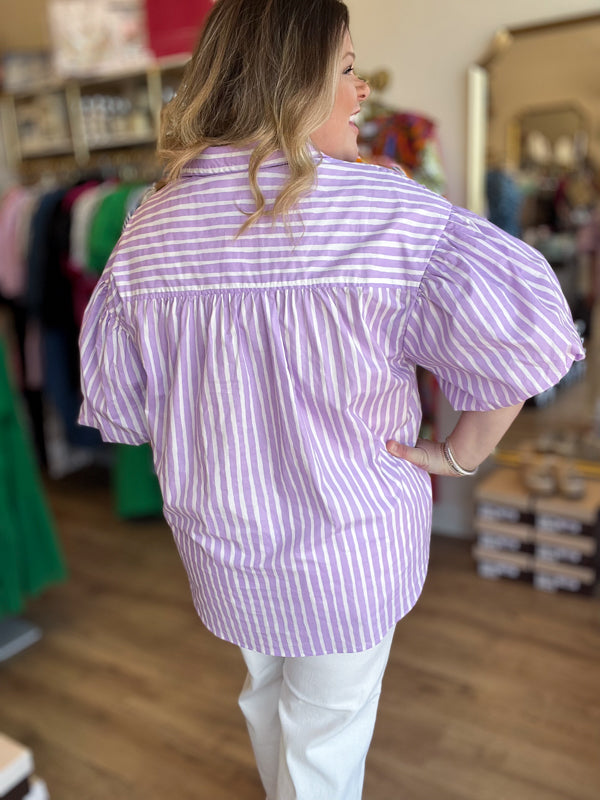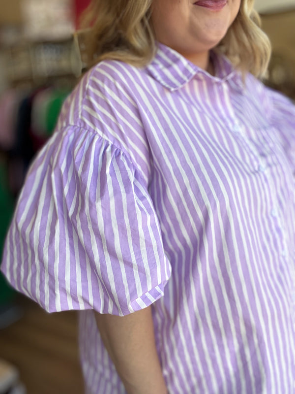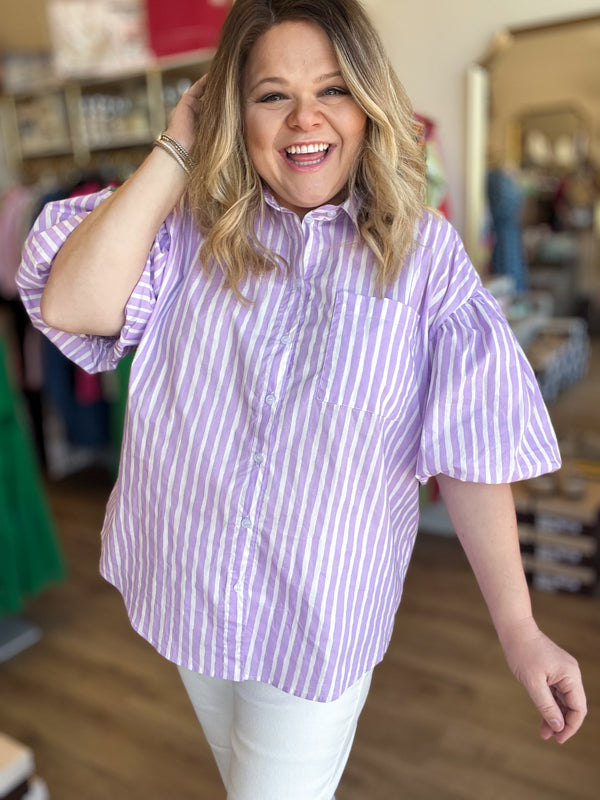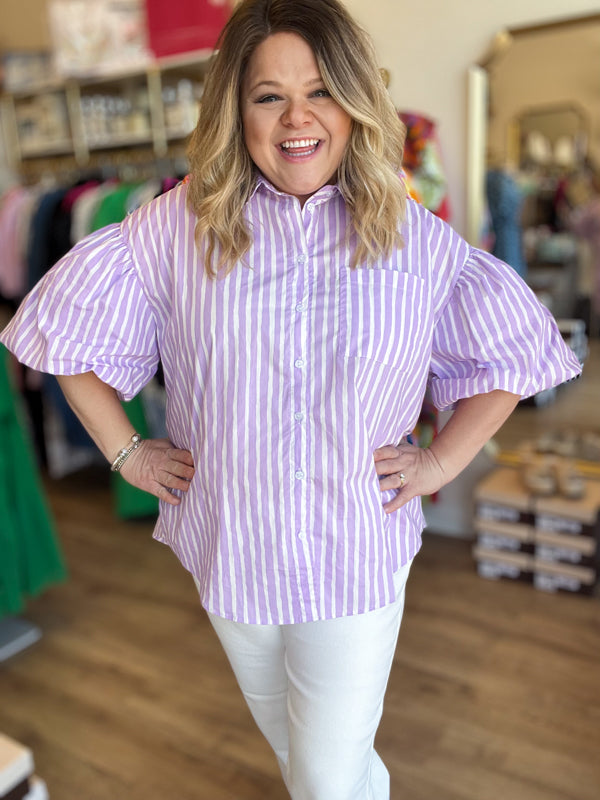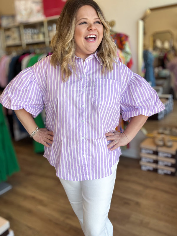Get ready to be "Classy + Sassy" in this chic striped plus-size lavender top! This stylish poplin button down shirt will keep you looking sharp and put together, while the bubble sleeves add a playful touch. Perfect for any occasion, this top is a must-have for any fashion-forward plus-size woman. We love this look with white or dark denim for a sassy daytime look!