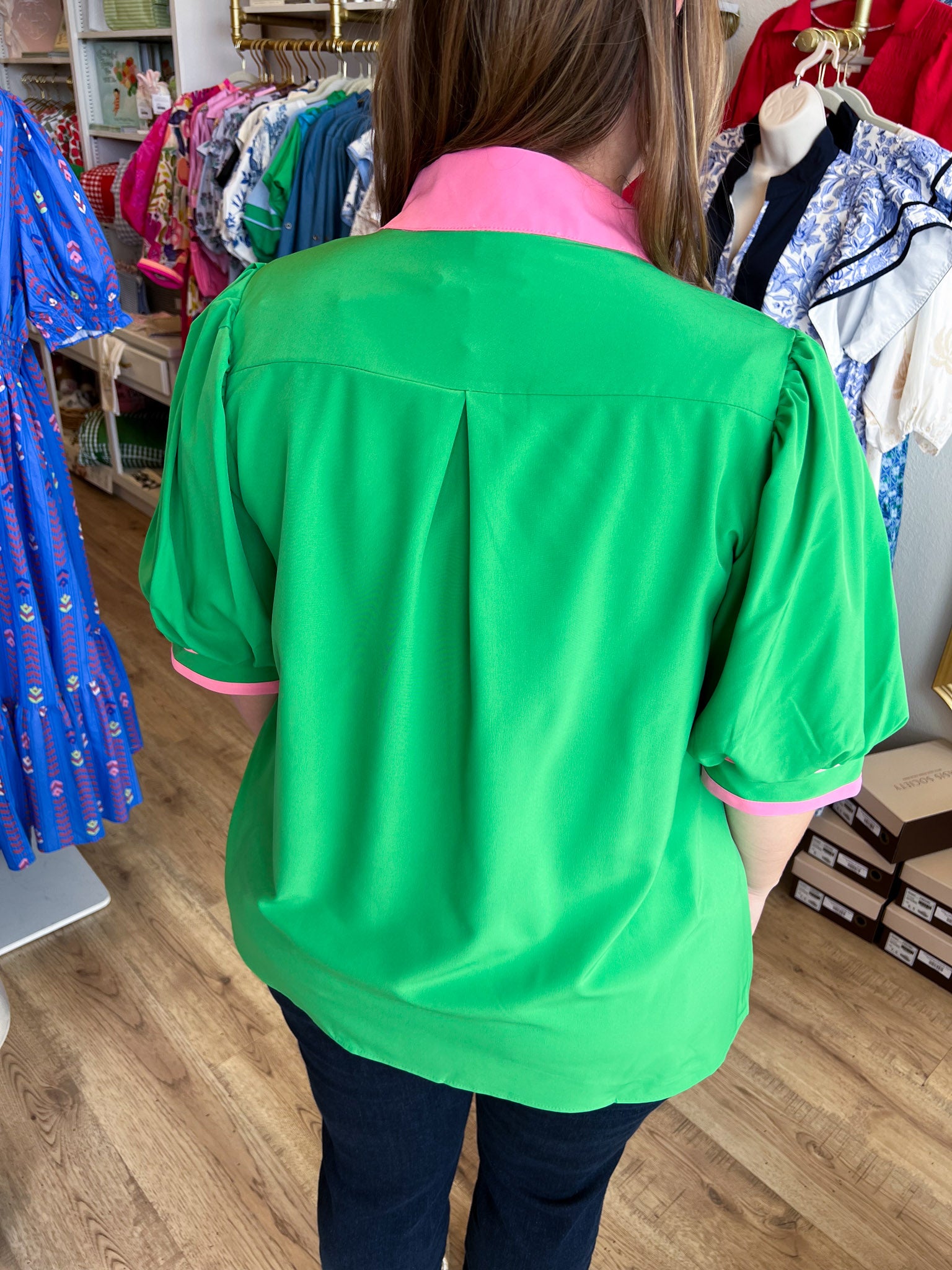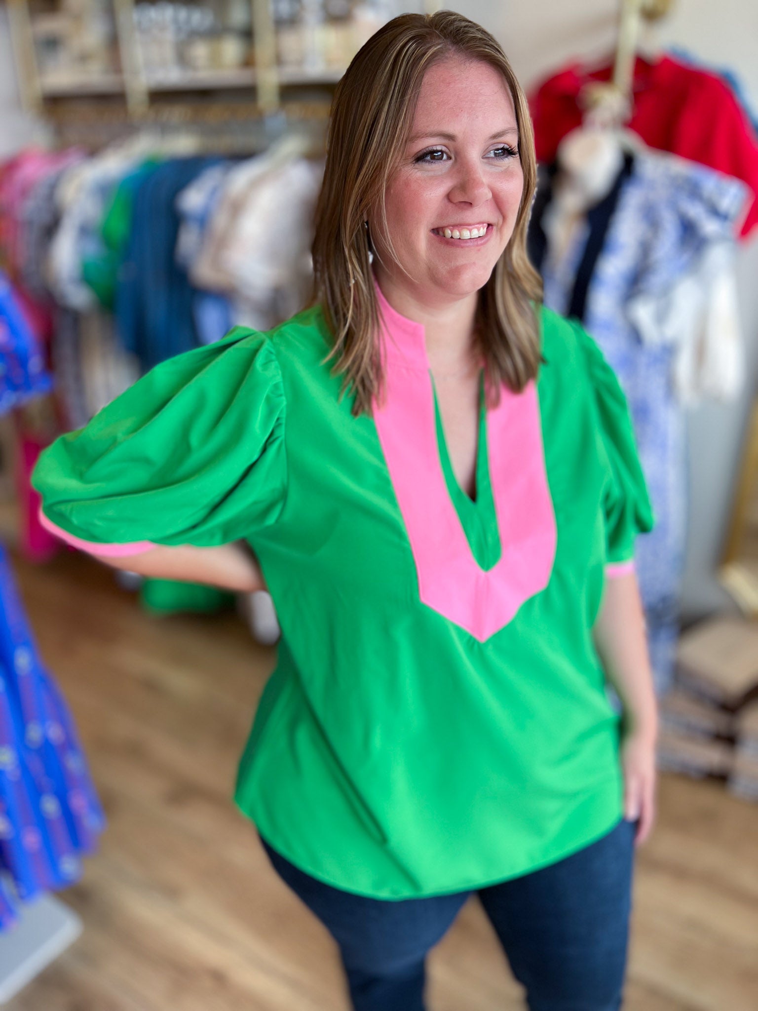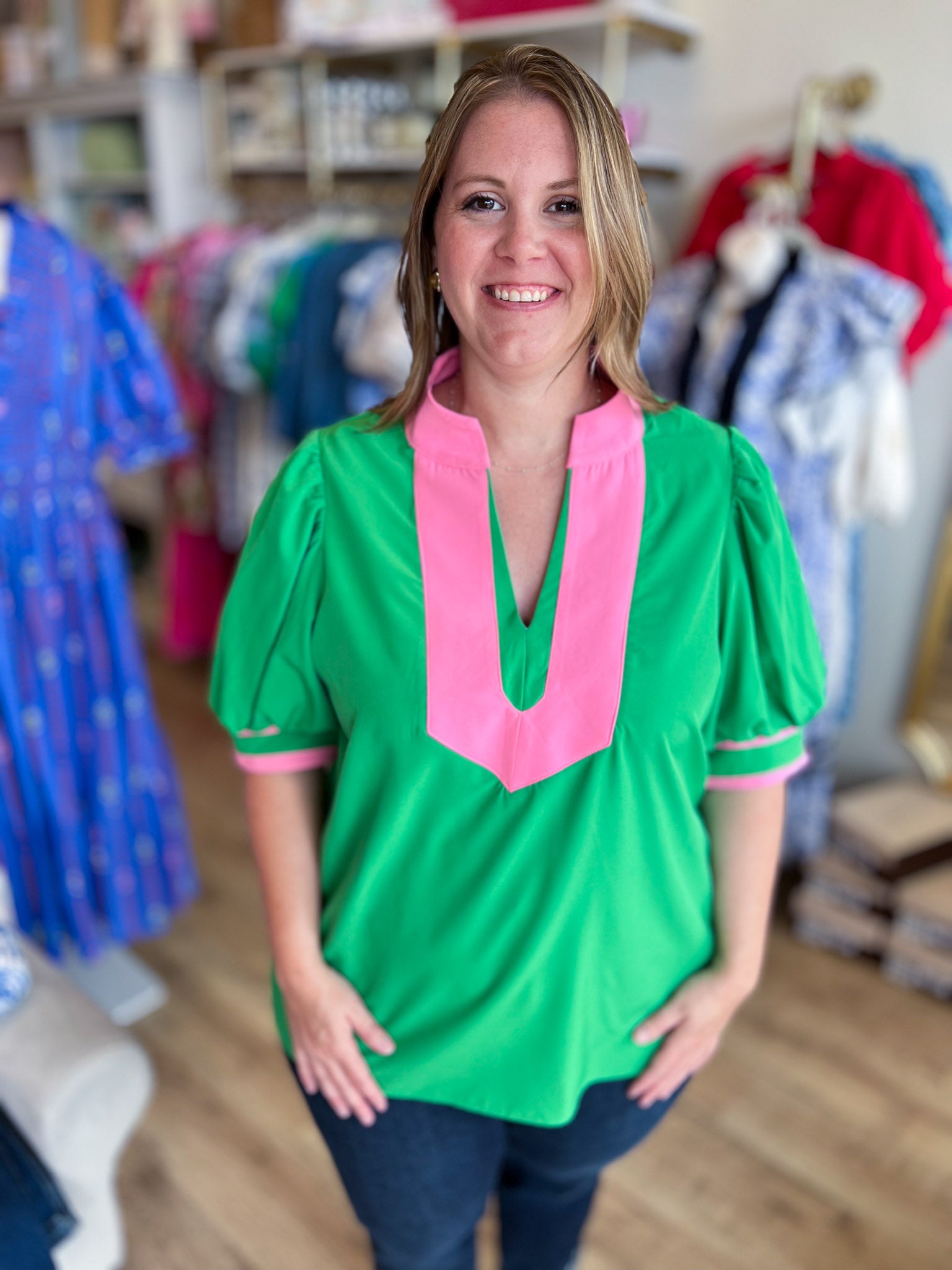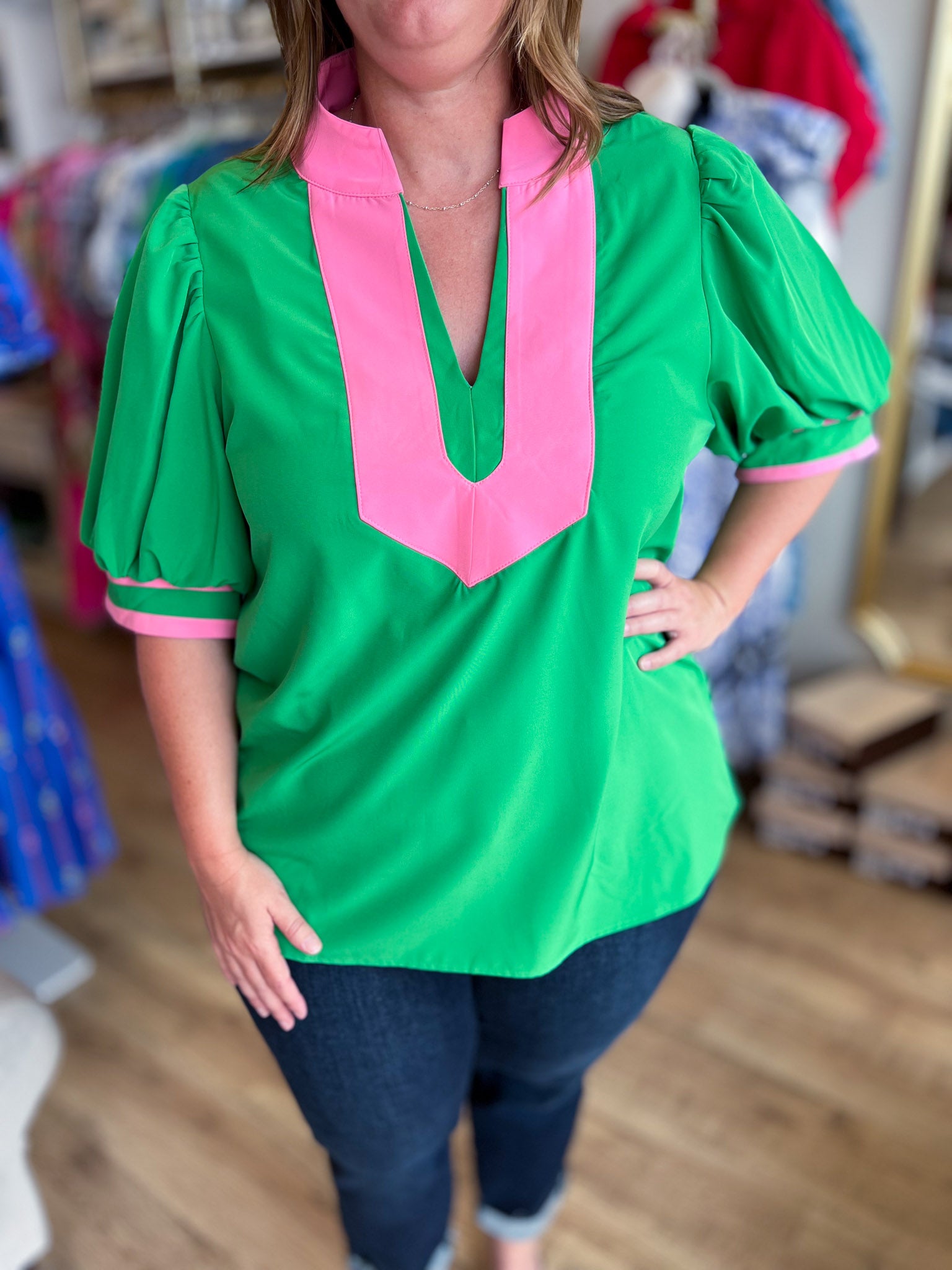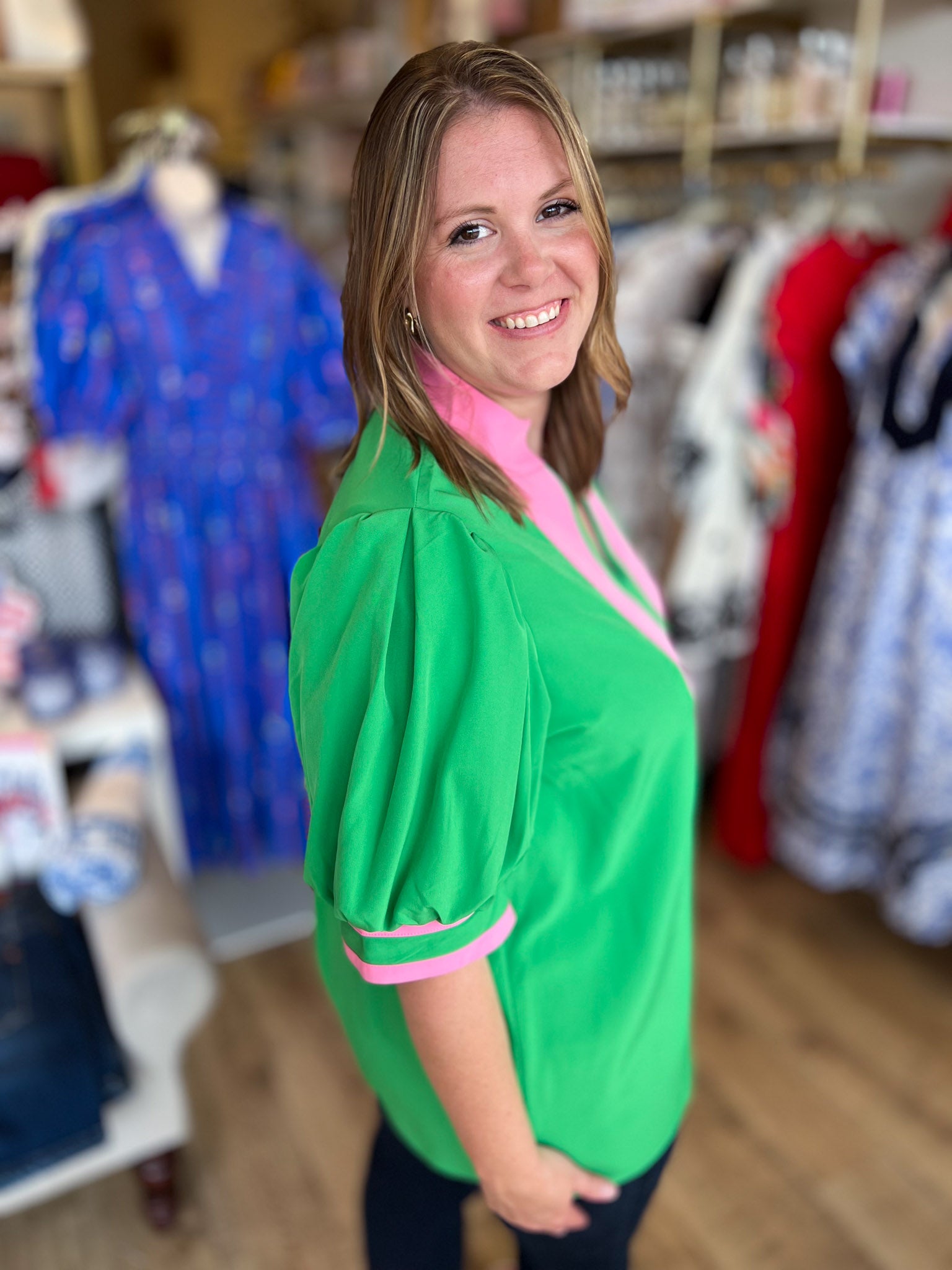 Rock this striking Curvy Green Top with Bright Pink Trim for a bold and beautiful look that is both bold and timeless. Its caftan-inspired, high neck band and voluminous puff sleeves make for a unique and eye-catching style while the unlined, non-sheer, lightweight fabric ensures comfort and breathability. Add a touch of chic to your Summer style with this must-have piece! Pairs beautifully with white pants for a preppy and polished daytime look or dark denim for a casual day out.