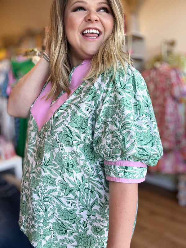 "Gardens of Grace" Curvy Green Floral Top with Pink Trim