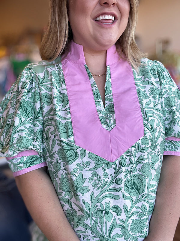 Rock this playful Curvy Green Floral Top with Pink Trim for a fun and flirty look that is both elegant and timeless. Its caftan-inspired, high neck band and voluminous puff sleeves make for a unique and eye-catching style while the unlined, non0sheer, lightweight fabric ensures comfort and breathability. Add a touch of femininity to your Summer style with this must-have piece! Pairs beautifully with white pants for a preppy and polished daytime look or dark denim for a casual day out.