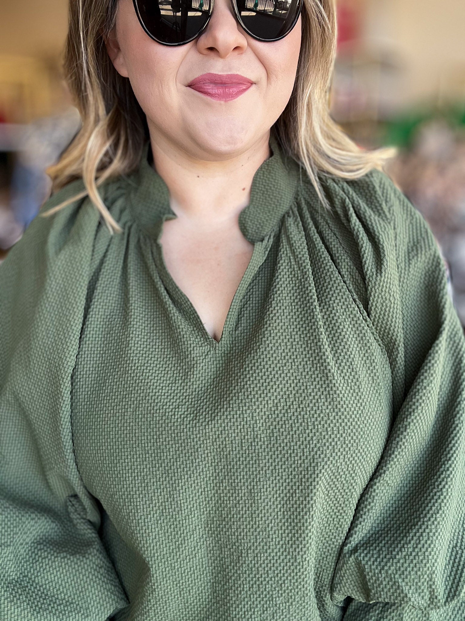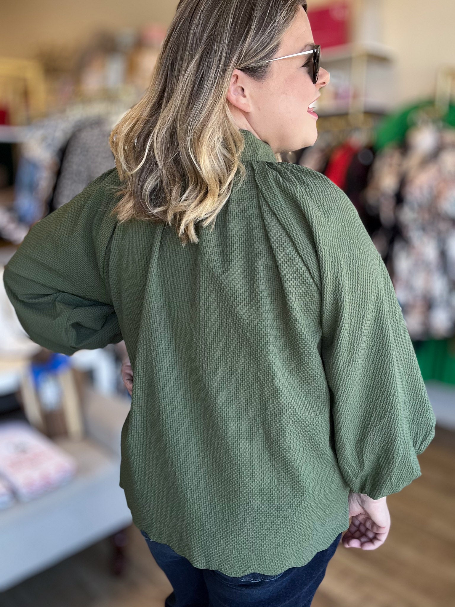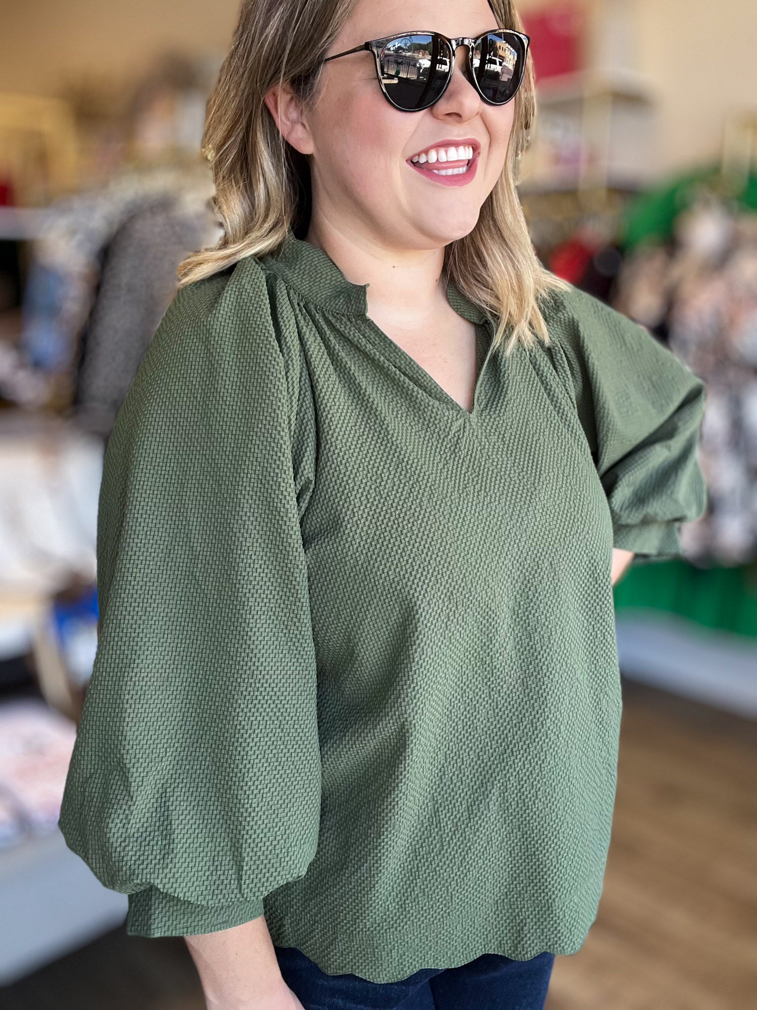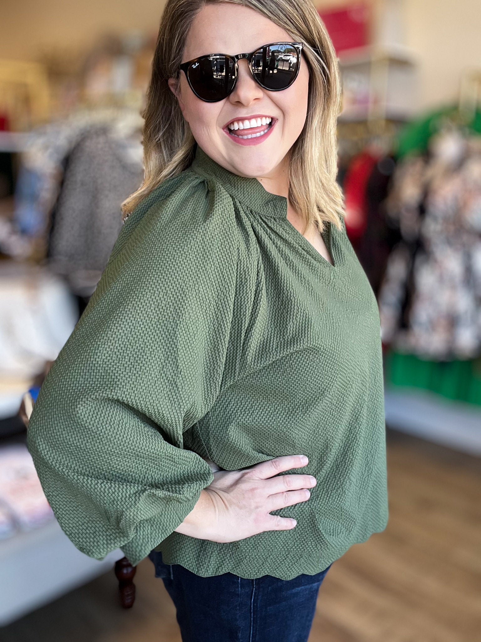 Wrap yourself in refinement with this beautiful olive scalloped blouse, now available in curvy sizes XL-2X! Its earthy green shade with textured fabric is adorned with delicate scalloped details along the split neckline and hem. The playful 3/4 balloon sleeves add just the right touch of flair while highlighting a feminine, classy silhouette—perfect for year-round wear. This top is a class act!