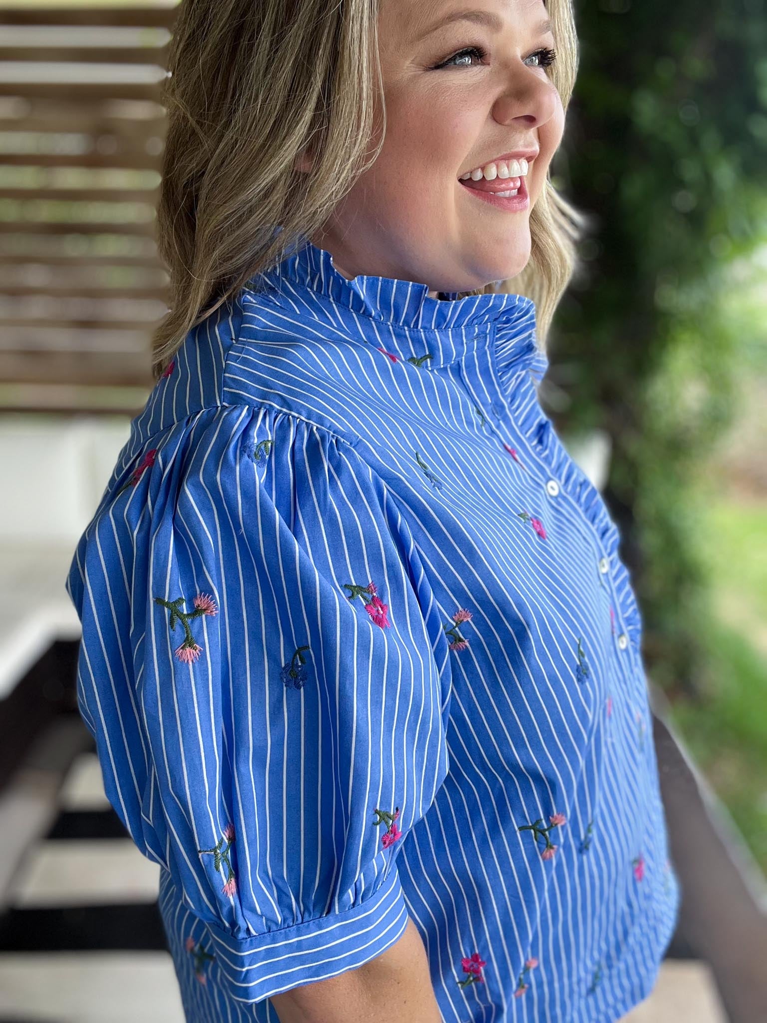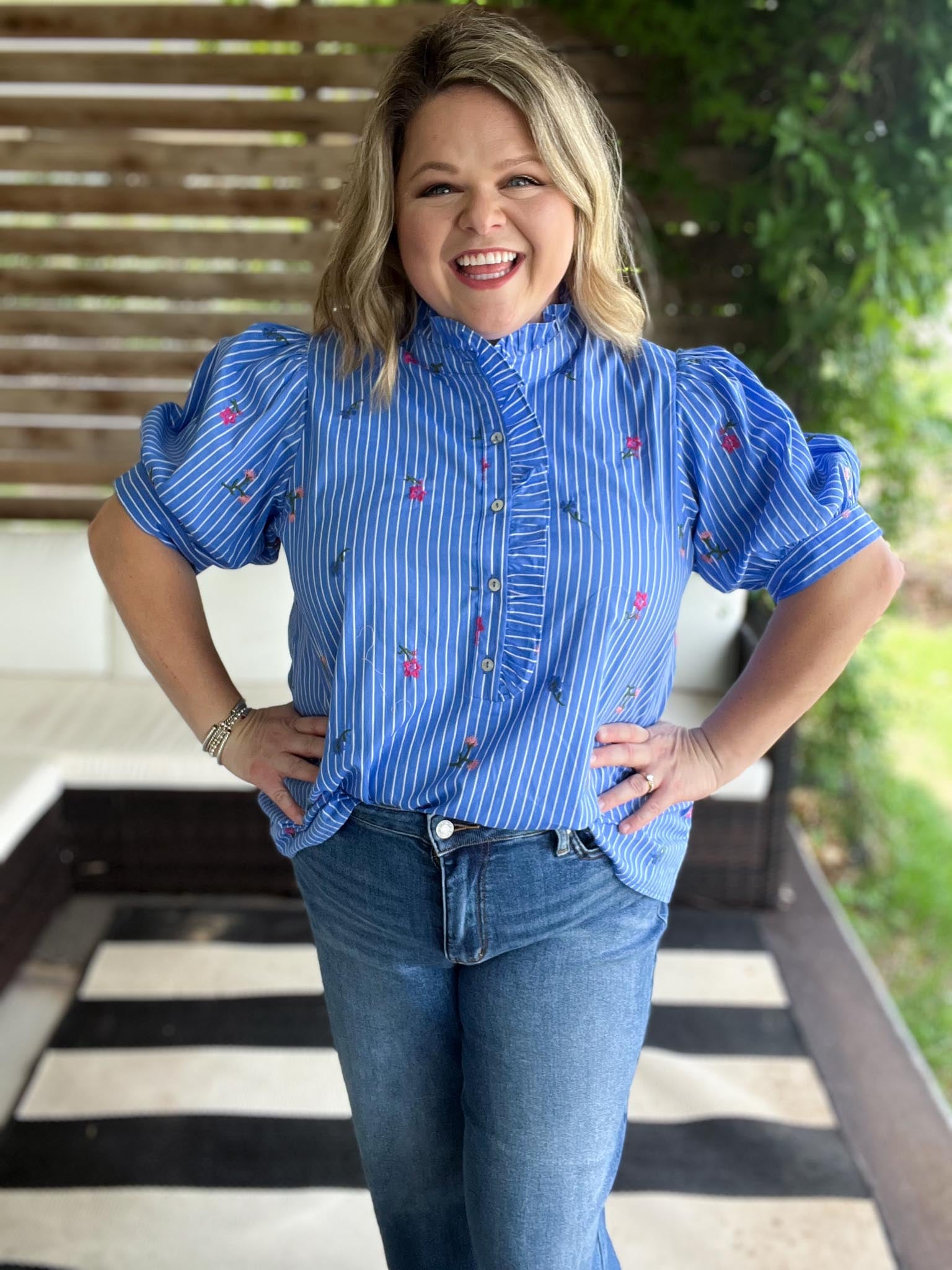 Dancing Dahlias Curvy Blue Stripe Ruffle Top