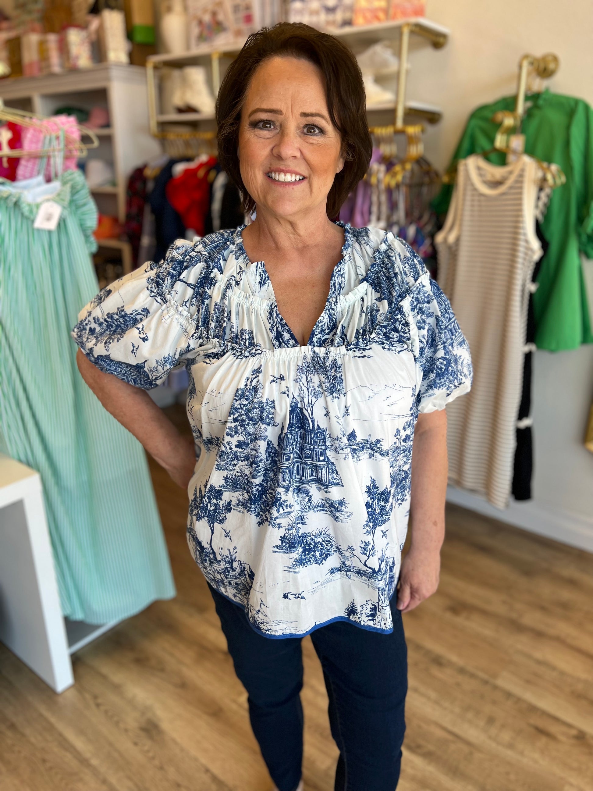 Our best selling print is back! The "Days of Yore" Curvy Blue Toile Top is the perfect blend of timeless elegance and modern flair. Made with a delicate toile pattern in a classic blue and white color scheme, this flowy v-neck top is lightweight and comfortable for all-day wear. Embrace the past without sacrificing style!