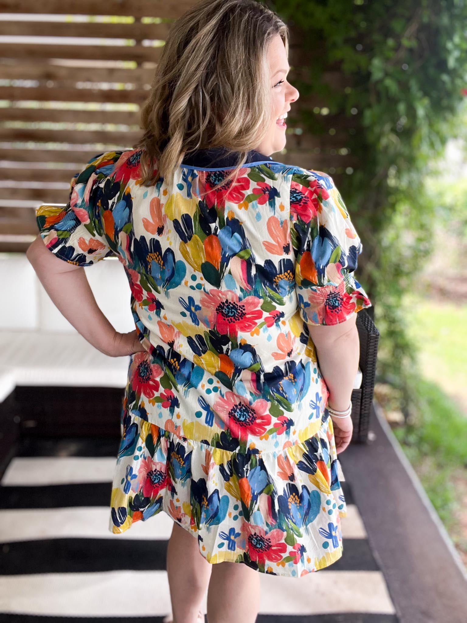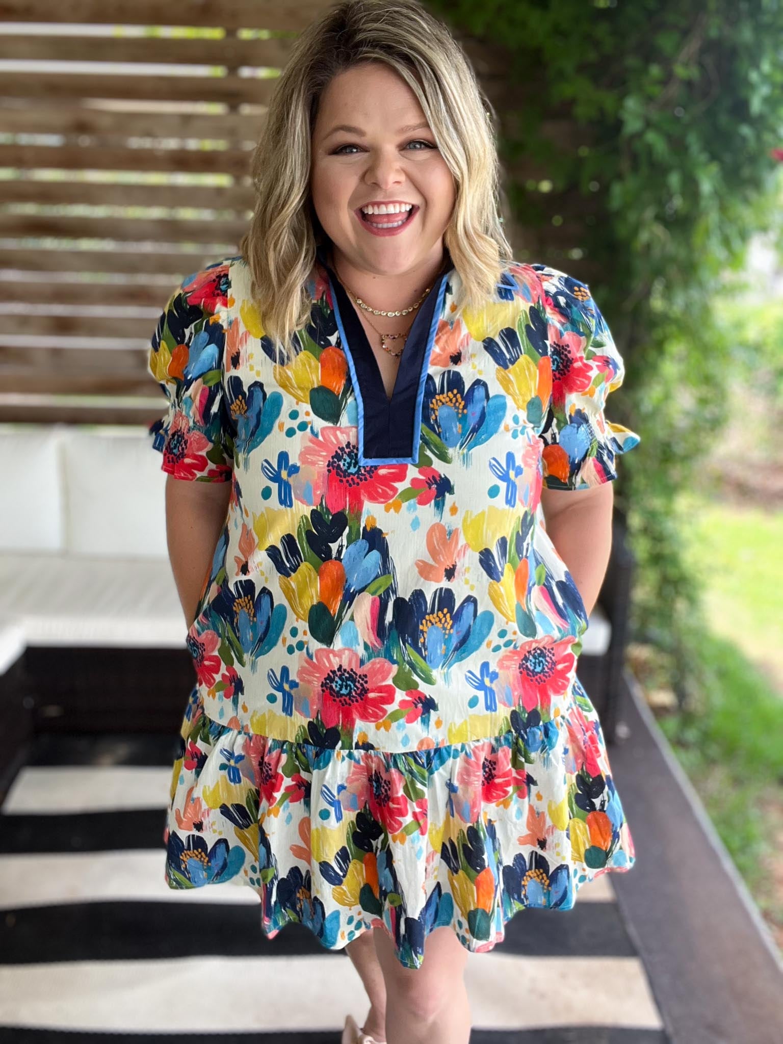 Fits true to size - runs generous! Features elastic armbands, contrast collar and trim, pockets at hips and a drop waist skirt. Material does not stretch. We recommend ordering your usual size or sizing up if between (especially if you are hippy as there is a seam across the hips) or need extra length. Beware tall girls, this dress runs shorter!