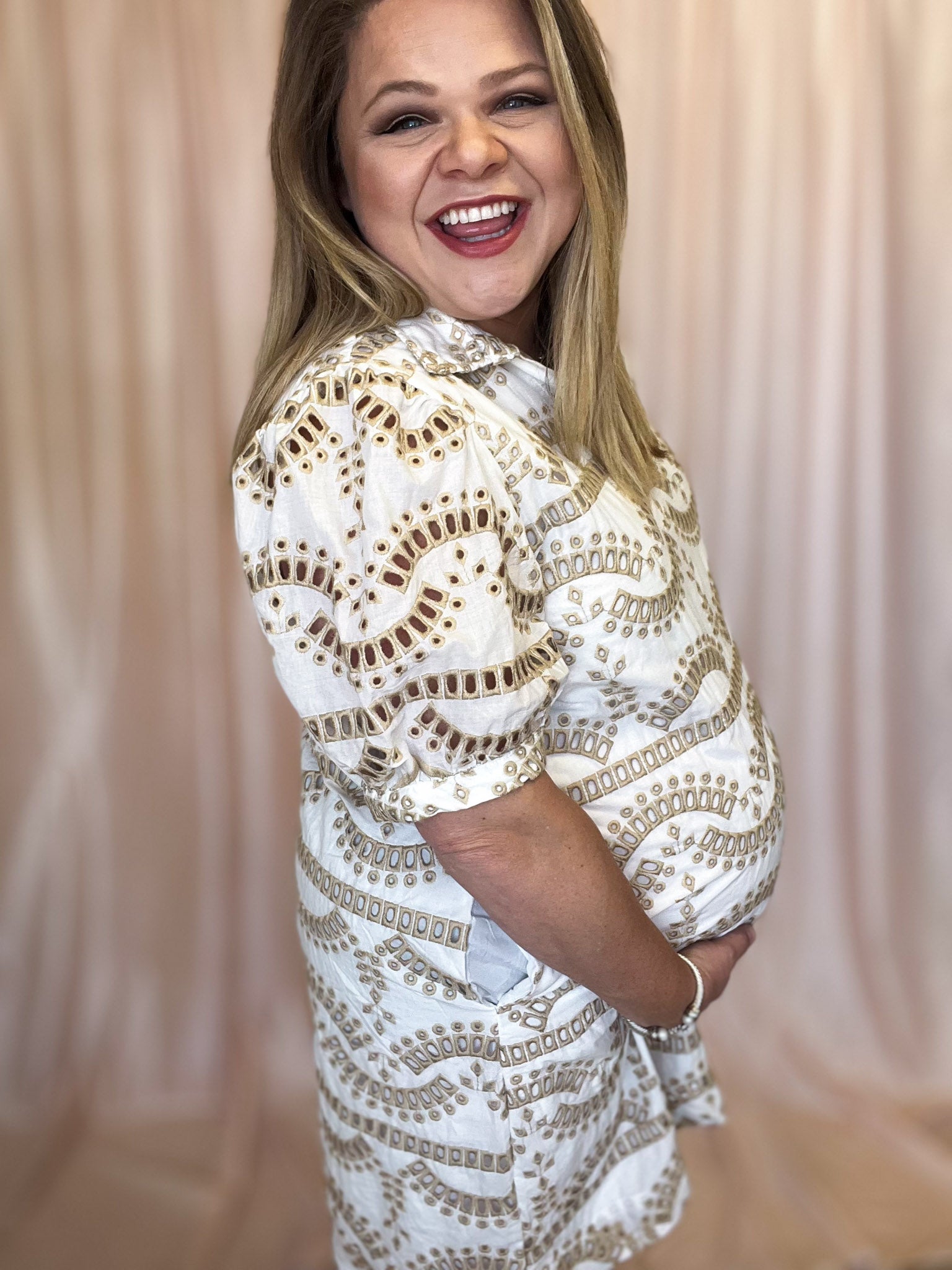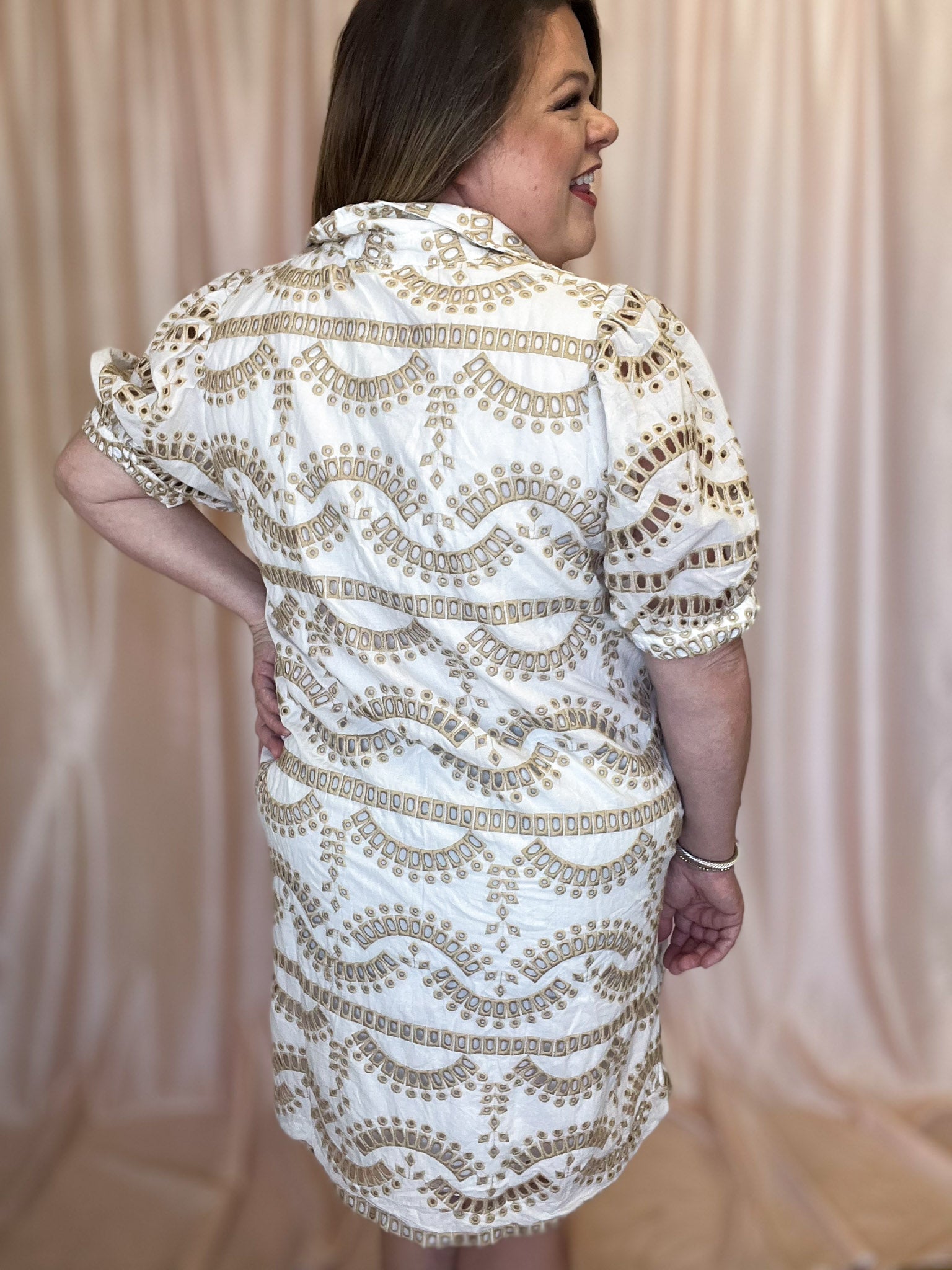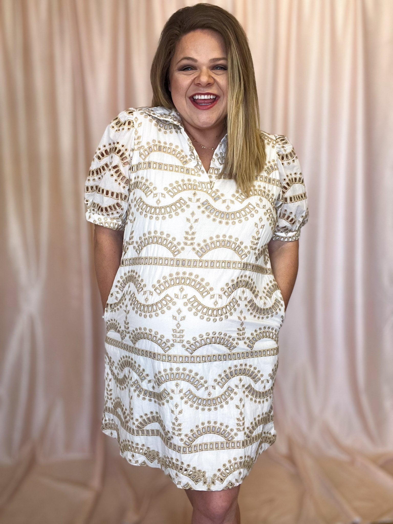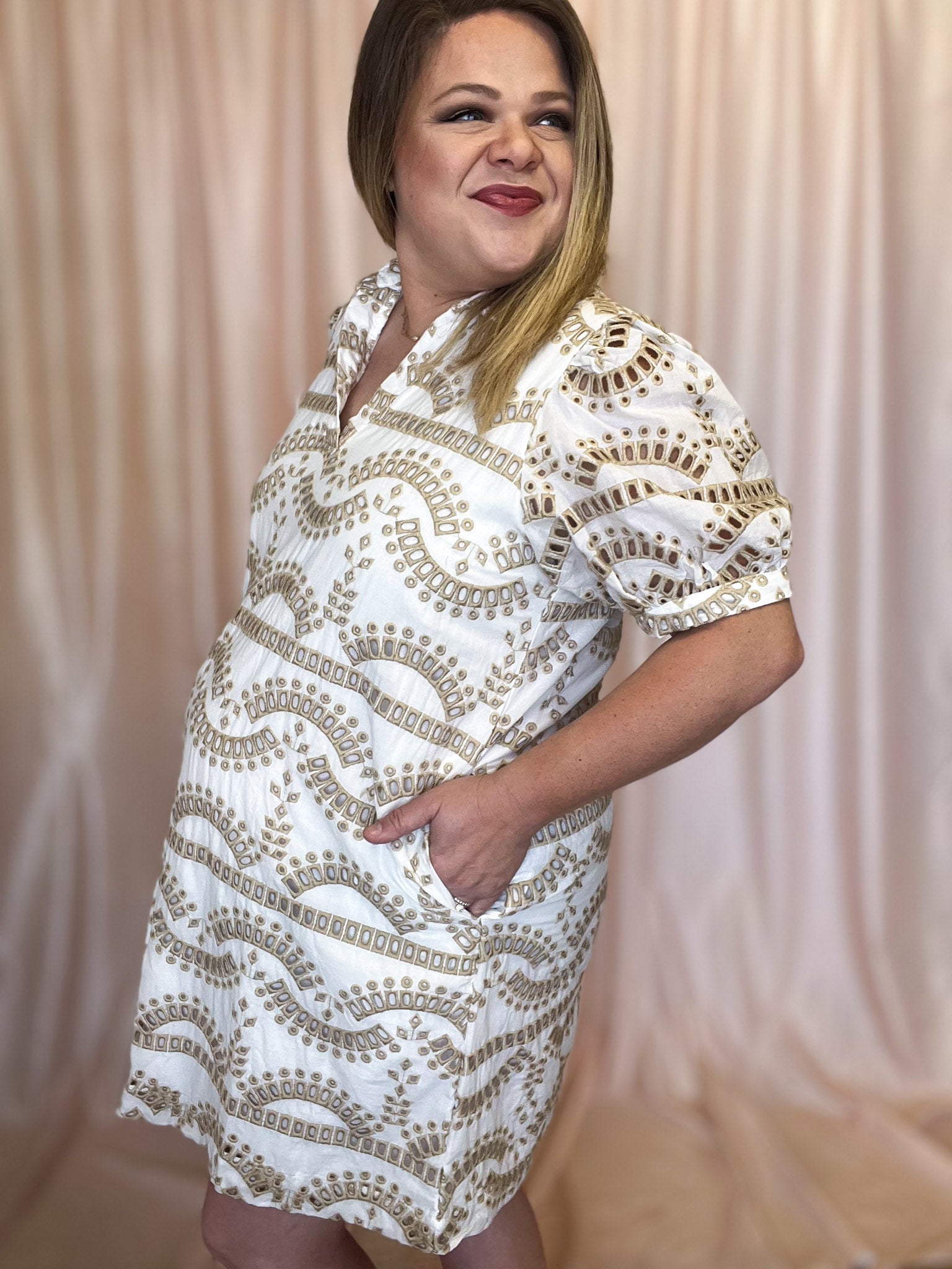 Our Down By the Bay Curvy White & Beige Eyelet Dress is perfect for curvy ladies looking for a unique twist on a white dress! This white geometric eyelet dress with beige accents is one-of-a-kind. Perfect for summer and so classy! Add a touch of breeziness to your wardrobe with this lightweight cotton dress that is lined through the bodice and features a flattering v-neck with a preppy collar and unlined sleeves for an added wow-factor. Plus, who doesn't love a dress with pockets? Tailored to perfection!