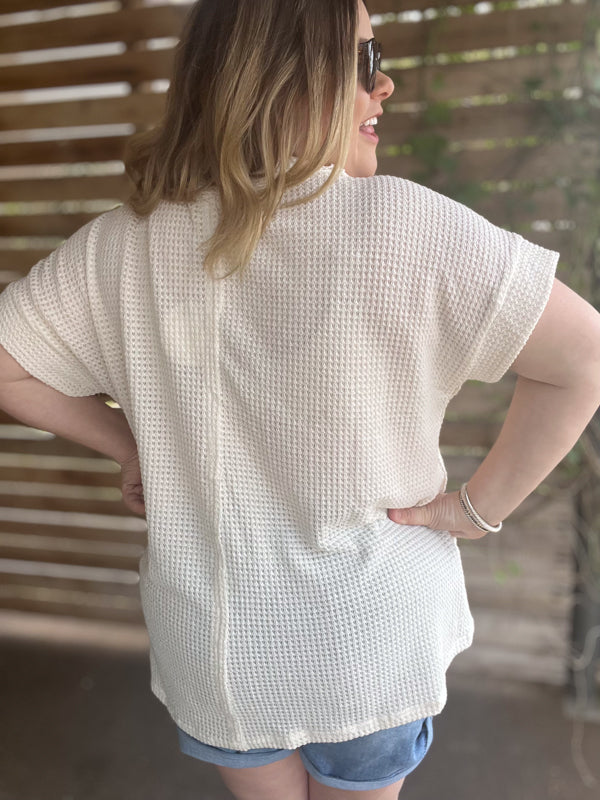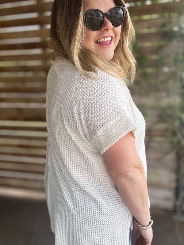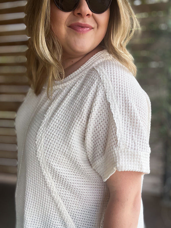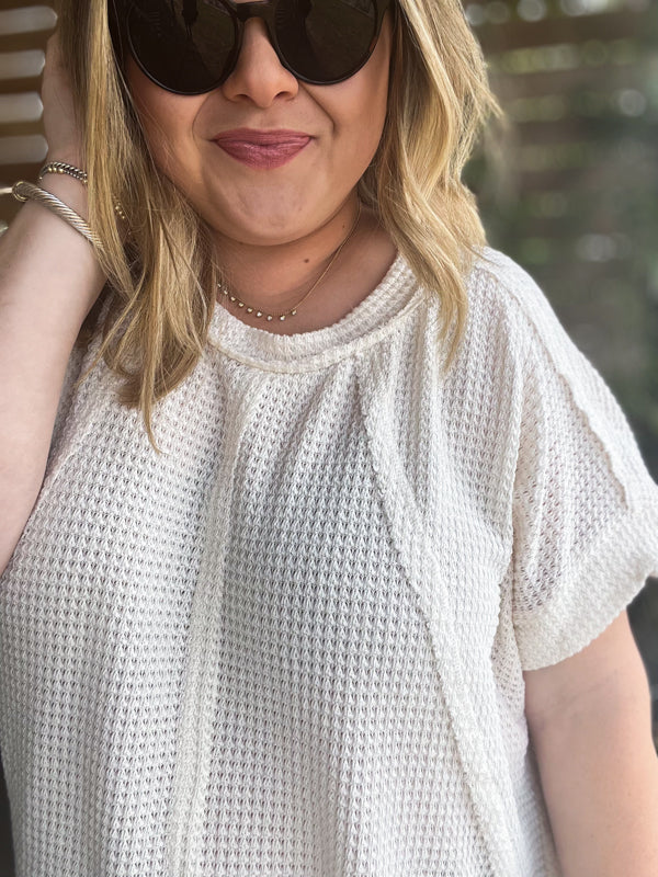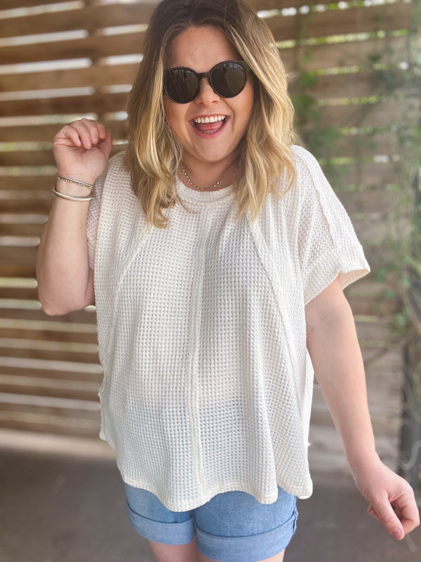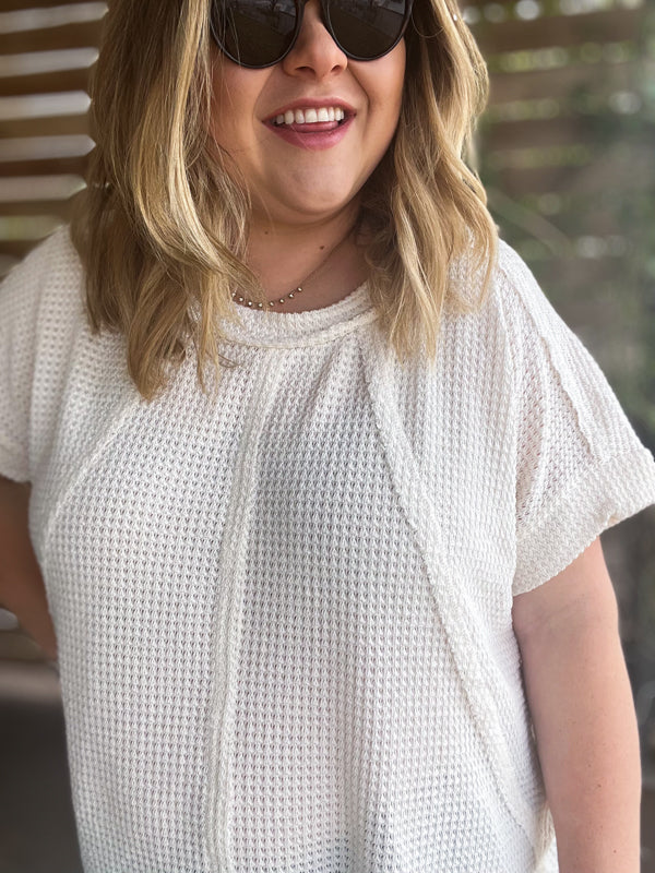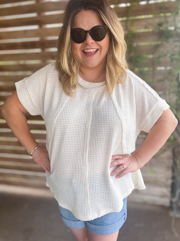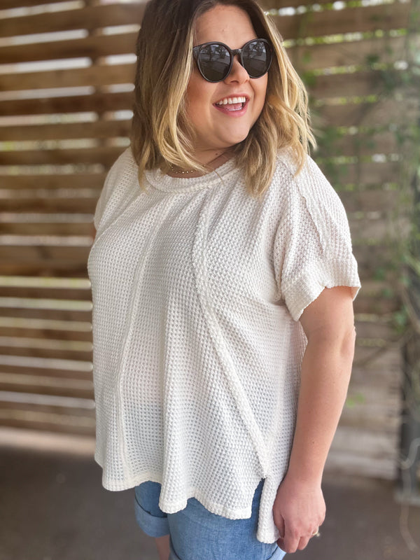 Stay comfortable and stylish all year round with our "Easy & Breezy" Curvy Waffle Knit Top! This lightweight and soft top features a waffle knit pattern and rough cut seams for a unique and casual touch. Perfect for everyday wear, this cream-colored top will have you feeling relaxed and looking great. We love this look paired with denim shorts and sneakers for a summer-ready everyday look or denim jeans and cute sandals to dress it up a touch!