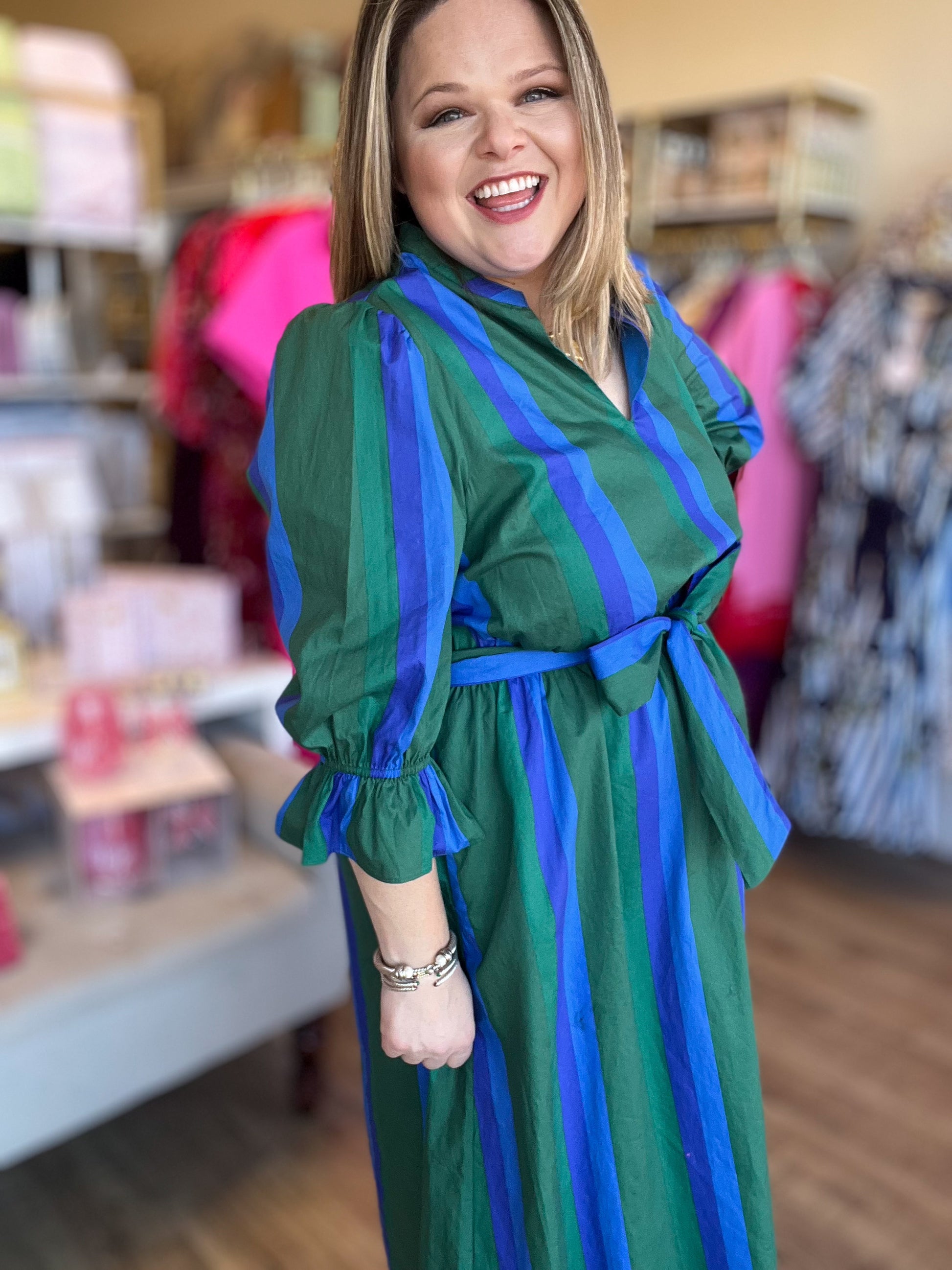 Make a statement in this stunning dress that's as fun as it is functional. The eye-catching striped color block design in rich emerald blues pairs beautifully with a chic split neckline and ruffled 3/4 sleeves for that effortless elegance you're after. Cinch it with the coordinating self waist belt to define your shape, then slip your phone and keys into the hidden side pockets—because who doesn't love practical fashion? Dress it up with heels, booties or keep it casual with wedges; this versatile piece is your new go-to for any occasion!