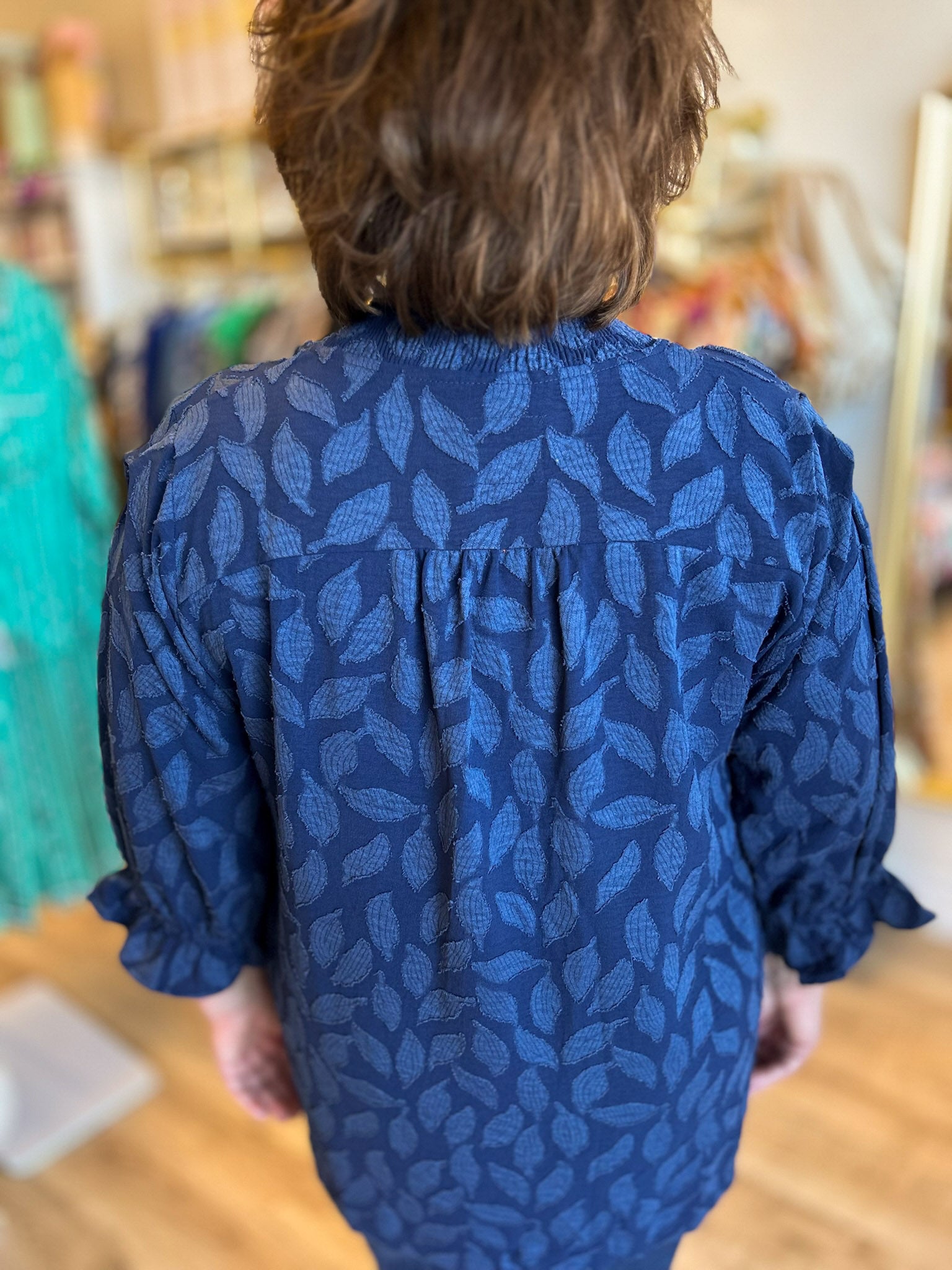 Make a statement with this navy jacquard top that brings botanical beauty to your everyday wardrobe. The eye-catching floral pattern is complemented by a chic V-neck with ruched detailing that adds texture and visual interest. Quarter-length sleeves offer the perfect amount of coverage while keeping things breezy, and the relaxed fit ensures you can move with ease. Unlined for ultimate comfort without compromise—style that feels as good as it looks!