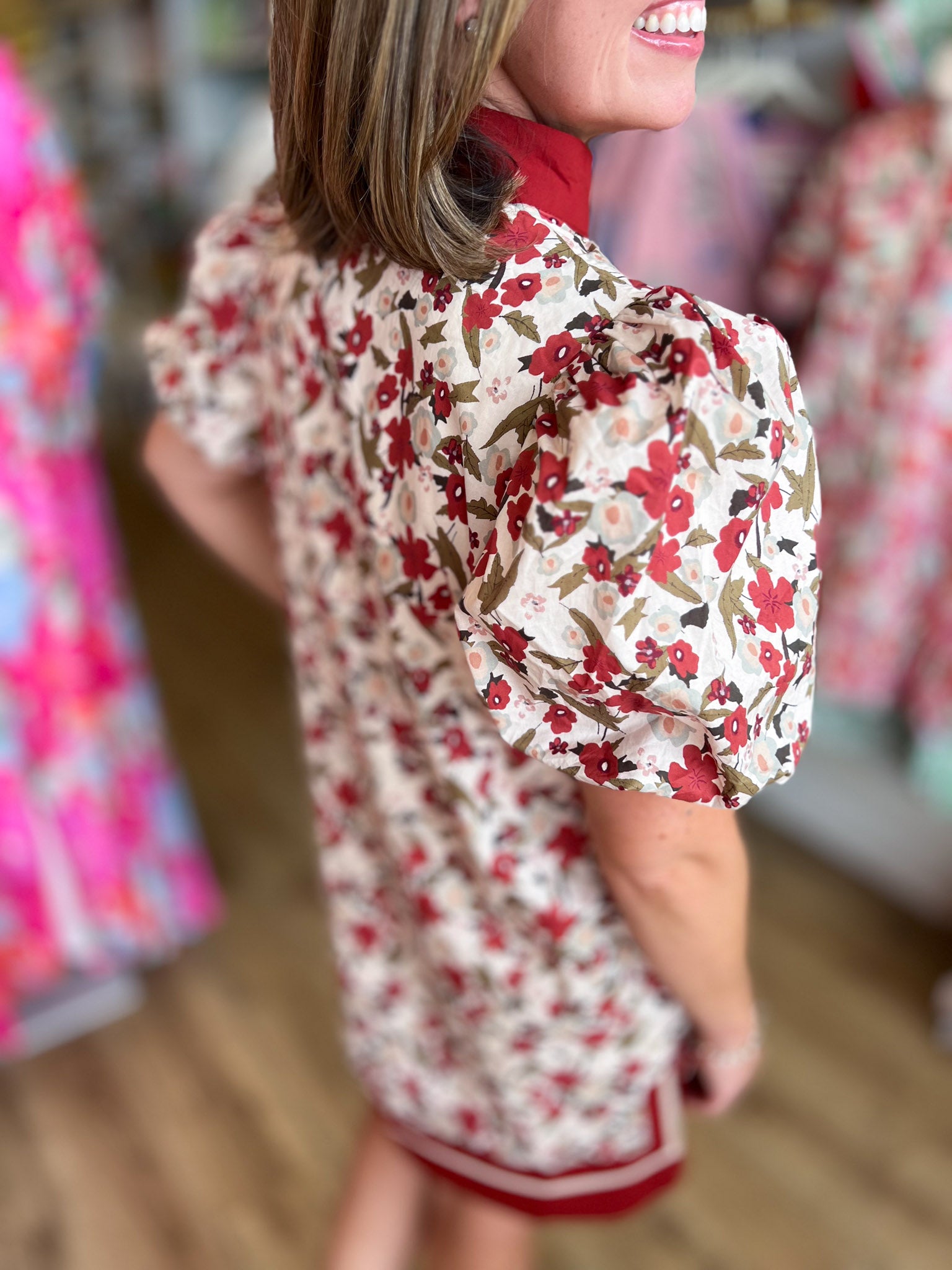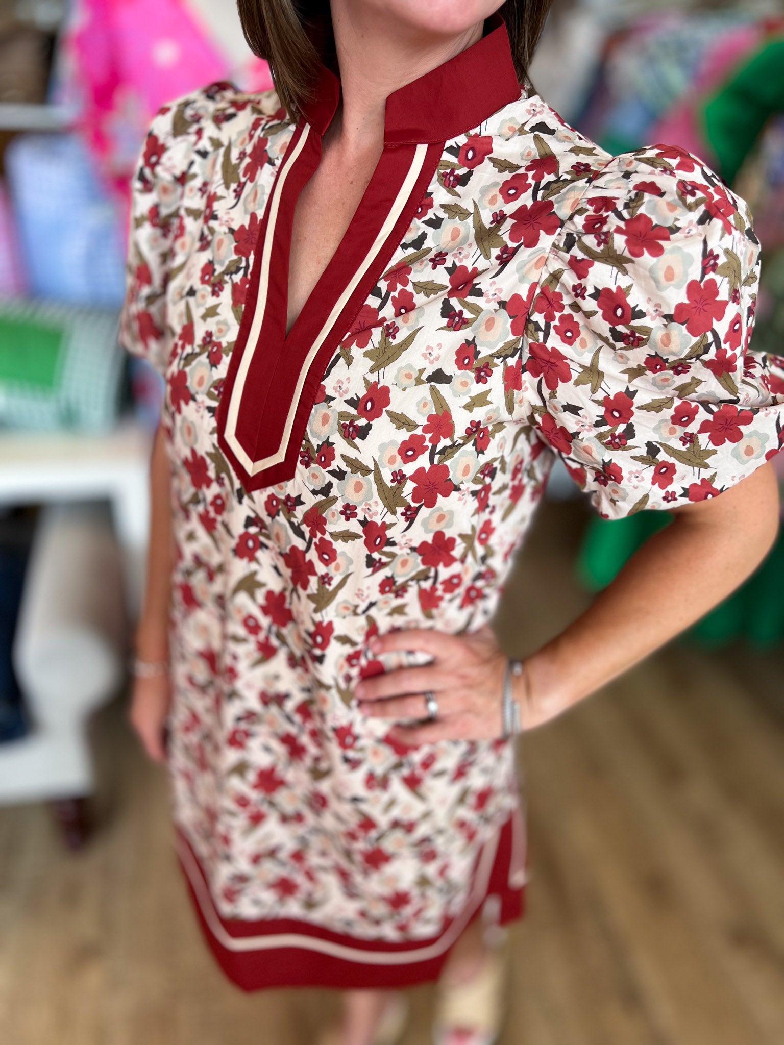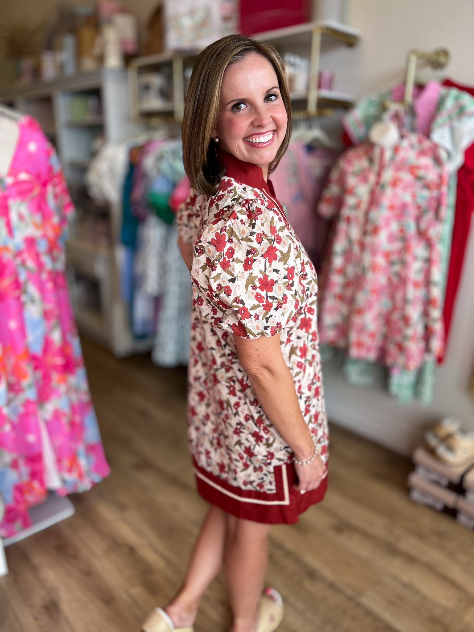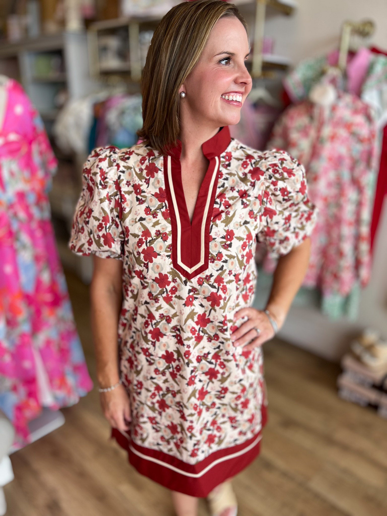Channel your inner class with this modern, floral take on a classic look. The Falling for Florals Rust Contrast Trim Dress features a gorgeous fall floral pattern with a rust contrast, v-neckline, and puff sleeves for a trendy look with a sophisticated touch. The slimming silhouette and convenient pockets make this dress both stylish and functional. Perfect for autumn lovers looking to add a touch of elegance to their wardrobe. Don't wait - this dress won't last long!