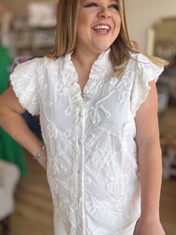 Be the epitome of Summer chic with this "French Vanilla" top, a floral appliqué bubble flutter sleeve piece with a ruffle accented V-neck button front closure! Stay cool and comfortable in 100% cotton with this soft, lightweight fabric and lined design. Playful and stylish, this top is perfect for any occasion!