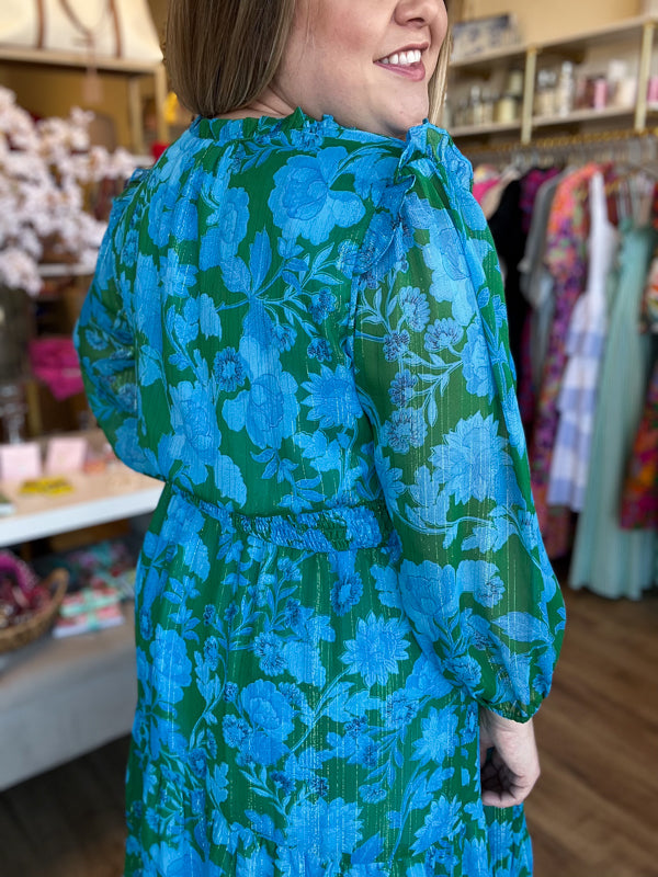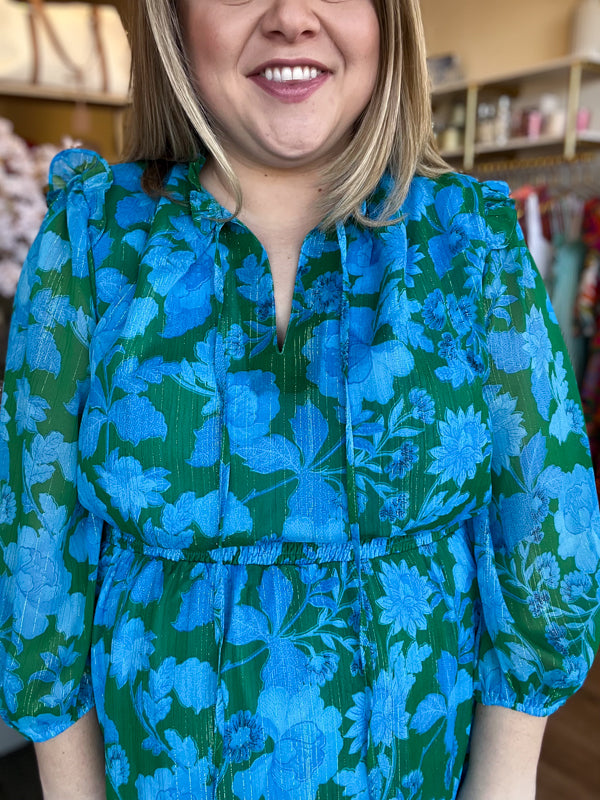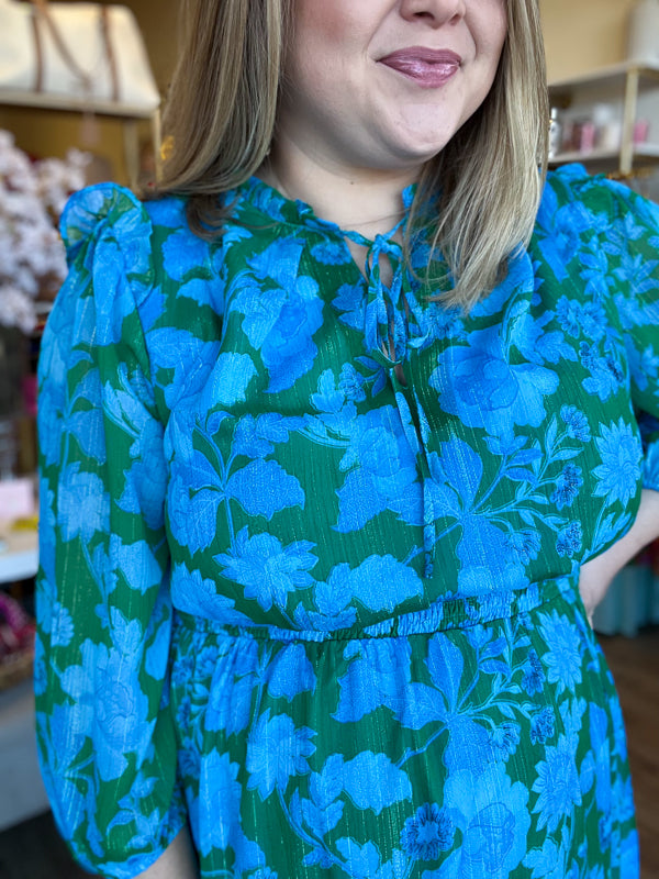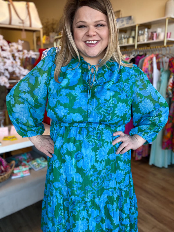 Be the belle of the ball in our "Gardenia Glamour" Plus-Size Metallic Stitch Midi Dress! Featuring on-trend hues of cerulean blue and kelly green in a fun and colorful floral print design, this sweet and southern dress features the most stunning silhouette, a beautiful metallic stitch detail, split neckline with tie detail, tiered skirt, and 3/4 sheer balloon sleeves. An 2" elastic waistband accentuates your figure and creates a bubble illusion to showcase and flatter your figure. Complete the look with a pair of feminine, strappy heels and you are ready for any semi-formal or cocktail attire occasion!