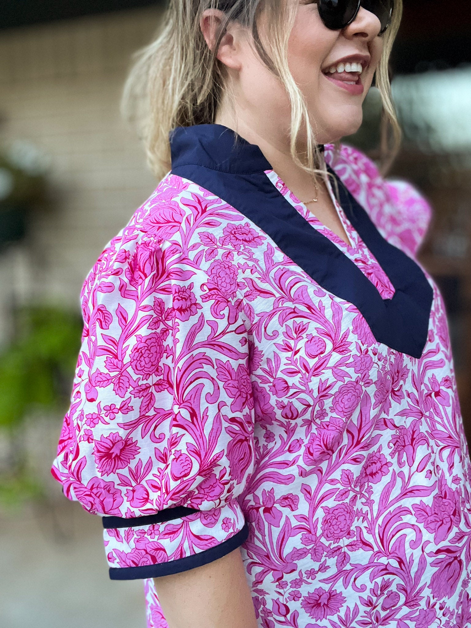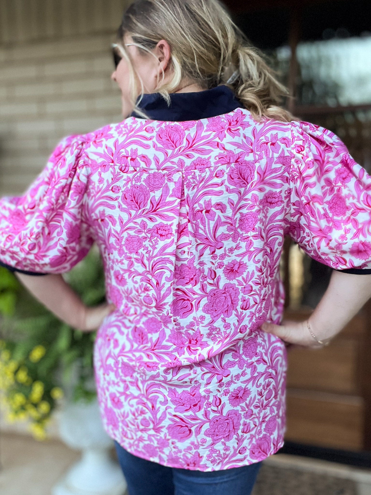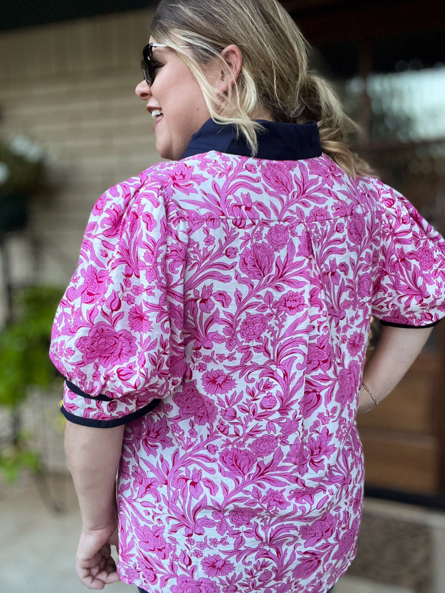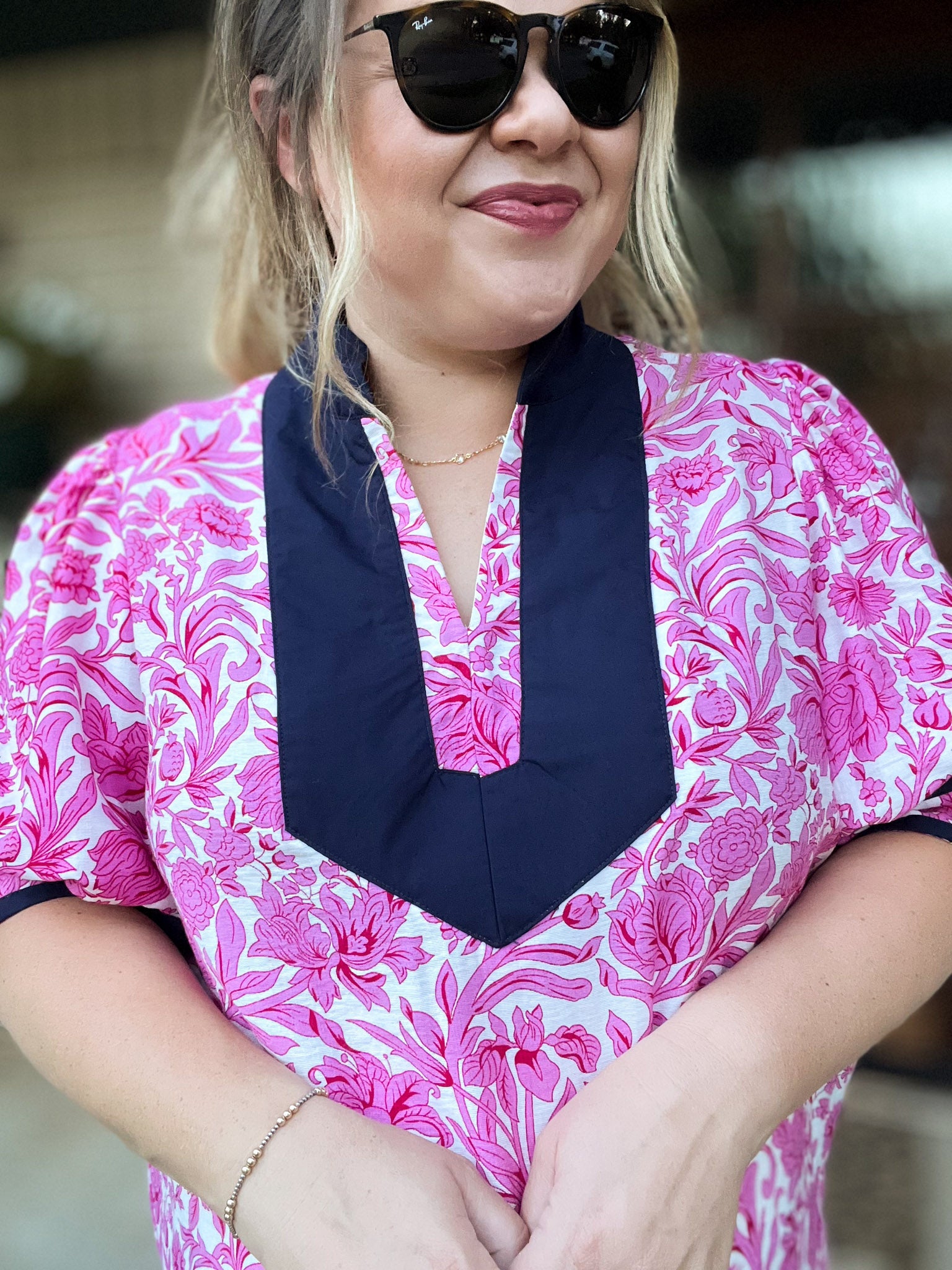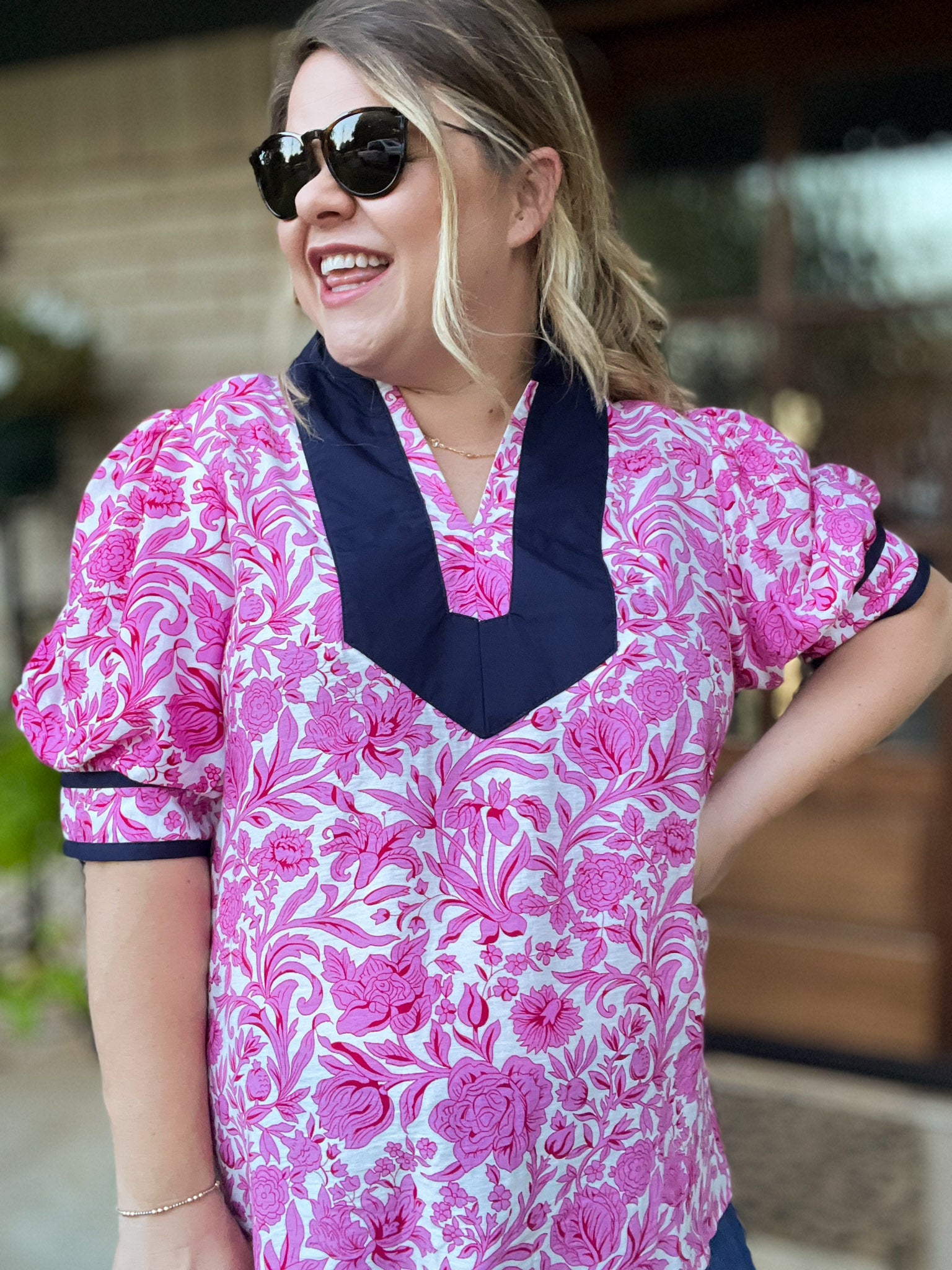 Rock this bold and beautiful Glow Your Own Way Curvy Pink Floral Top with Navy Trim for a fun and flirty look that is both colorful and confident. Its caftan-inspired, high neck band and voluminous puff sleeves make for a unique and eye-catching style while the unlined, non-sheer, lightweight fabric ensures comfort and breathability. Add a touch of femininity to your Summer style with this must-have piece! Pairs beautifully with white pants for a preppy and polished daytime look or dark denim for a casual day out.