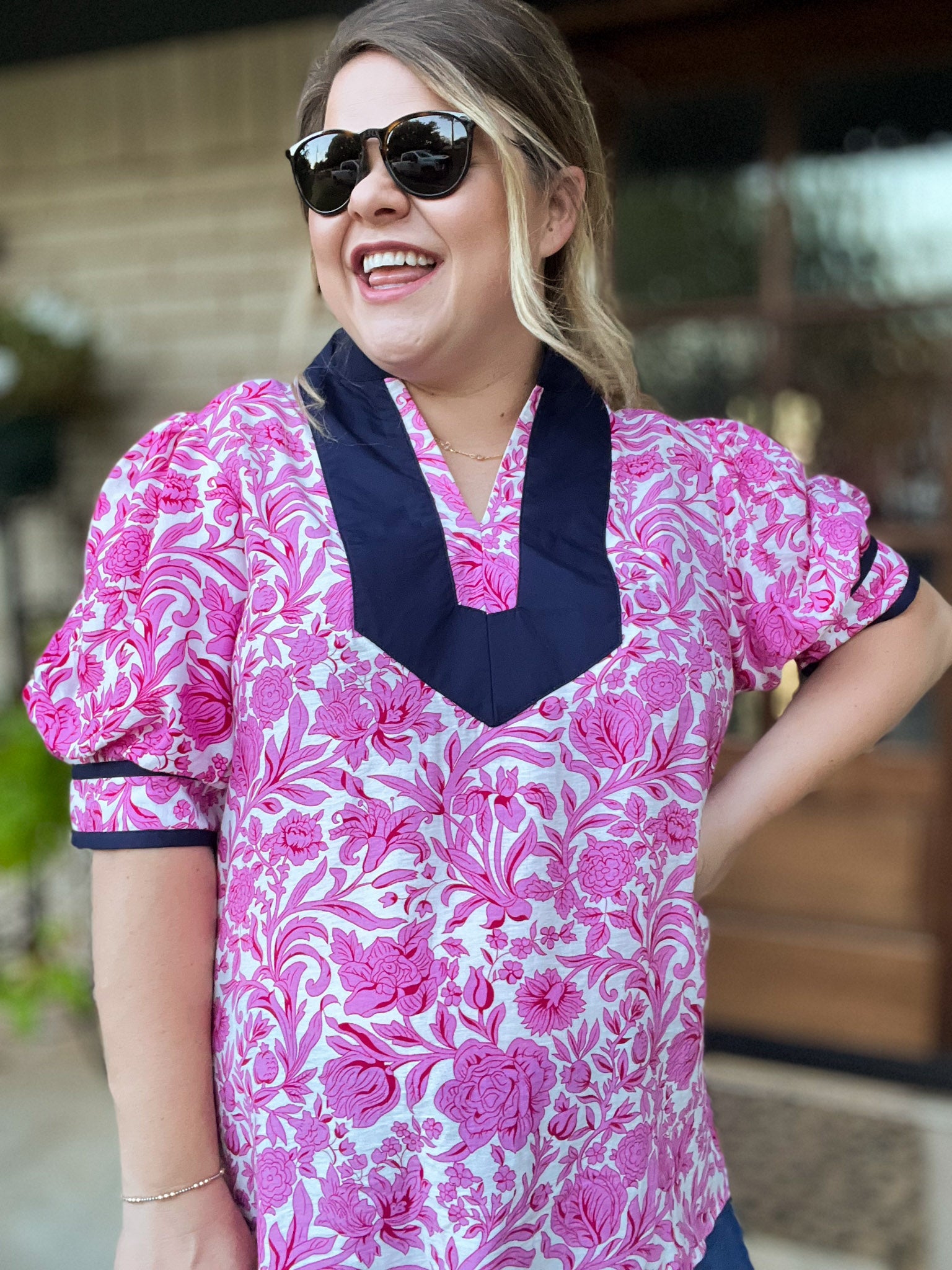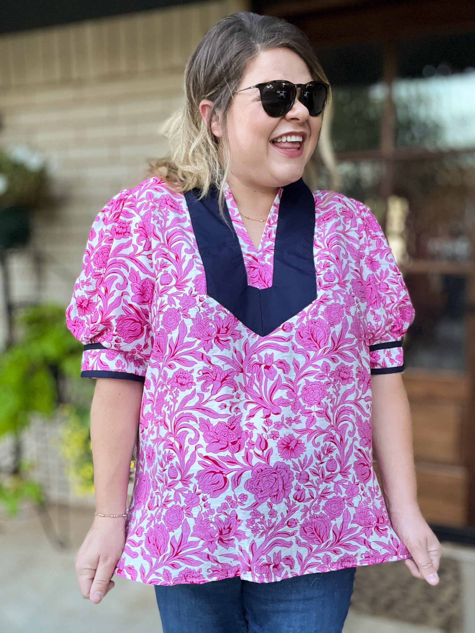Glow Your Own Way Curvy Pink Floral Top with Navy Trim
