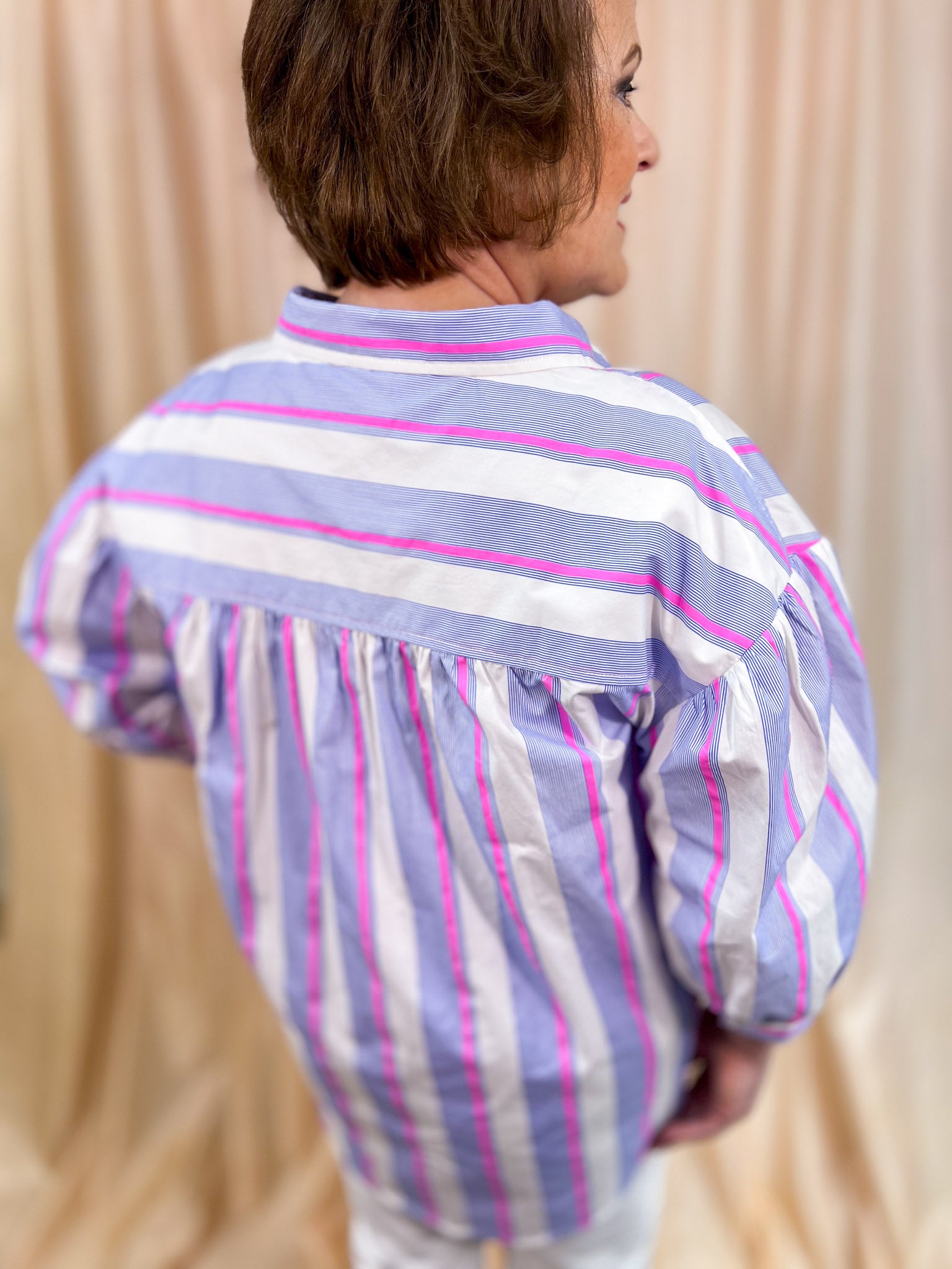 Brighten your wardrobe with our Good Vibes Only Plus-Size Neon Stripe Top! This eye-catching button-down features vibrant multi-color stripes that radiate positivity. The collared design adds a touch of polish, while the playful 3/4 puff sleeves bring the fun. Perfect for adding a splash of color to your everyday look! We love this look with denim and sneakers!