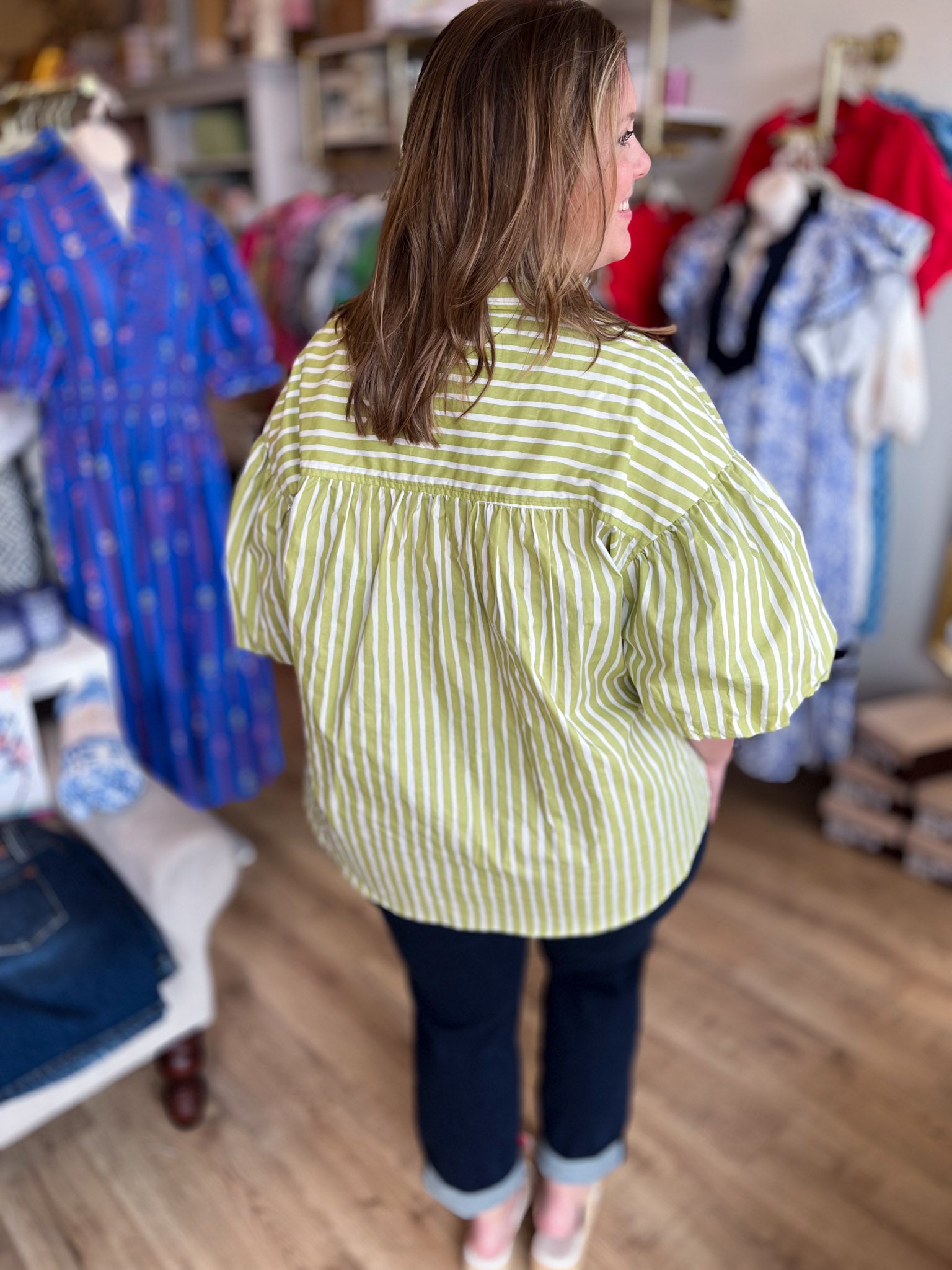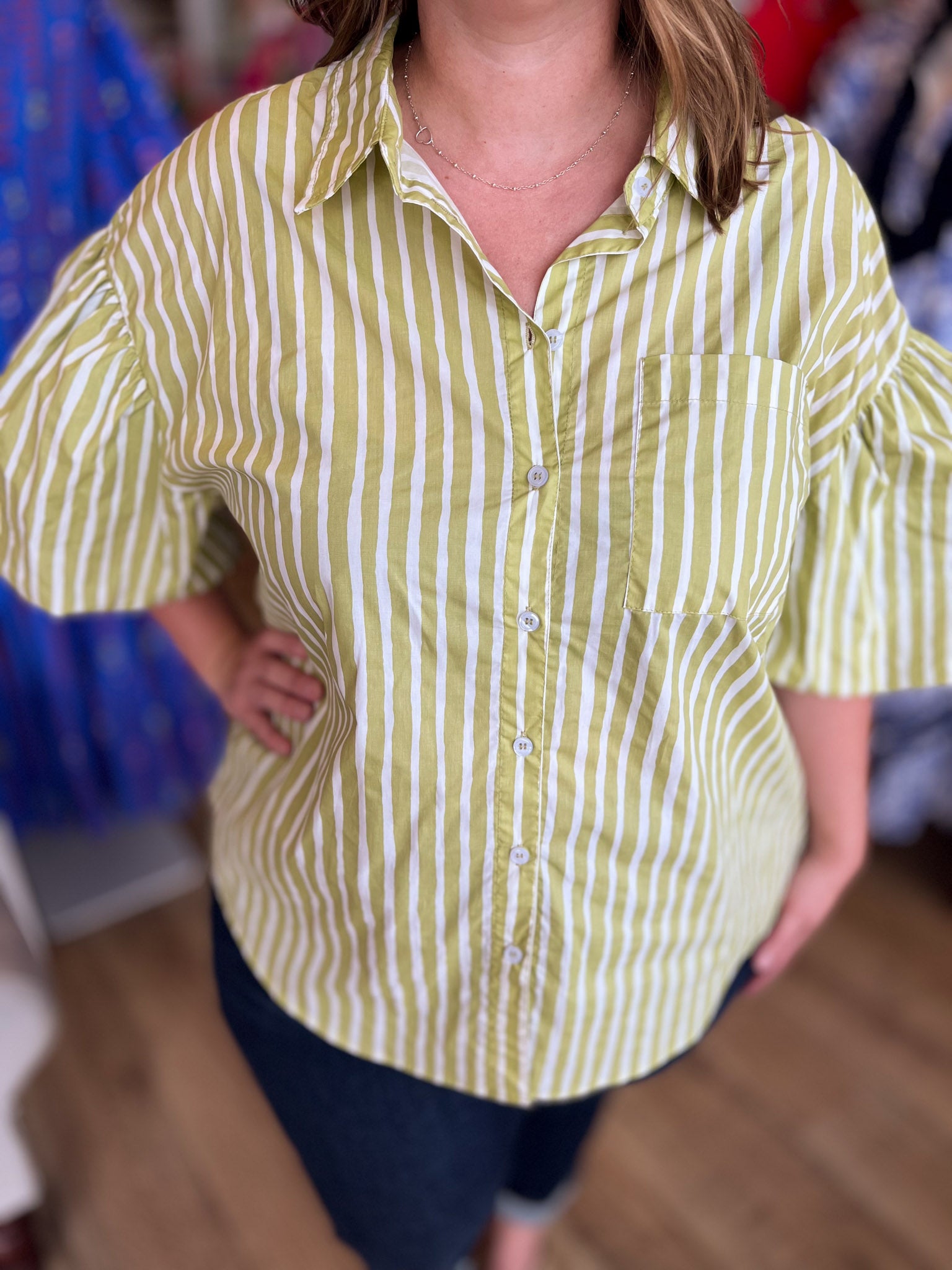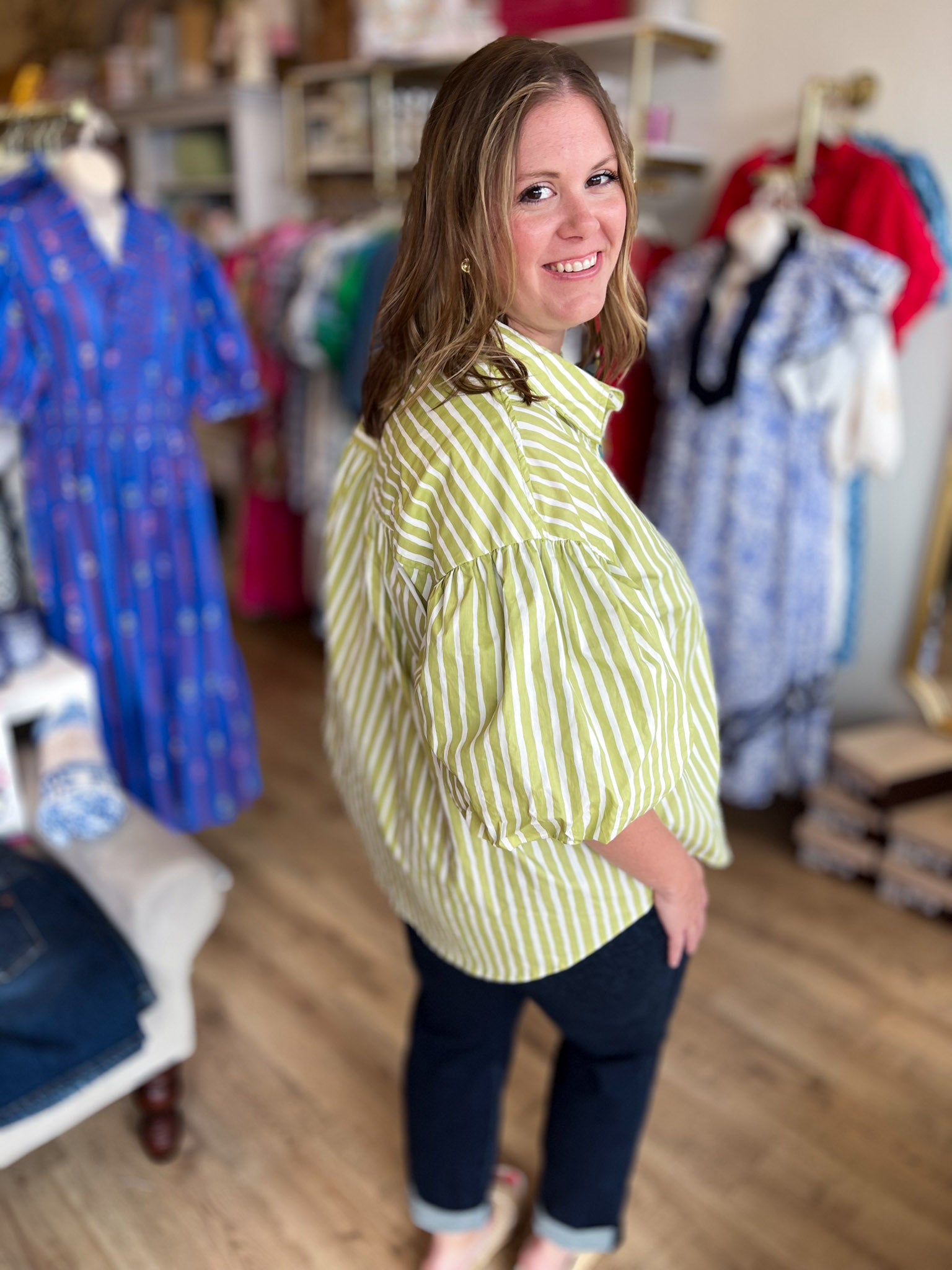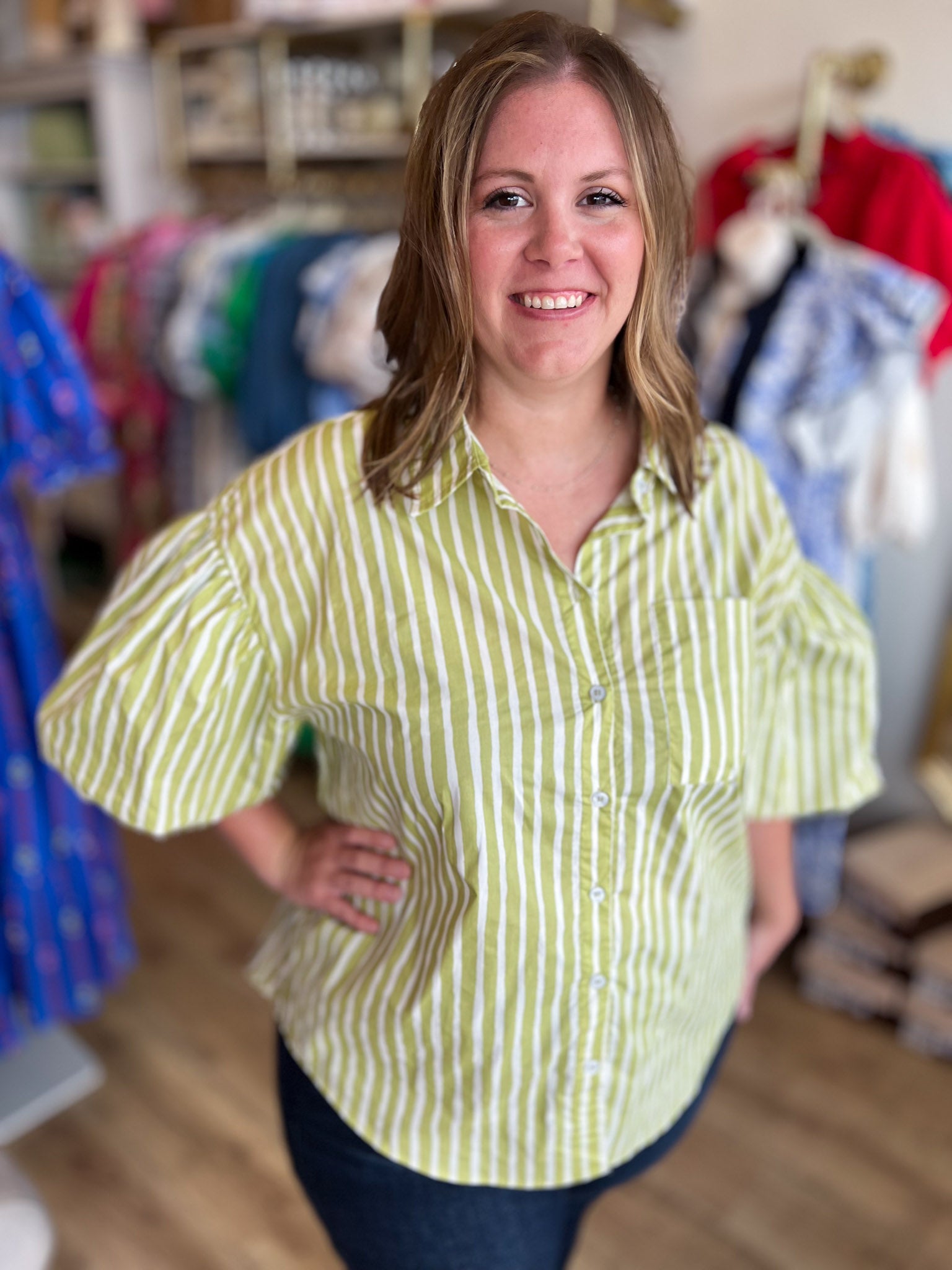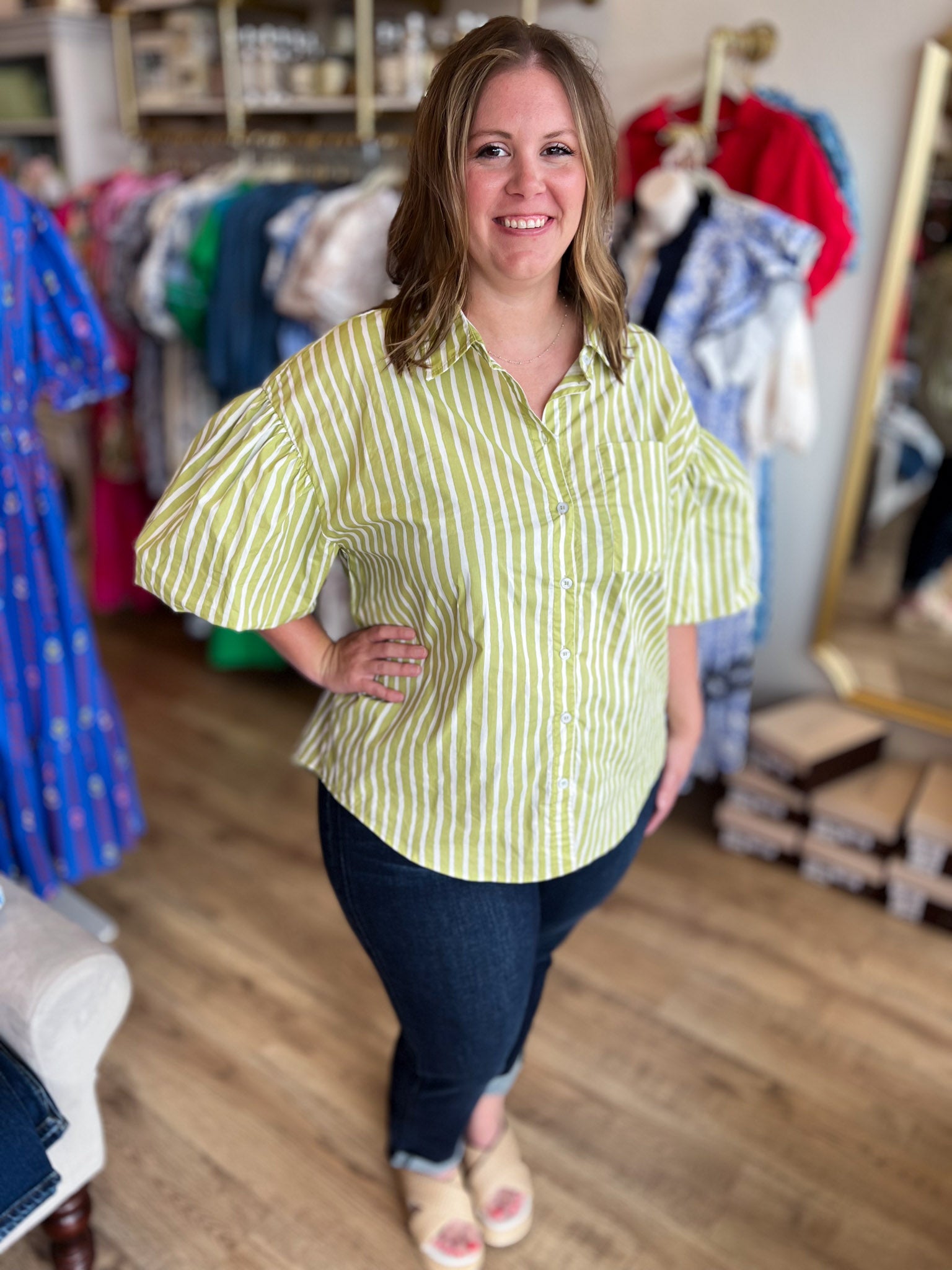 Hey there, honeydew! You'll look darling in this chic striped plus-size avocado green top! This stylish poplin button down shirt will keep you looking sharp and put together, while the bubble sleeves add a playful touch. Perfect for any occasion, this top is a must-have for any fashion-forward plus-size woman. We love this look with white or dark denim for a sassy daytime look!