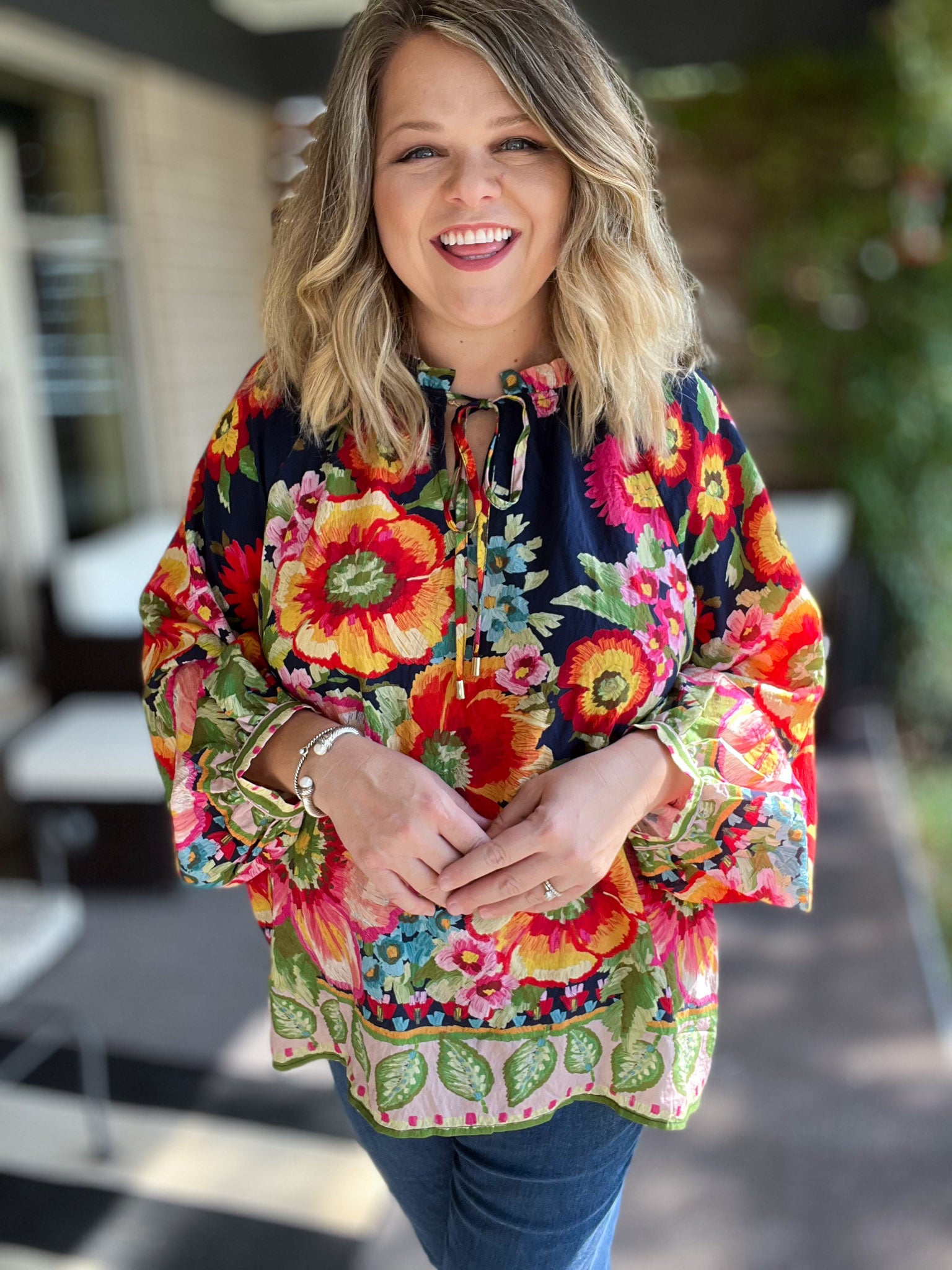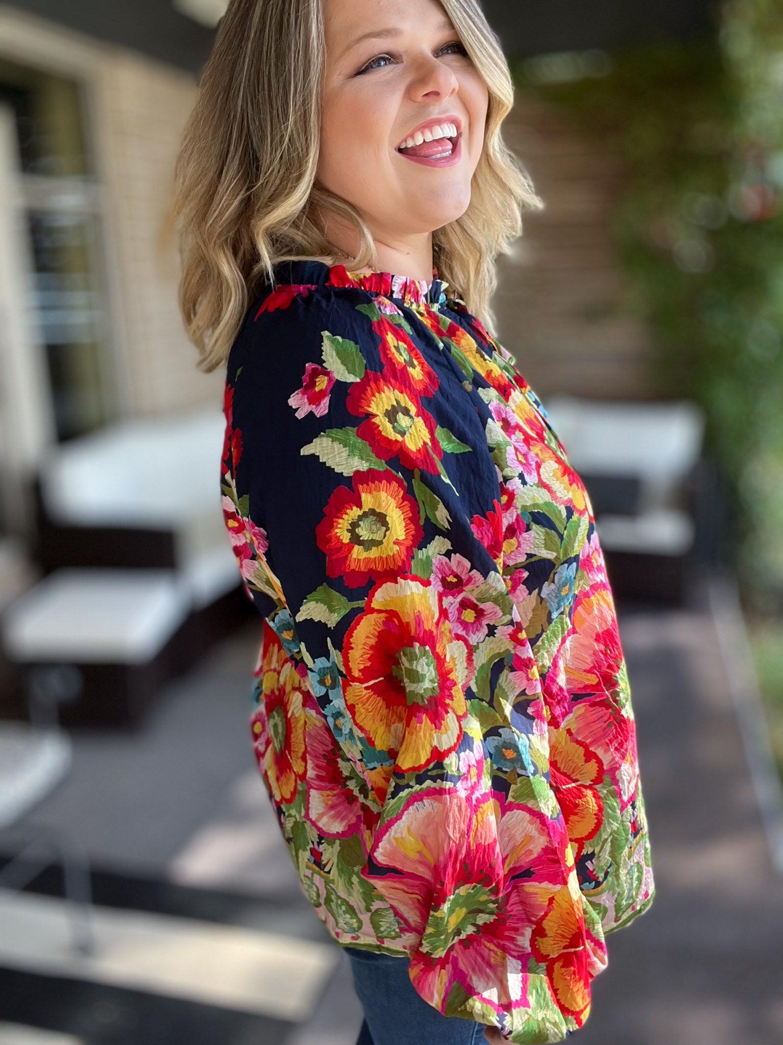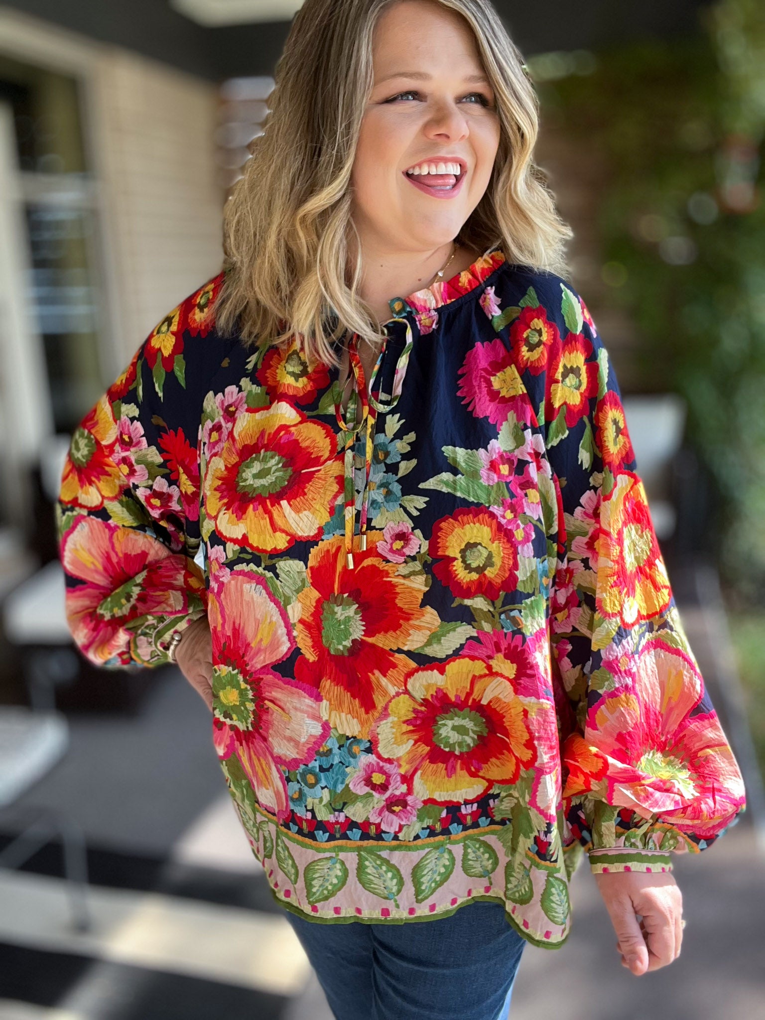Fall into the season with bold confidence with the In Fall Bloom Plus-Size Floral Top! This v-neck top drapes in a flowy fit that celebrates every curve unapologetically. With vibrant, bright colors, it commands attention in any seasonal lineup. Lightweight fabric ensures you stay comfortable while a keyhole neck and raglan sleeves keep you stylish all day long. Whether you’re conquering the pumpkin patch or owning Thanksgiving lunch, this top’s fearless style keeps you looking fierce and fabulous.