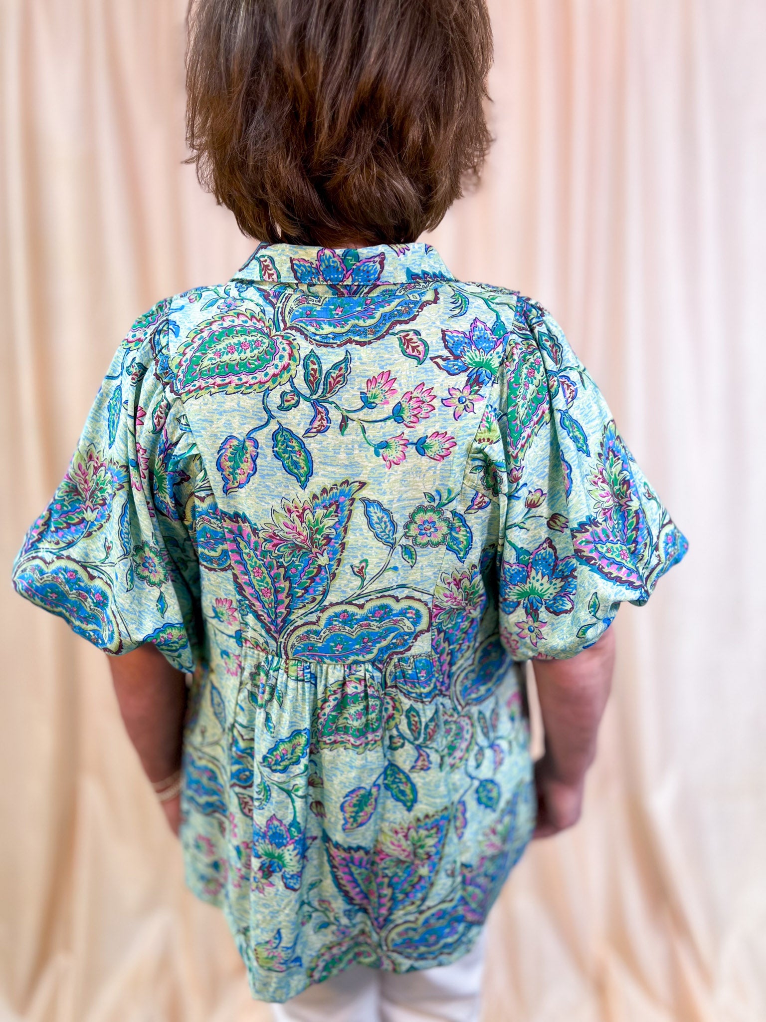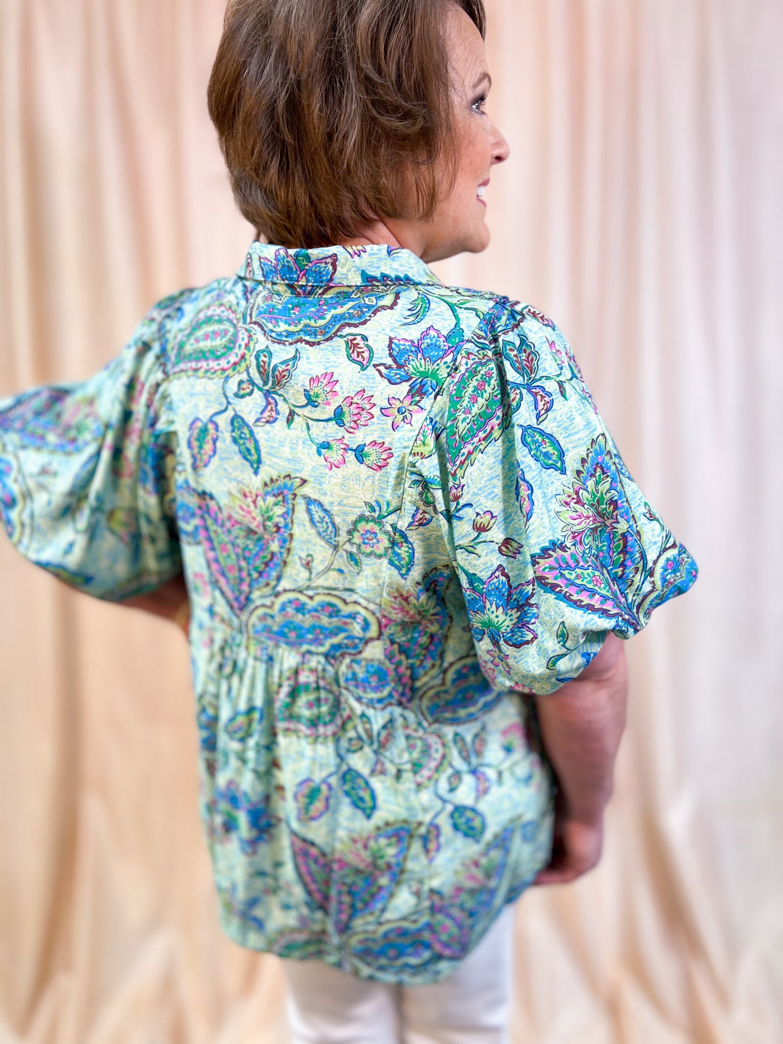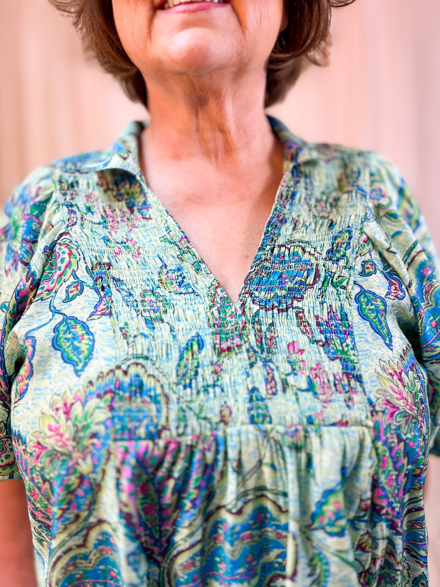 Get ready to be the most chic chick in the room with our Life of the Party Curvy Paisley Smocked Top! This top features a fun paisley print on a mint background with a v-neck, smocked chest, simple collar and balloon sleeves. The ultimate curvy closet must-have. Indulge in a playful pattern that is sure to make you stand out no matter the occasion!