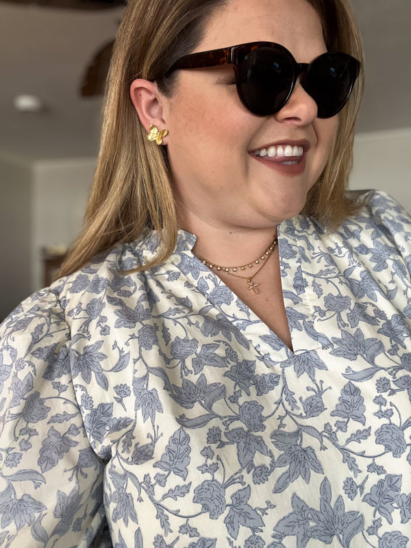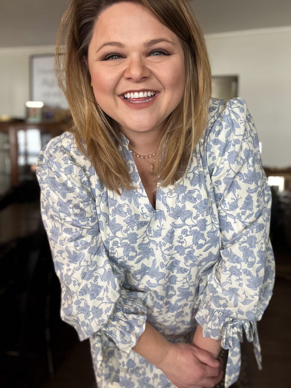 Stay chic with our "Peace Be With You" curvy blue floral dress. This mini dress features a beautiful floral print and ¾ puff sleeves with an elastic opening and fixed ribbon accents. Plus, with convenient side pockets and a lightweight, non-sheer woven fabric, you'll be comfortable and polished all day long. Made with 100% cotton for a soft and breezy feel. Adding a touch of whimsy to your wardrobe has never been easier!