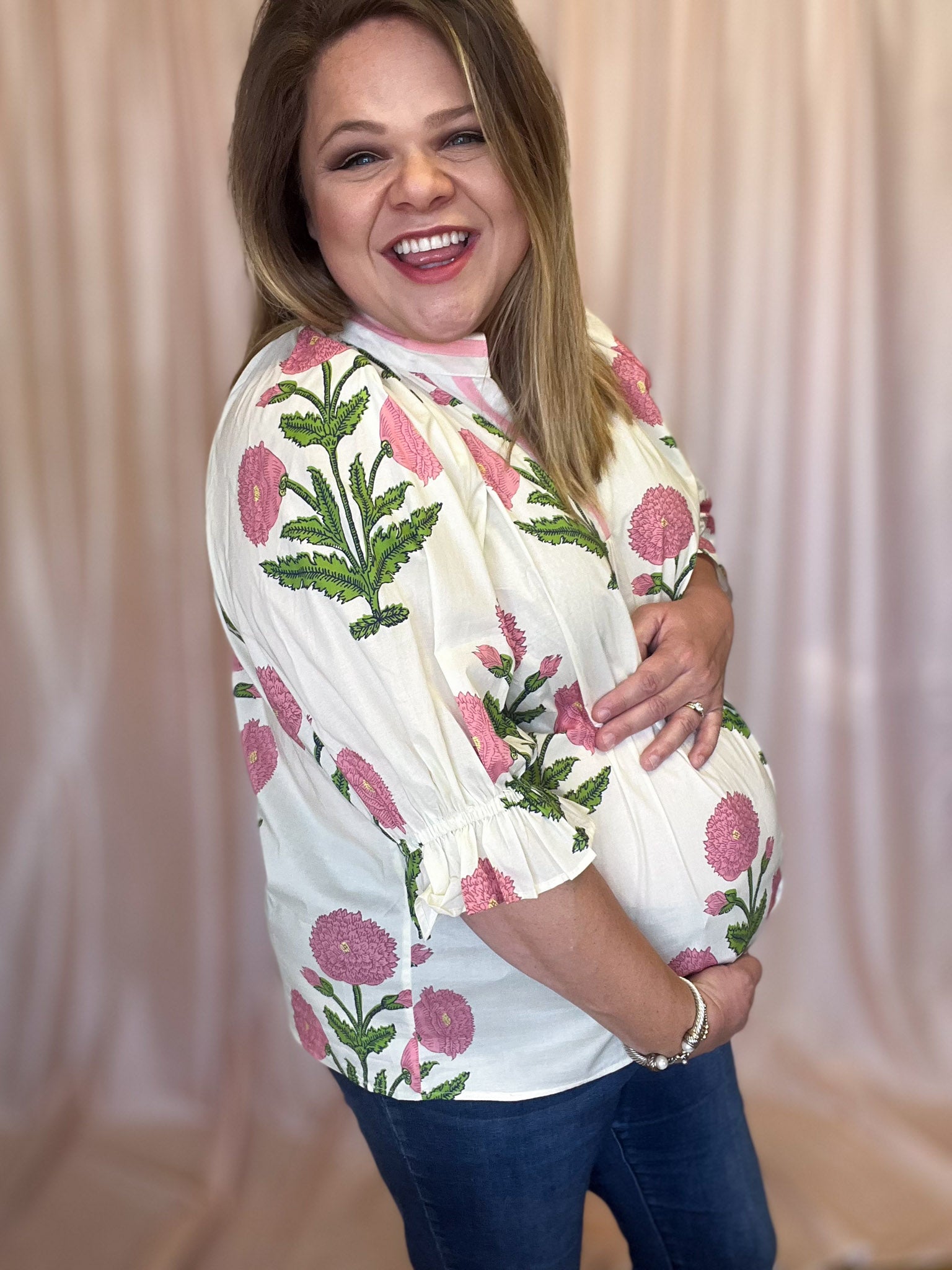 Embrace playful charm with the Picking Peonies Curvy Cream & Pink Floral Top! Featuring fresh floral patterns in a soft cream accented by mauve pink touches, this top delights with scalloped sleeves and a striking contrast trim at the v-neckline. You will love the full coverage, flattering sleeves! Perfect for sunny days and special occasions alike, this top could easily span several seasons of wear!