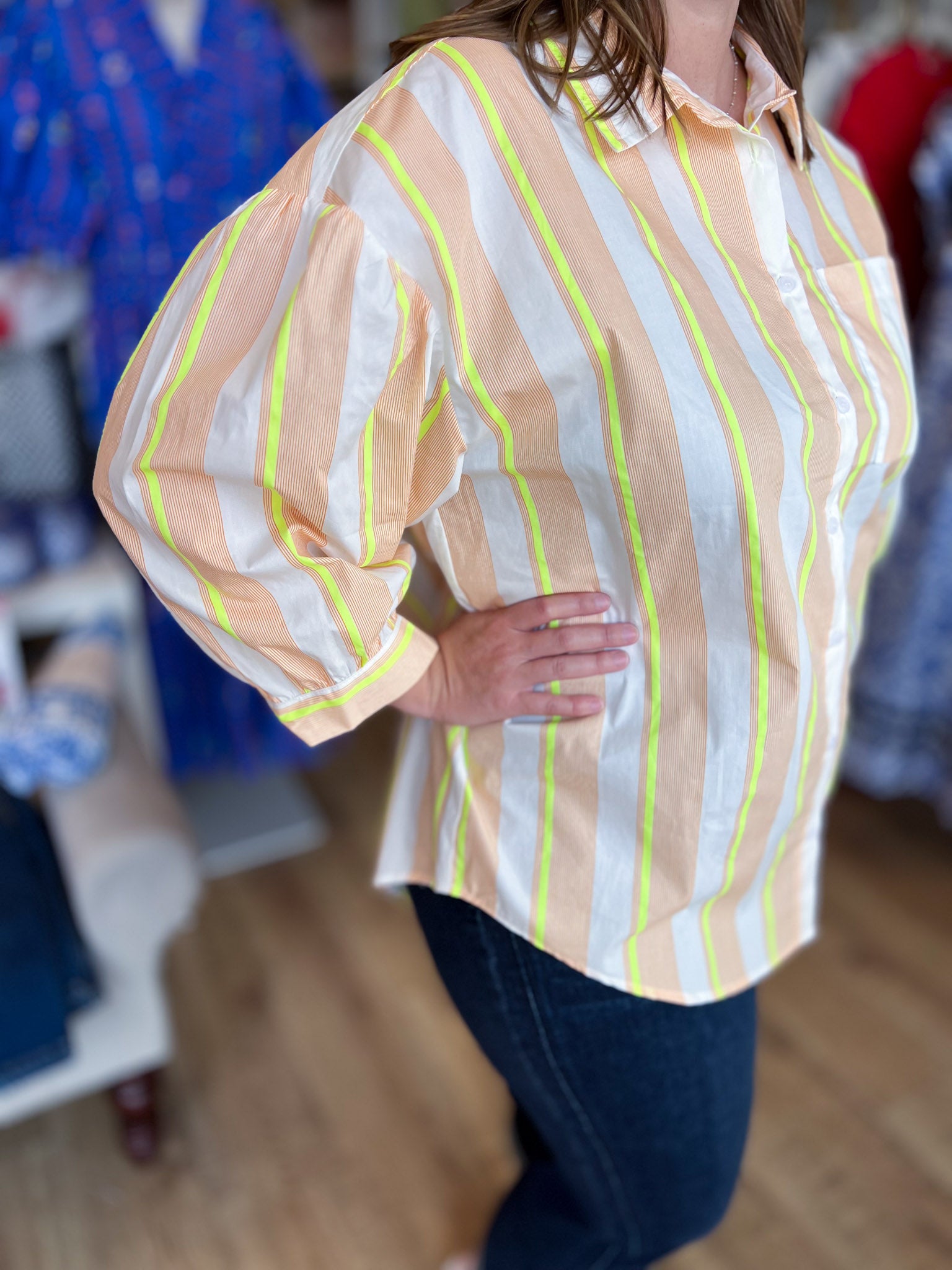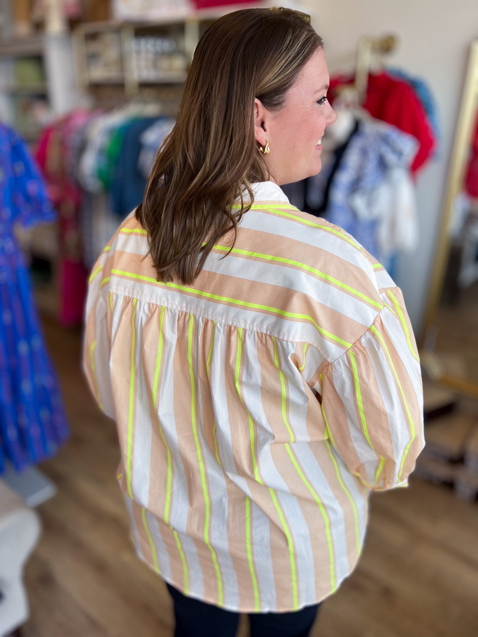 Brighten your wardrobe with our Lemon Drop Plus-Size Neon Stripe Top! This eye-catching button-down features vibrant multi-color stripes that radiate positivity. The collared design adds a touch of polish, while the playful 3/4 puff sleeves bring the fun. Perfect for adding a splash of color to your everyday look! We love this look with denim and sneakers!