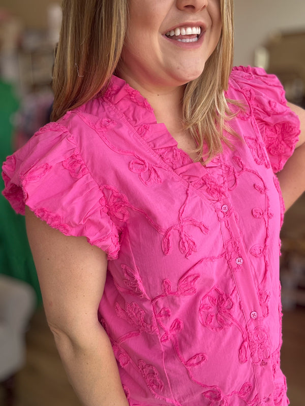 Be the epitome of Summer chic with this "Raspberry Ripple" top, a floral appliqué bubble flutter sleeve piece with a ruffle accented V-neck button front closure! Stay cool and comfortable in 100% cotton with this soft, lightweight fabric and lined design. Playful and stylish, this top is perfect for any occasion!
