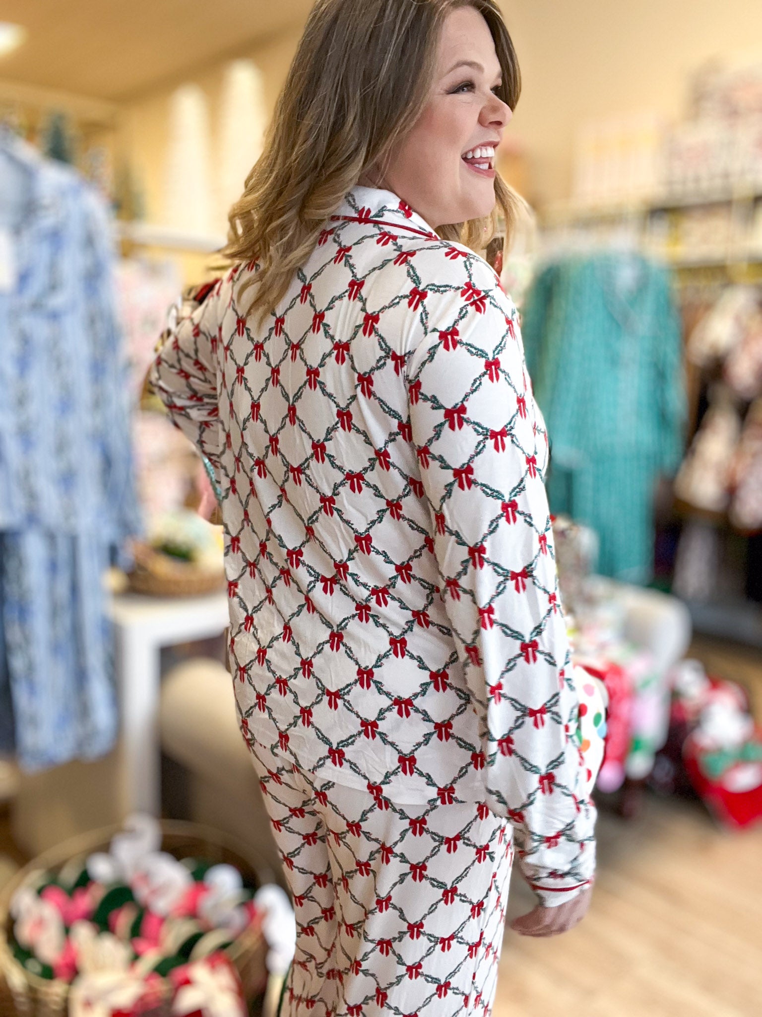 Step into festive fun with our Santa Baby Curvy Christmas Lattice Garland Pajamas! Designed for cozy holiday mornings and joyful cocoa nights, this traditional Christmas pajama set features a long-sleeve button-front top with a classic collar paired with straight-leg pants and an adjustable drawstring for the perfect fit. Enjoy a soft, breathable feel that drapes beautifully for comfort and style all season long. Celebrate the holidays in cozy charm and spirited style!