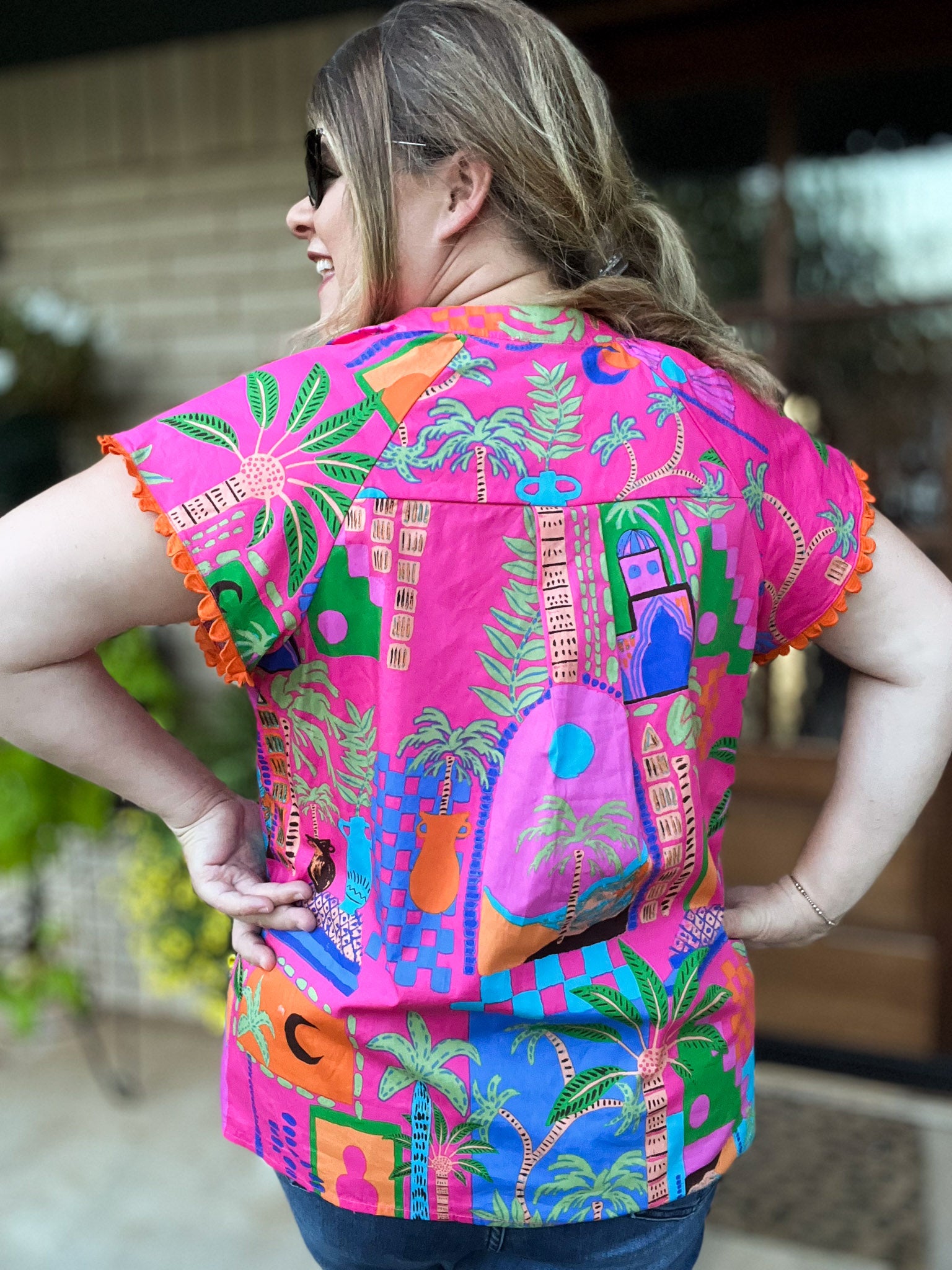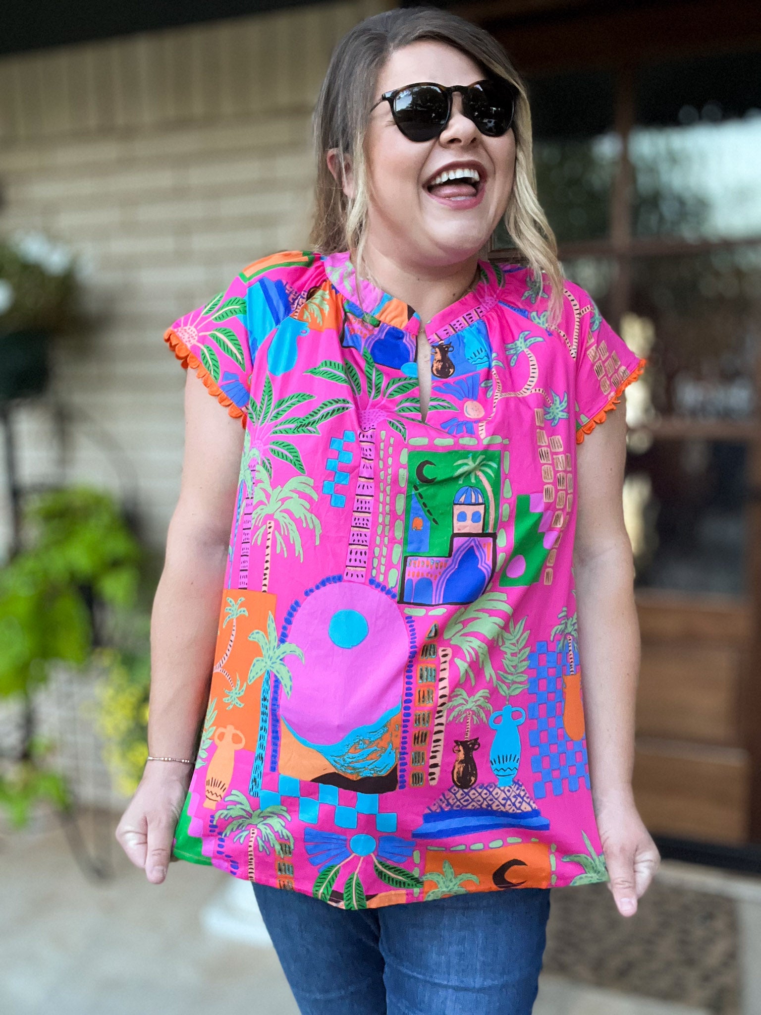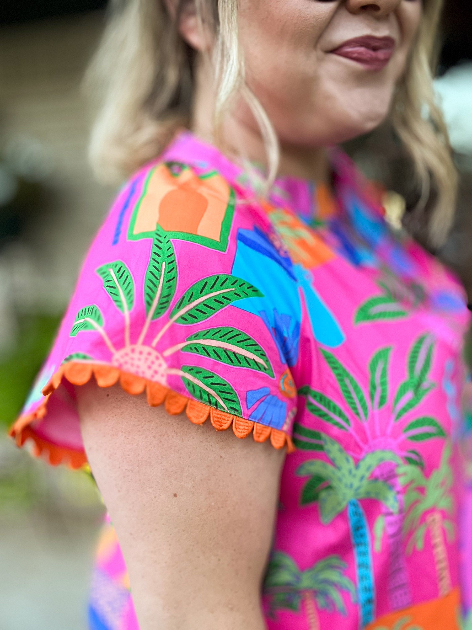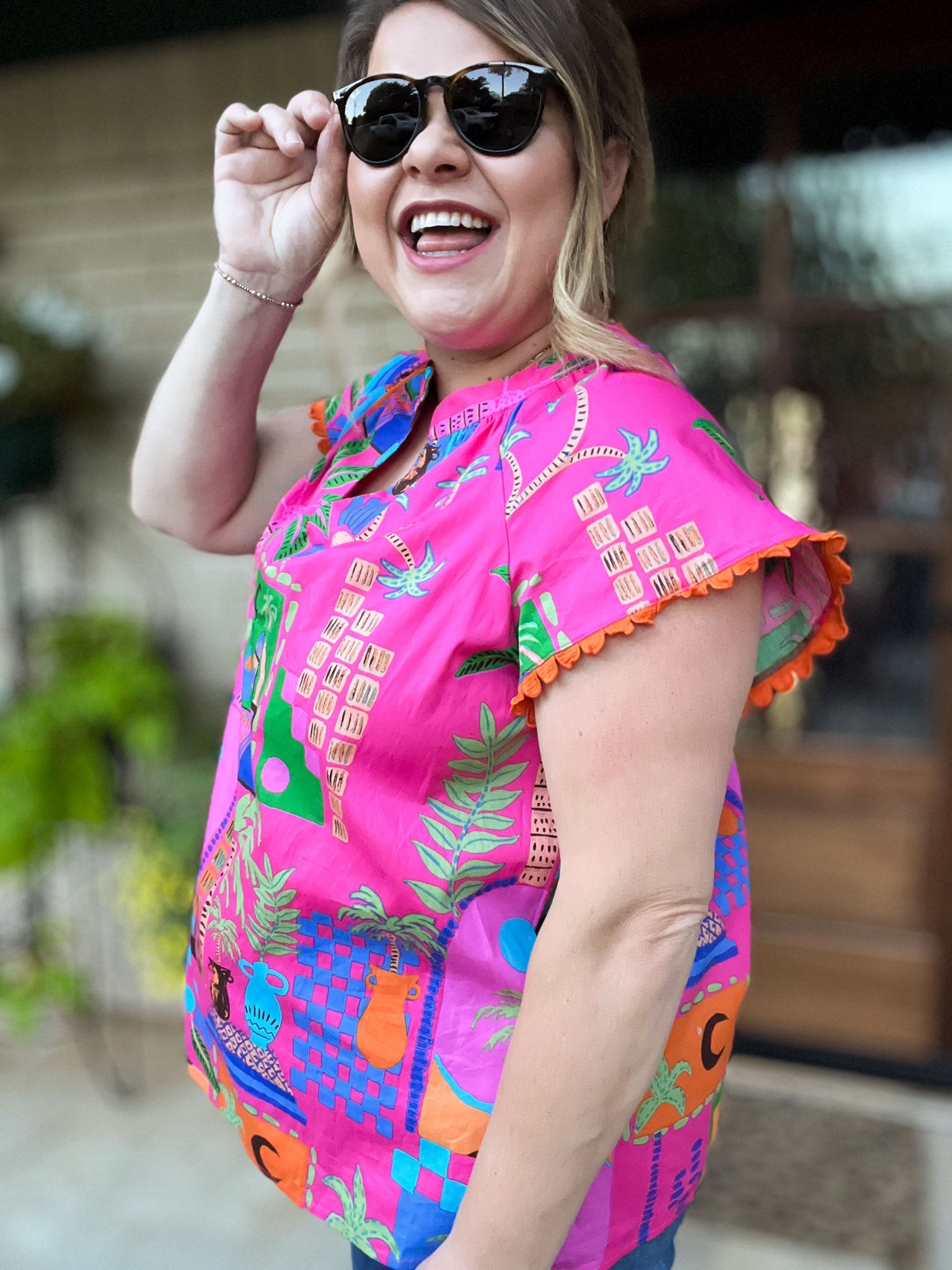Dreaming of faraway places? Whisk away to your tropical paradise in our Somewhere Far Away Plus-Size Split Neck Top! With its bright pink background accented with fun orange scallop trim sleeves, this Mediterranean feel top made of breezy fabric is made for sunny adventures and easygoing days. Bring color and confidence to your closet with this must-have summer top featuring cute cap sleeves and a split neck. We love this look with white or dark denim and rattan sandals or wedges!