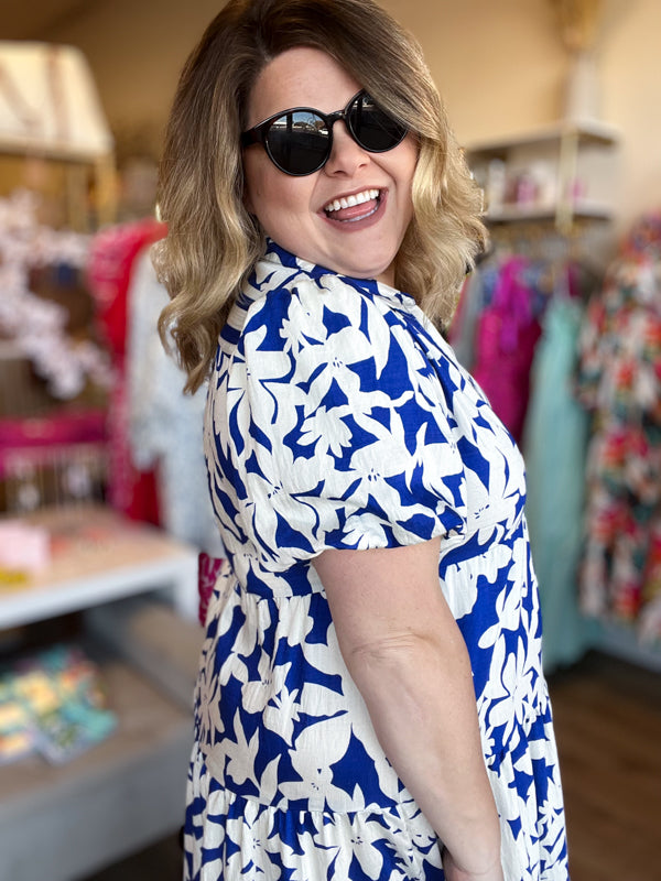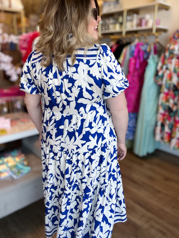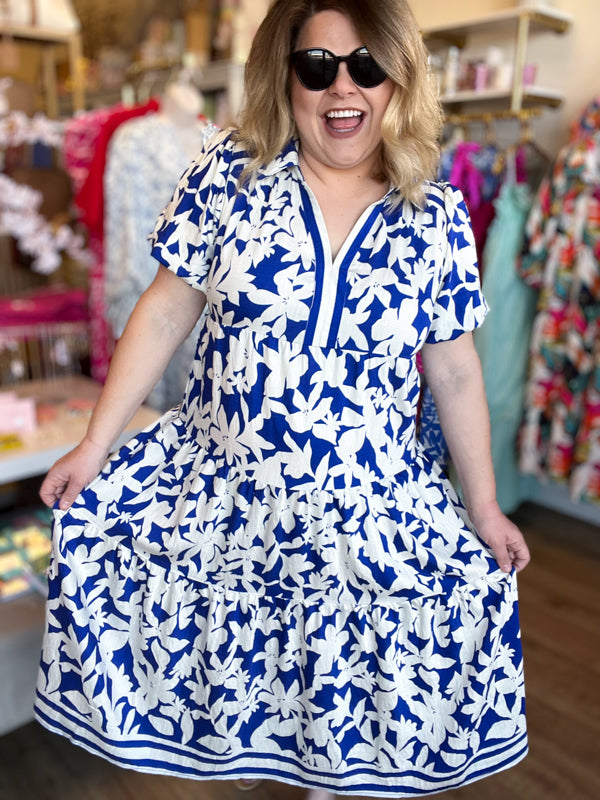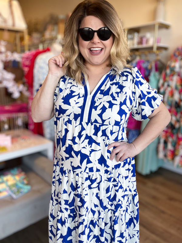Immerse yourself in the beauty of the deep south with our "Springtime in Savannah" Curvy Blue Floral Midi Dress. The stunning color and contrast stripes on the collared neckline make for a effortless daytime look while the tiered midi length skirt keeps this dress comfortable and functional. Perfect for walking through the charming streets of your next vacation destination!
