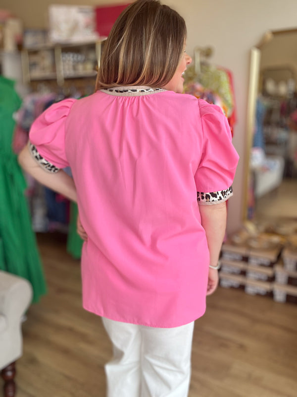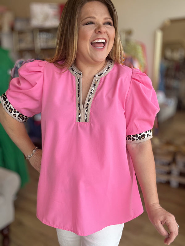 Add some playful print to your wardrobe with our "Pink Chocolate Chip" Curvy Pink Leopard Trim Top! The solid pleated short voluminous sleeves add a fun touch, while the accented leopard print split v-neck and band give it a unique edge. Say "hello" to your new favorite go-to top!