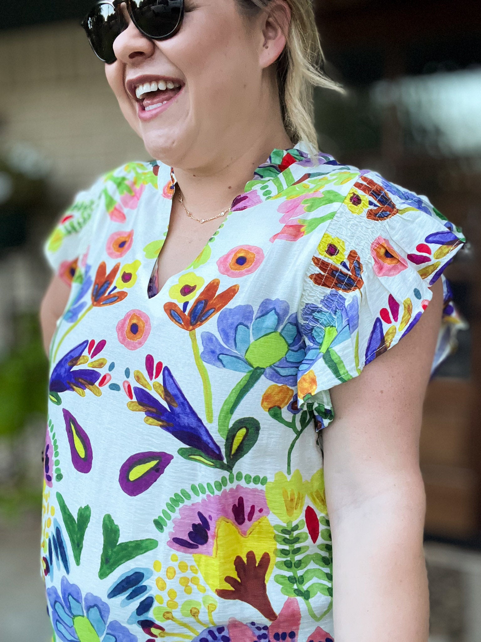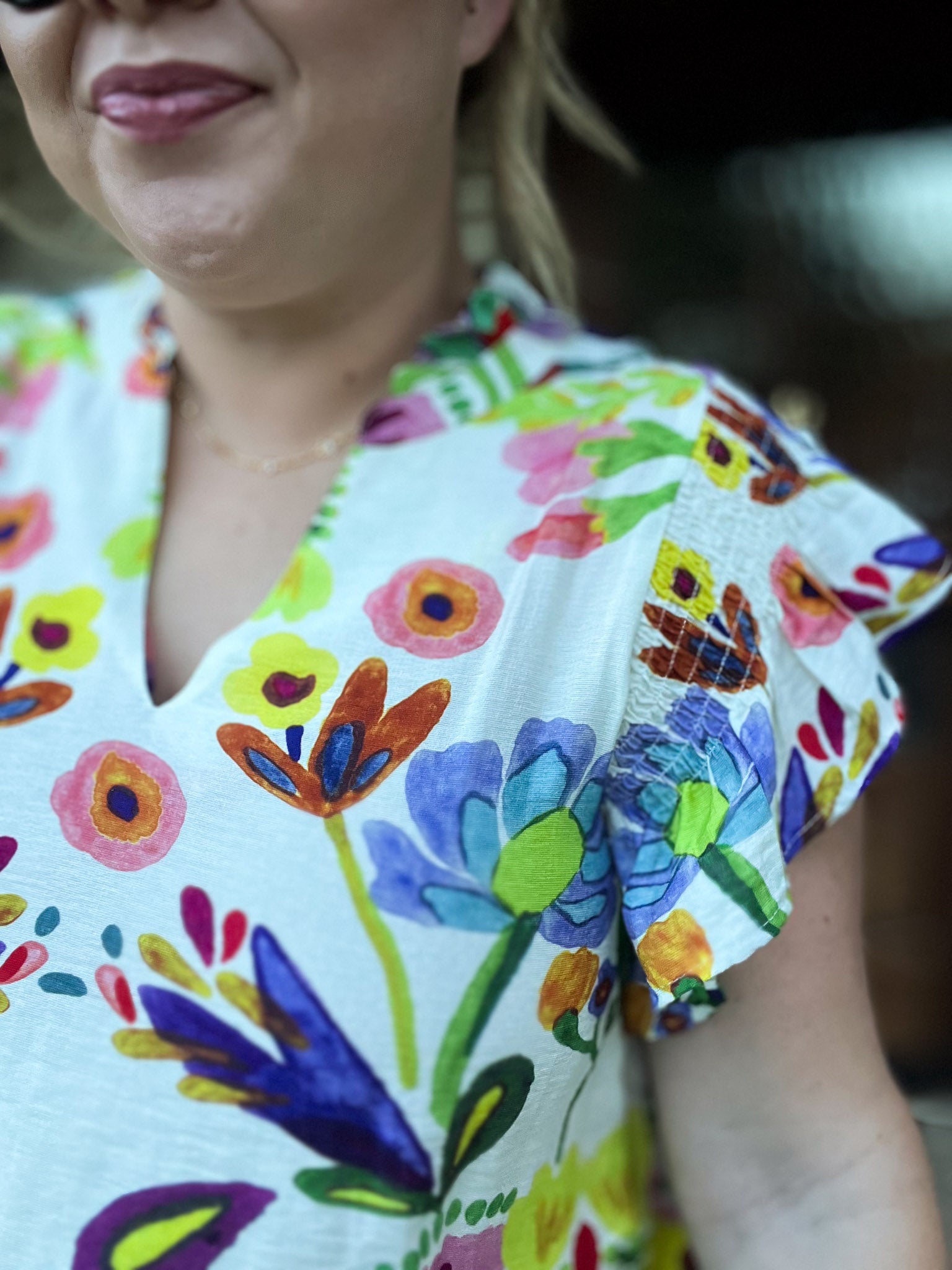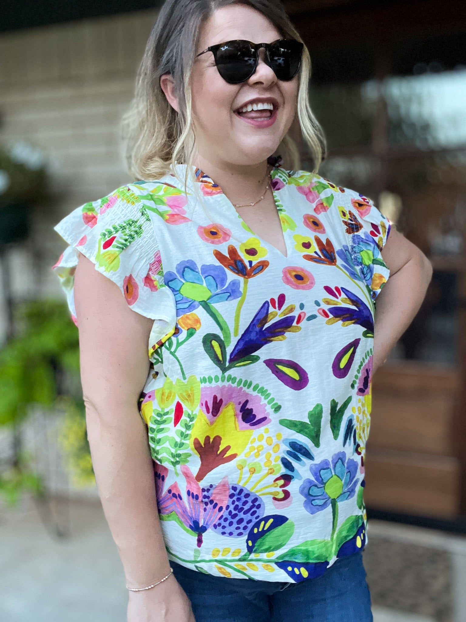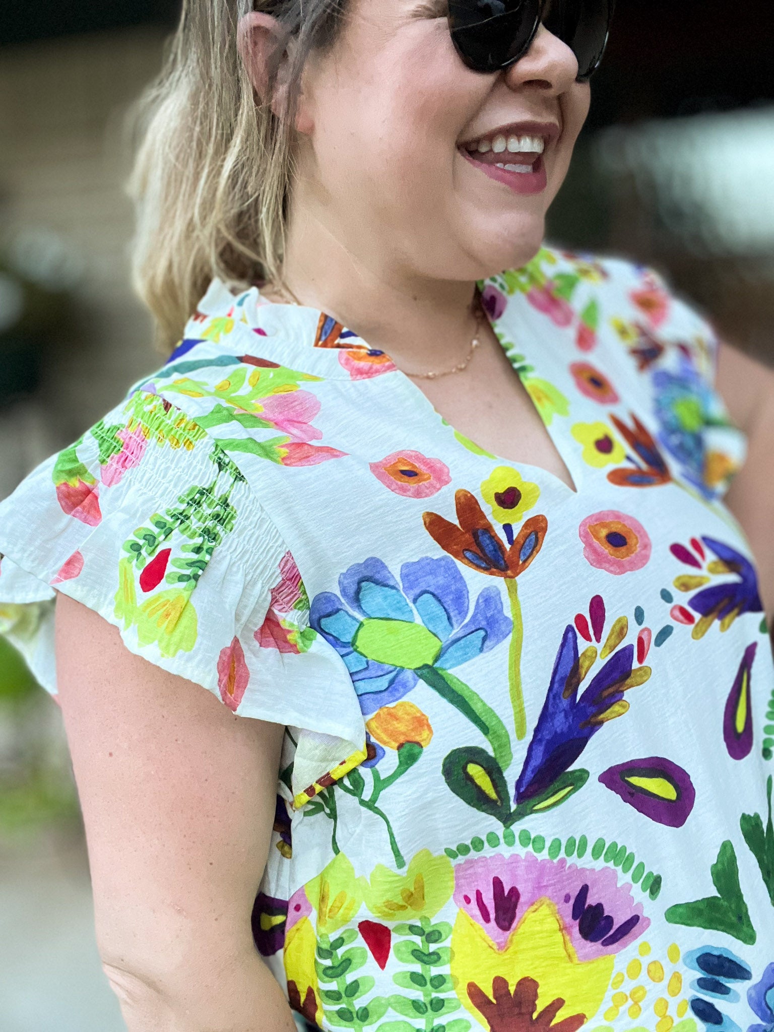 Celebrate in color with vibrant summer vibes in our Summer Nights Curvy Multicolor Floral Flutter Sleeve Top! Featuring playful neon florals and flutter sleeves, this lightweight top keeps you cool while adding a splash of Spanish-inspired flair. The smocked shoulder details and flattering v-neck create a comfortable, stylish fit perfect for sunny days and festive nights. Confidence: check!