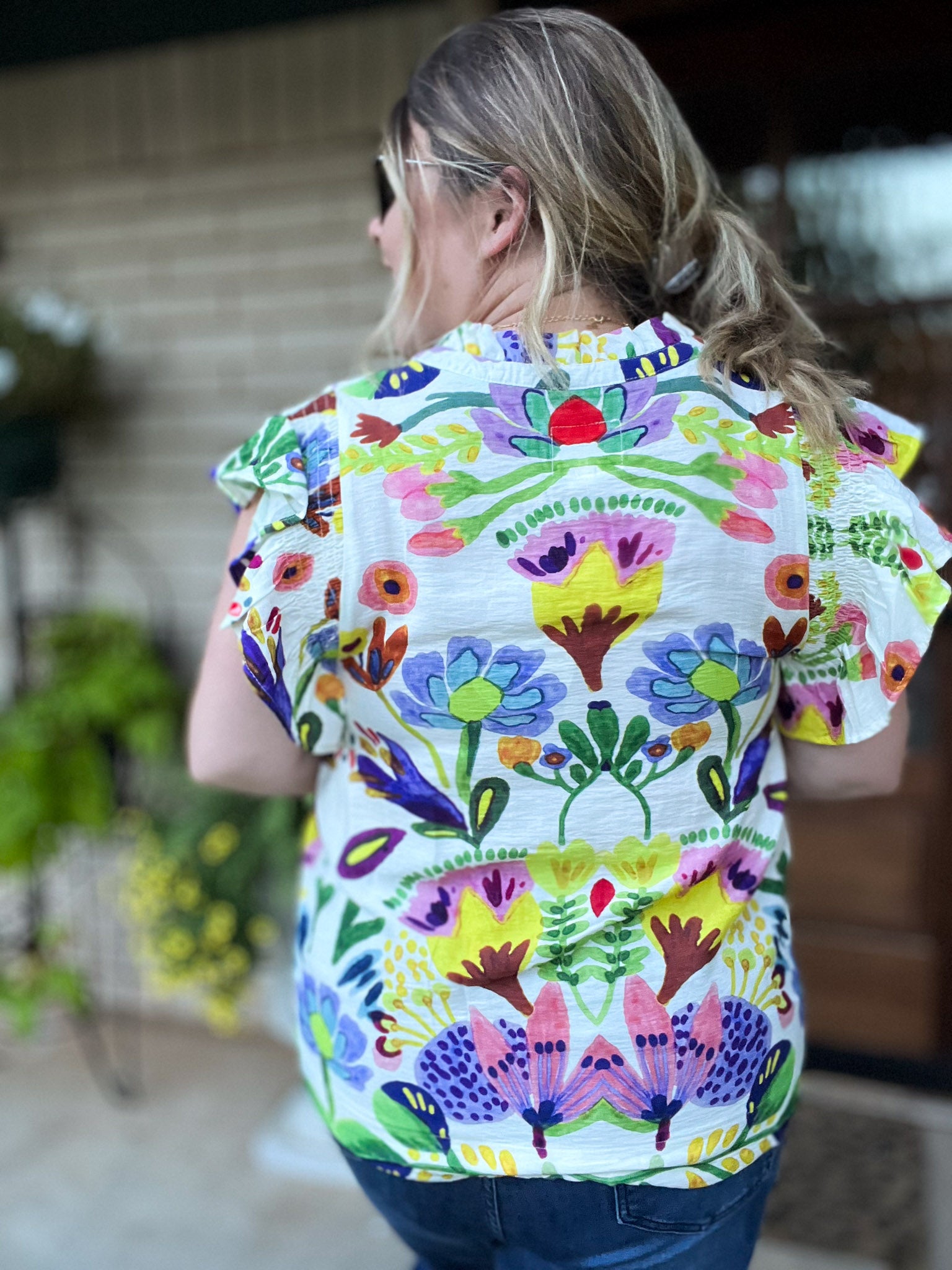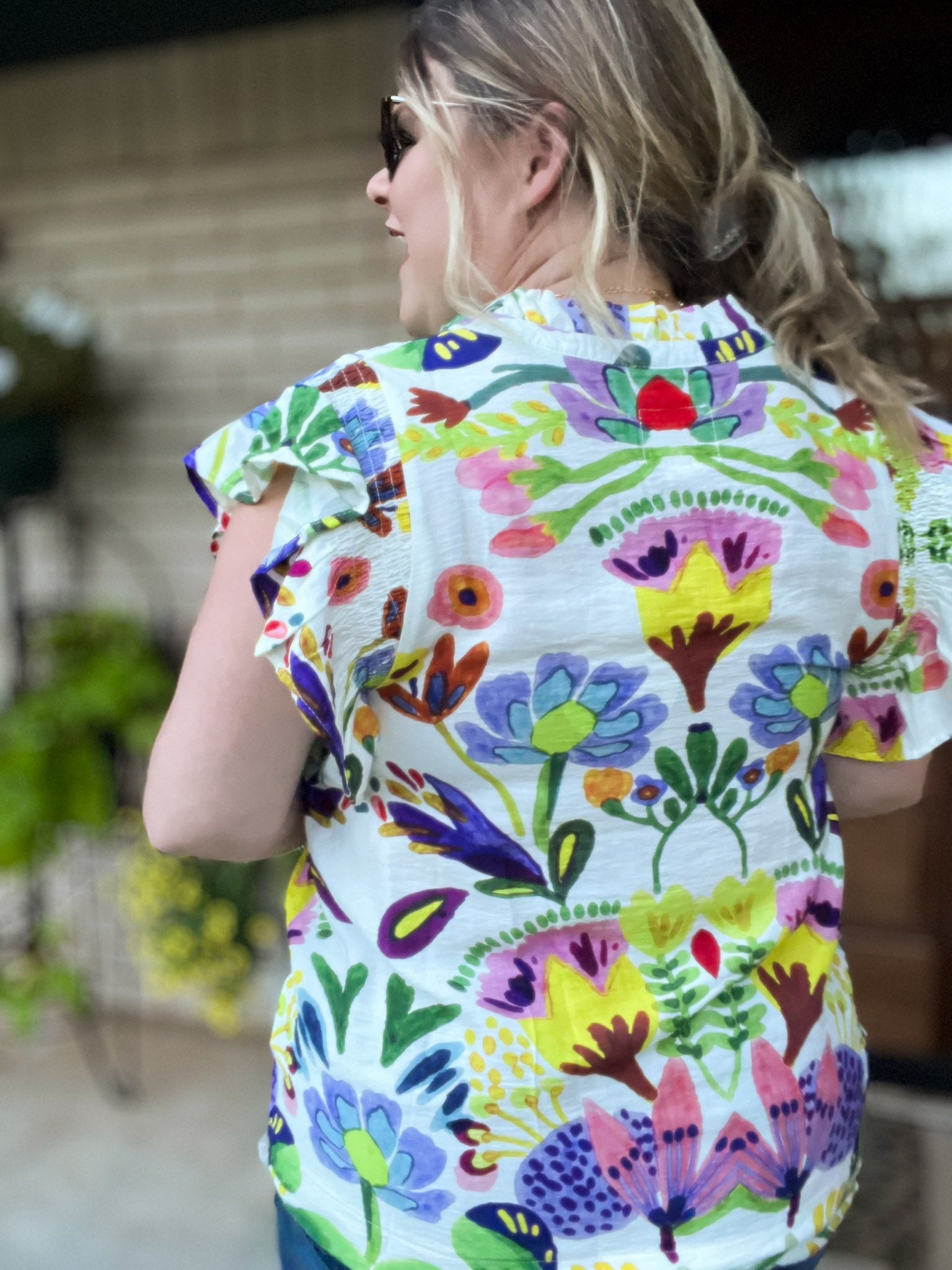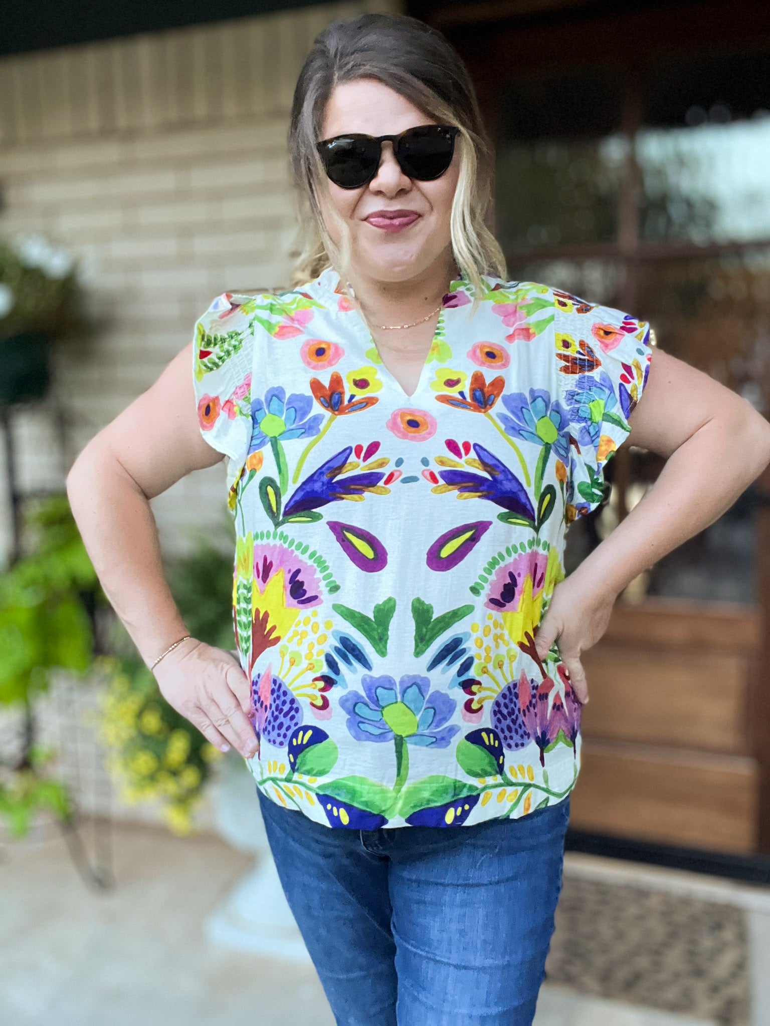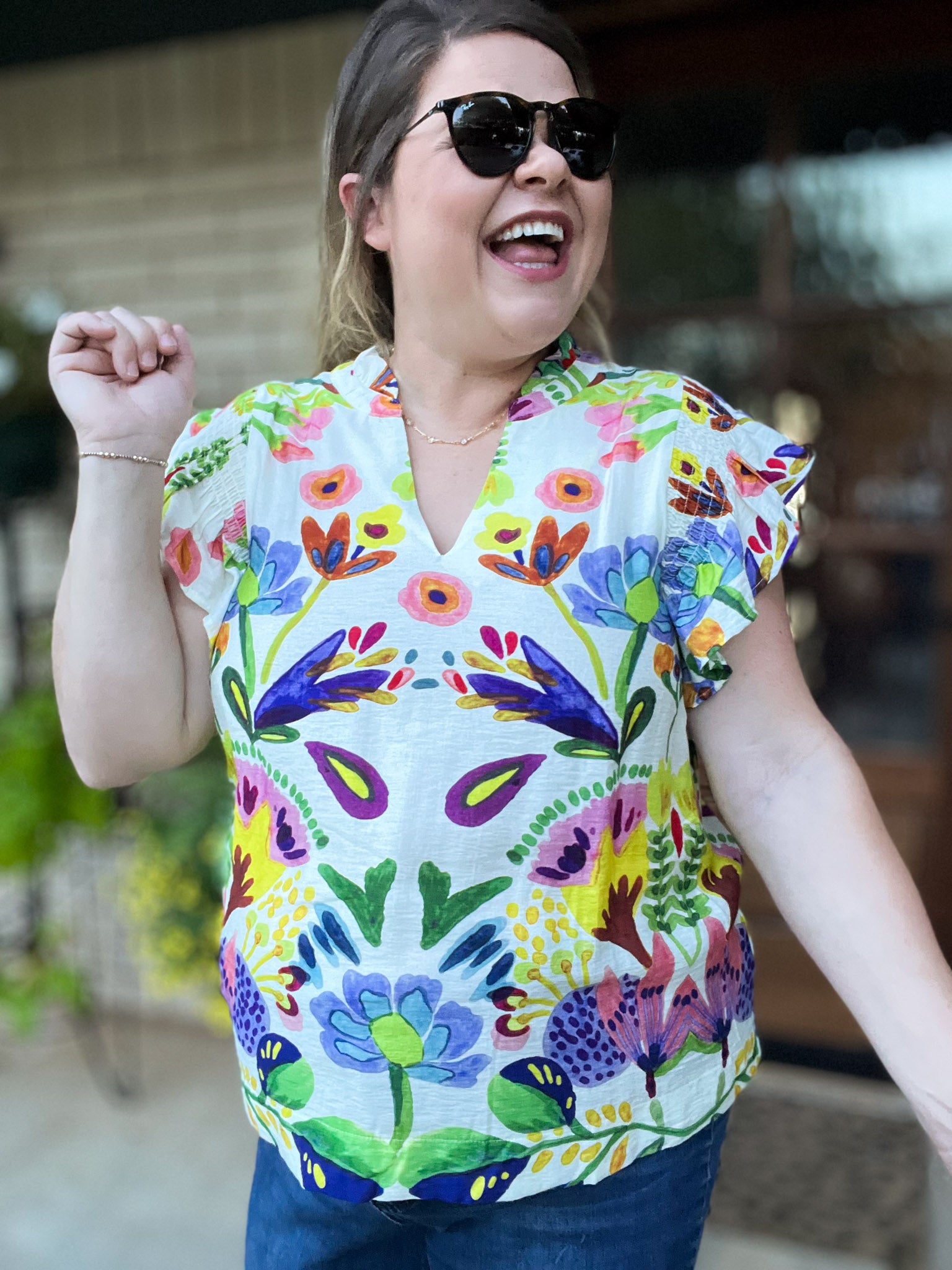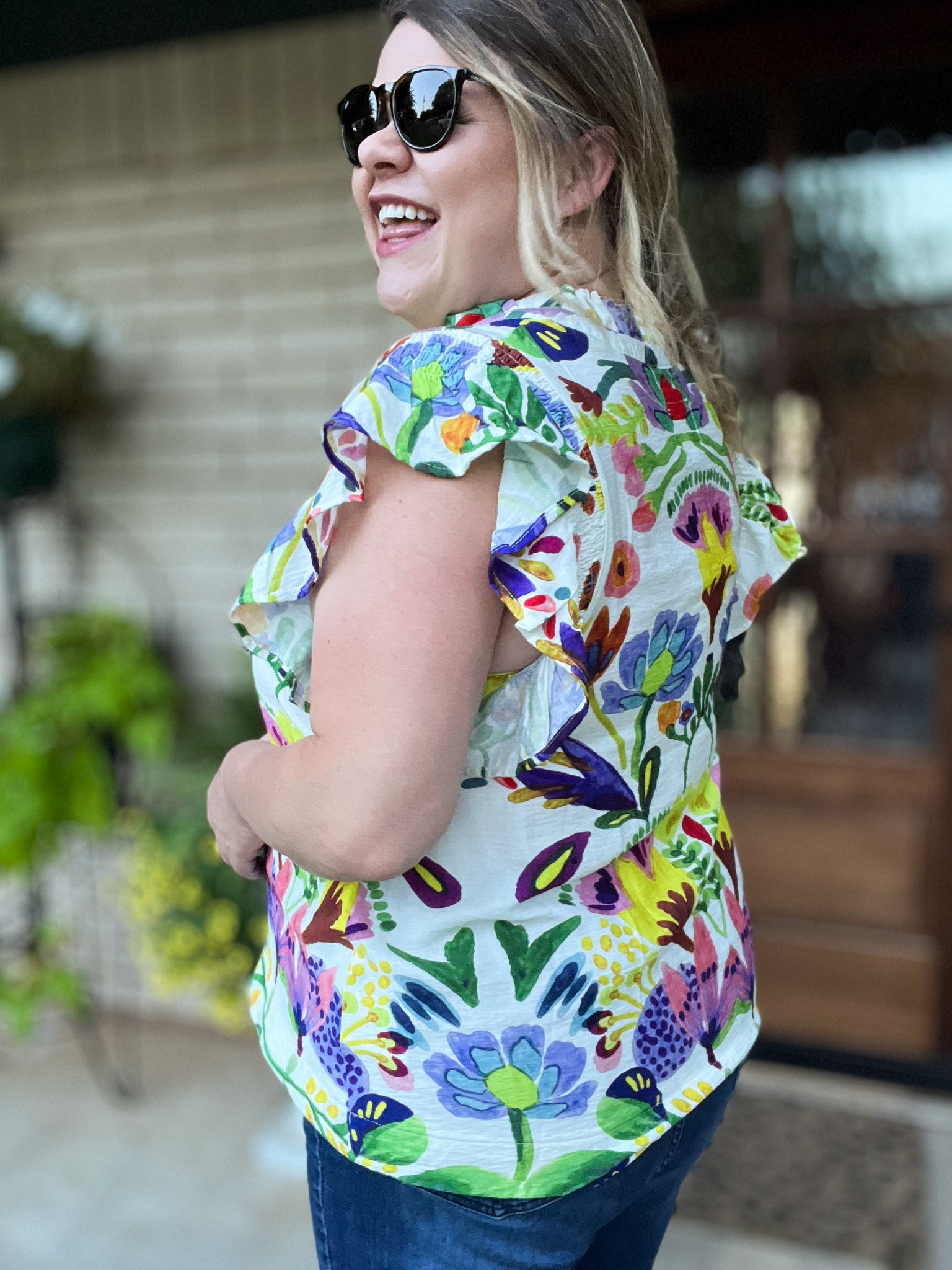 Celebrate in color with vibrant summer vibes in our Summer Nights Curvy Multicolor Floral Flutter Sleeve Top! Featuring playful neon florals and flutter sleeves, this lightweight top keeps you cool while adding a splash of Spanish-inspired flair. The smocked shoulder details and flattering v-neck create a comfortable, stylish fit perfect for sunny days and festive nights. Confidence: check!