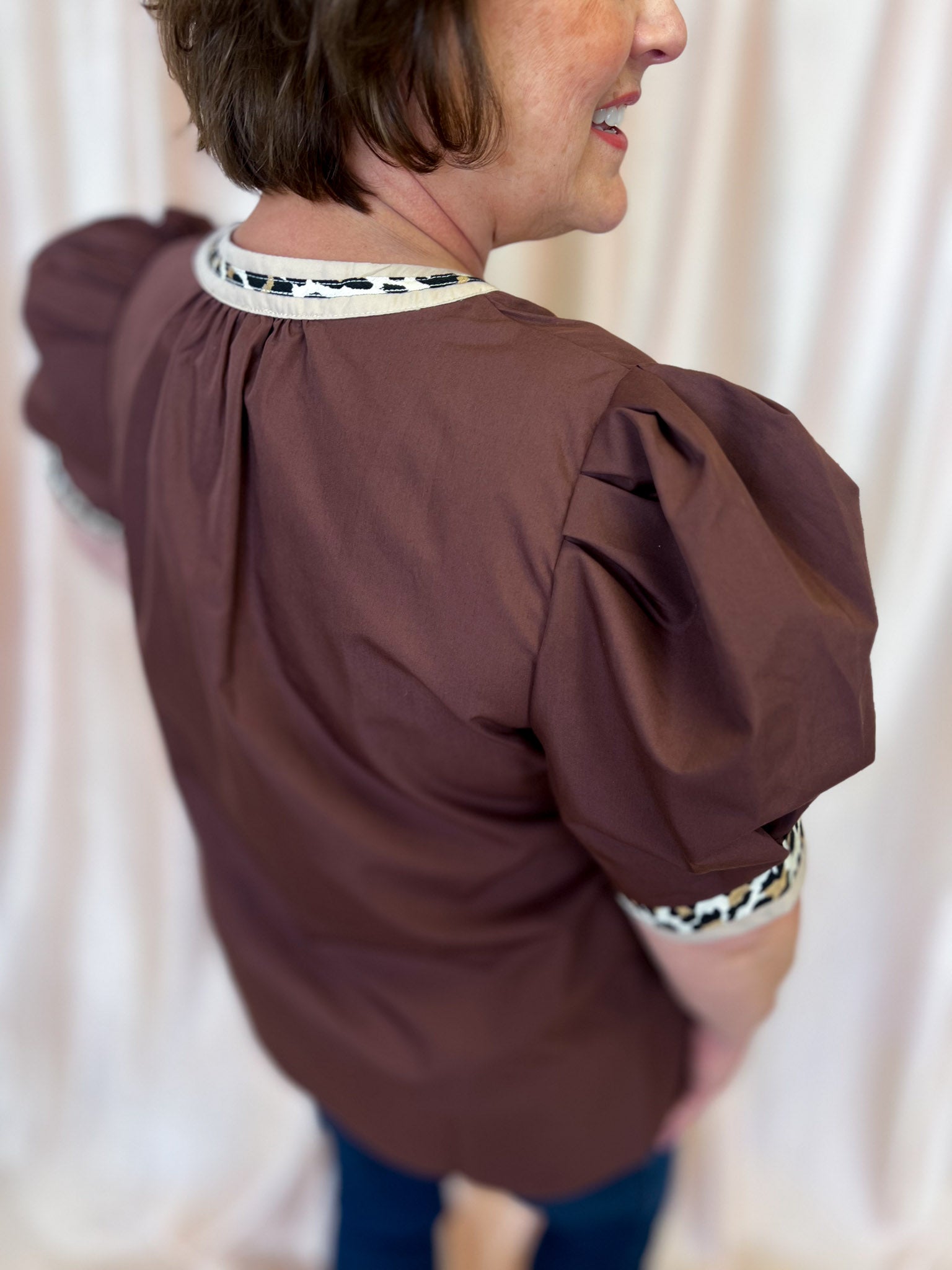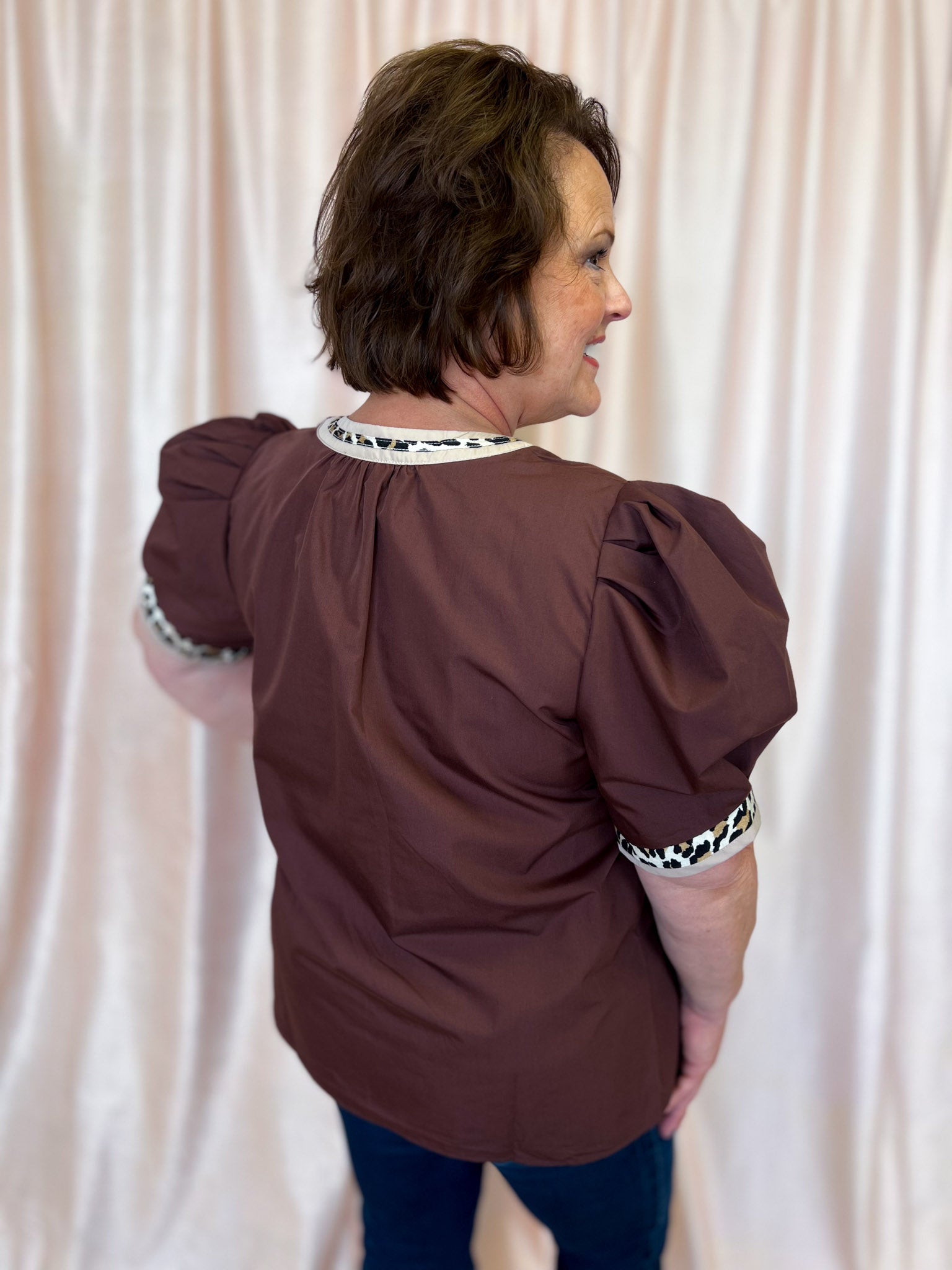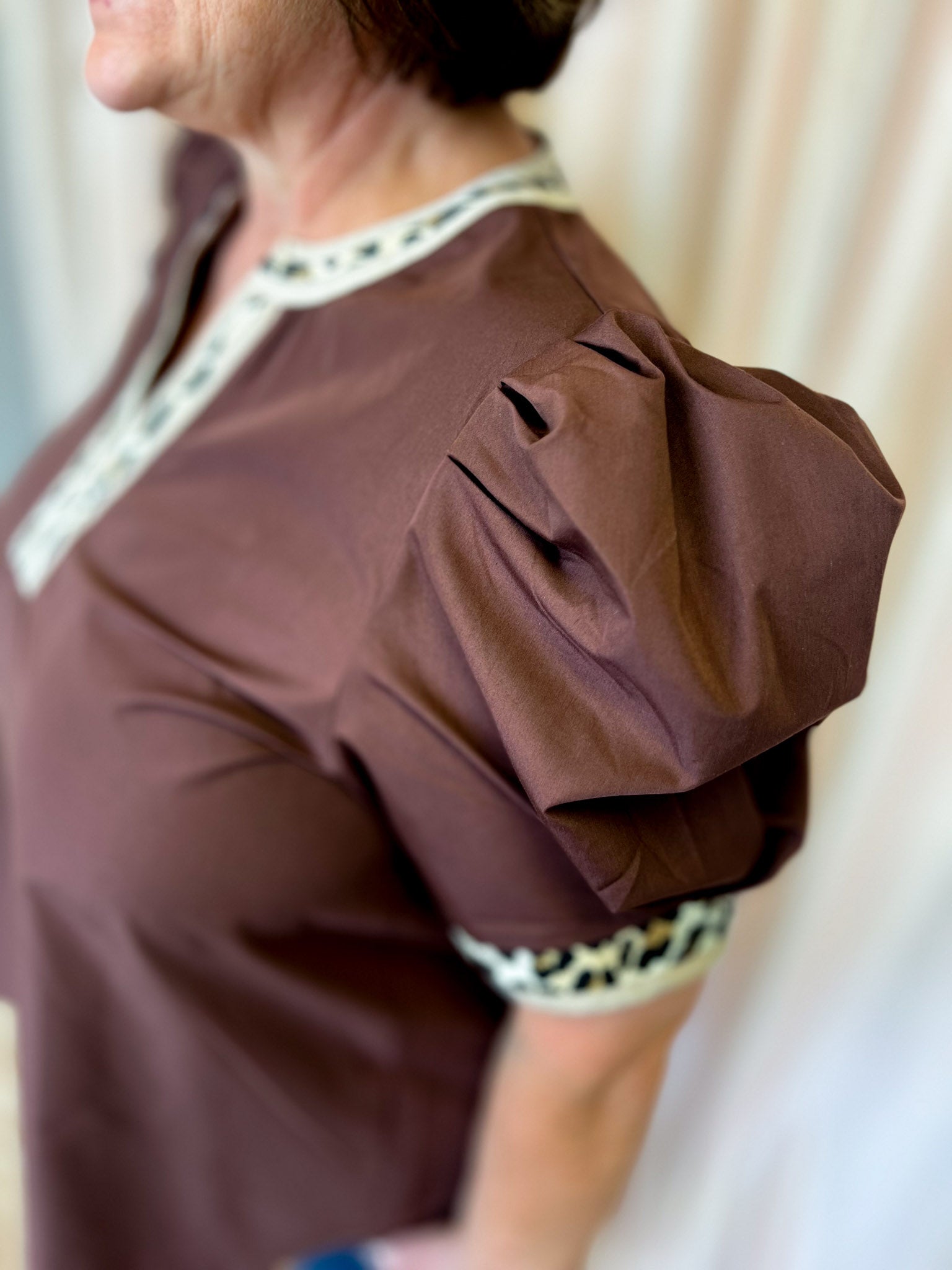 Add some playful print to your wardrobe with our Autumn Safari Curvy Brown Leopard Trim Top! The solid pleated short voluminous sleeves add a fun touch, while the accented leopard print split v-neck and band give it a unique edge. Say "hello" to your new favorite go-to top!