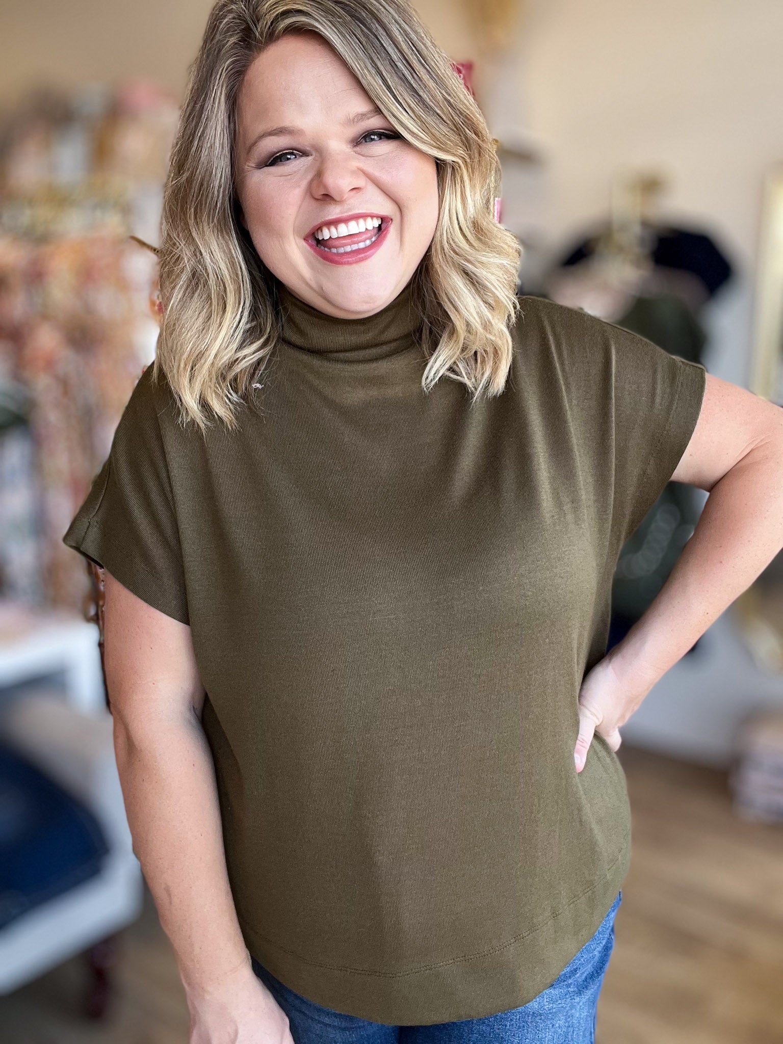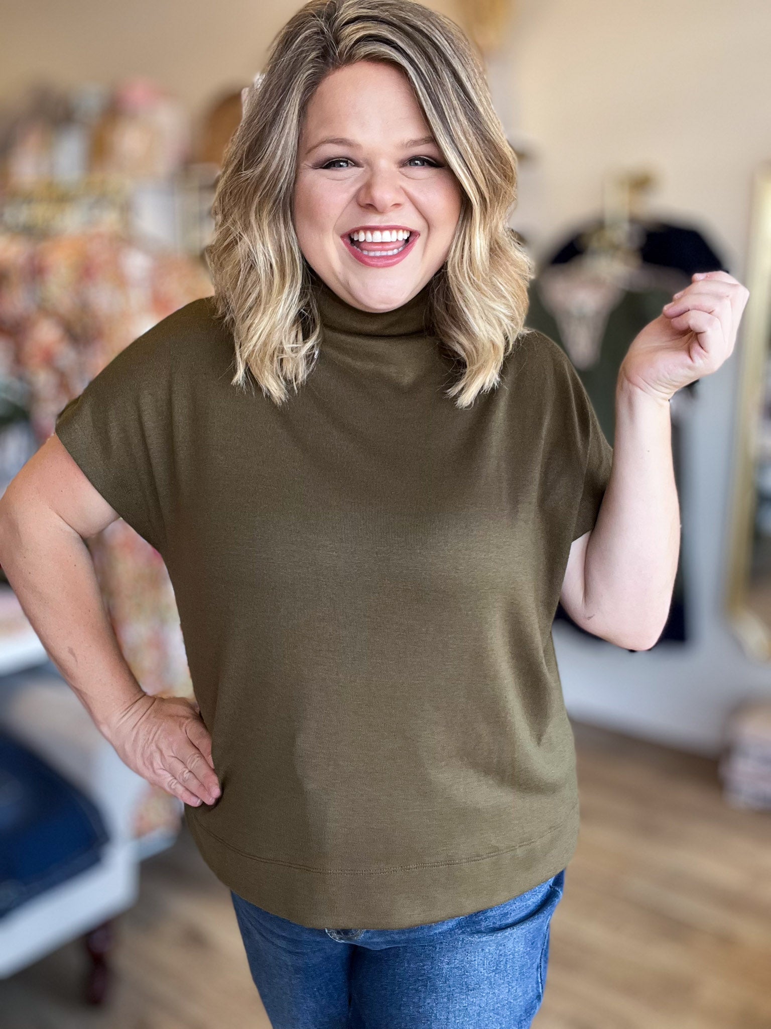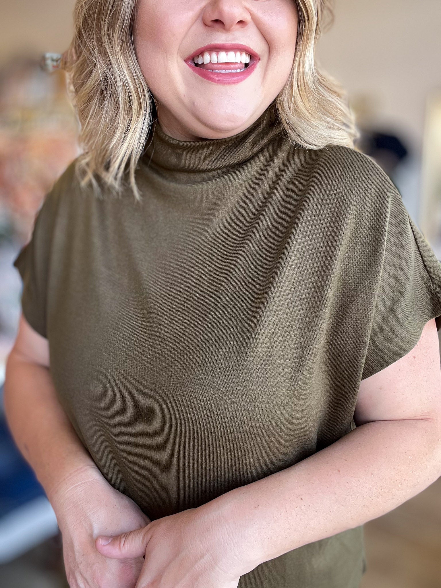 Elevate your style with this Old Money Vibes Curvy Olive Mock Neck Knit Top. The cozy knit fabric and mock turtle neck bring laid-back sophistication, while cap sleeves keep things breezy and cool. Its olive green shade adds a chic earthiness perfect for fall. Simple yet effortlessly stylish, this top is your new go-to for playful elegance with a modern twist.