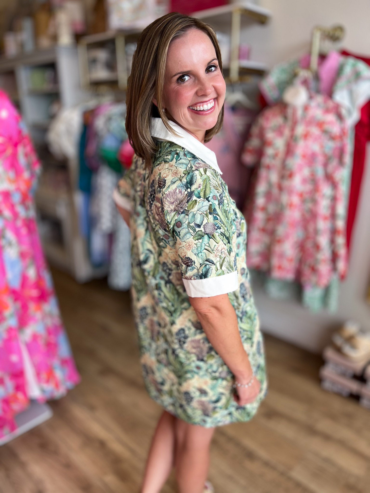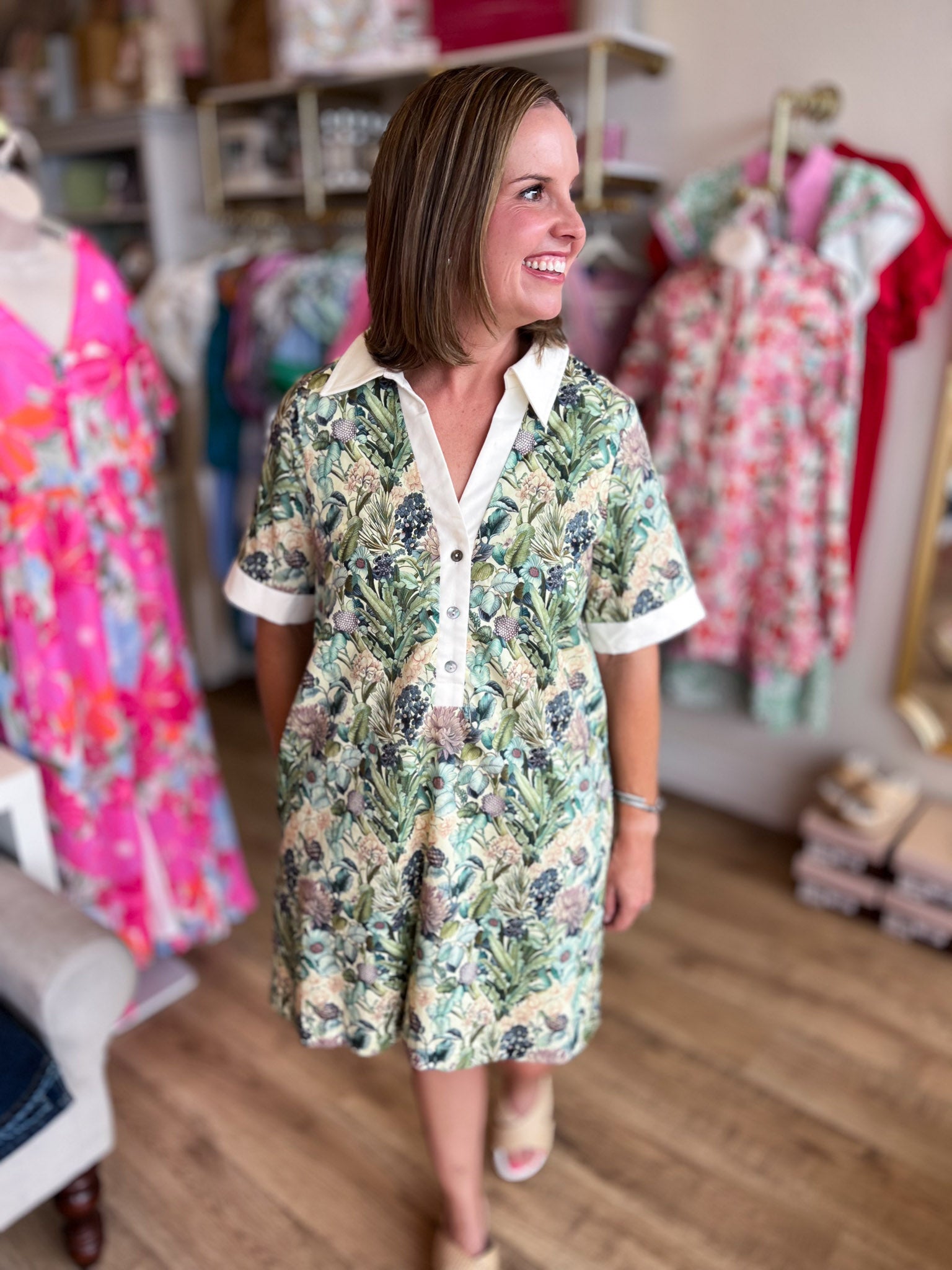 We are loving the country club chic vibes of the Tansy Tapestry Olive Floral Mini Dress! Featuring a contrast accent collar with button closure and band detail, flattering v-neck, and an intricate floral print, you will love this lined yet lightweight dress that is a perfect choice for mid to late summer and early fall! The slimming silhouette and convenient pockets make this dress both stylish and functional. Say hello to a new closet favorite!