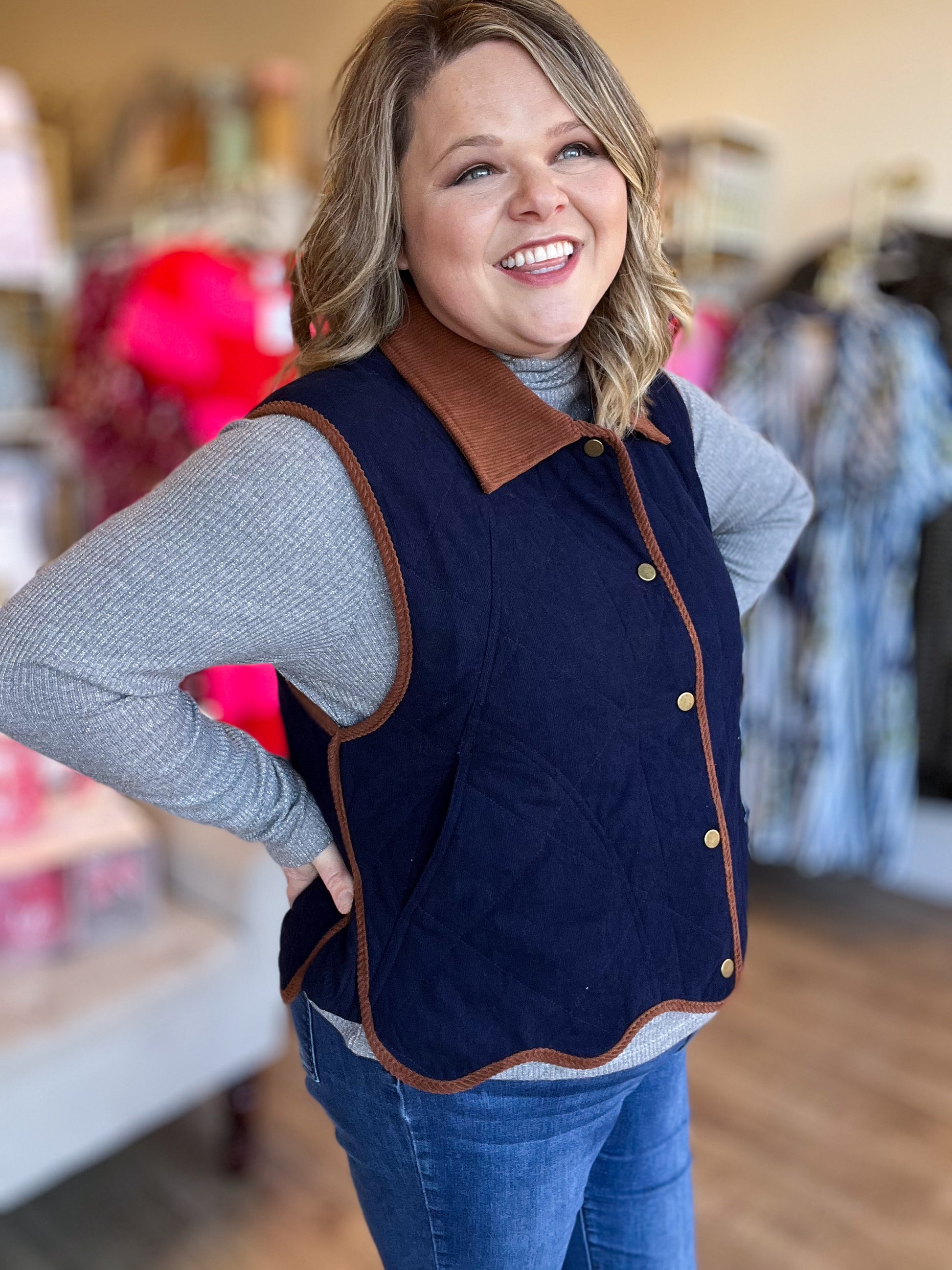 This scalloped vest is basically a compliment magnet waiting to happen! Lightweight and thoughtfully designed, it layers beautifully without adding bulk—so you get all the warmth with none of the heaviness. Snap buttons, functional front pockets, and a fully lined construction make it as practical as it is pretty. The adorable scalloped hem and collar details give it that special something, while the sleek silhouette keeps your winter look polished and flattering. Your new favorite layering piece is here!