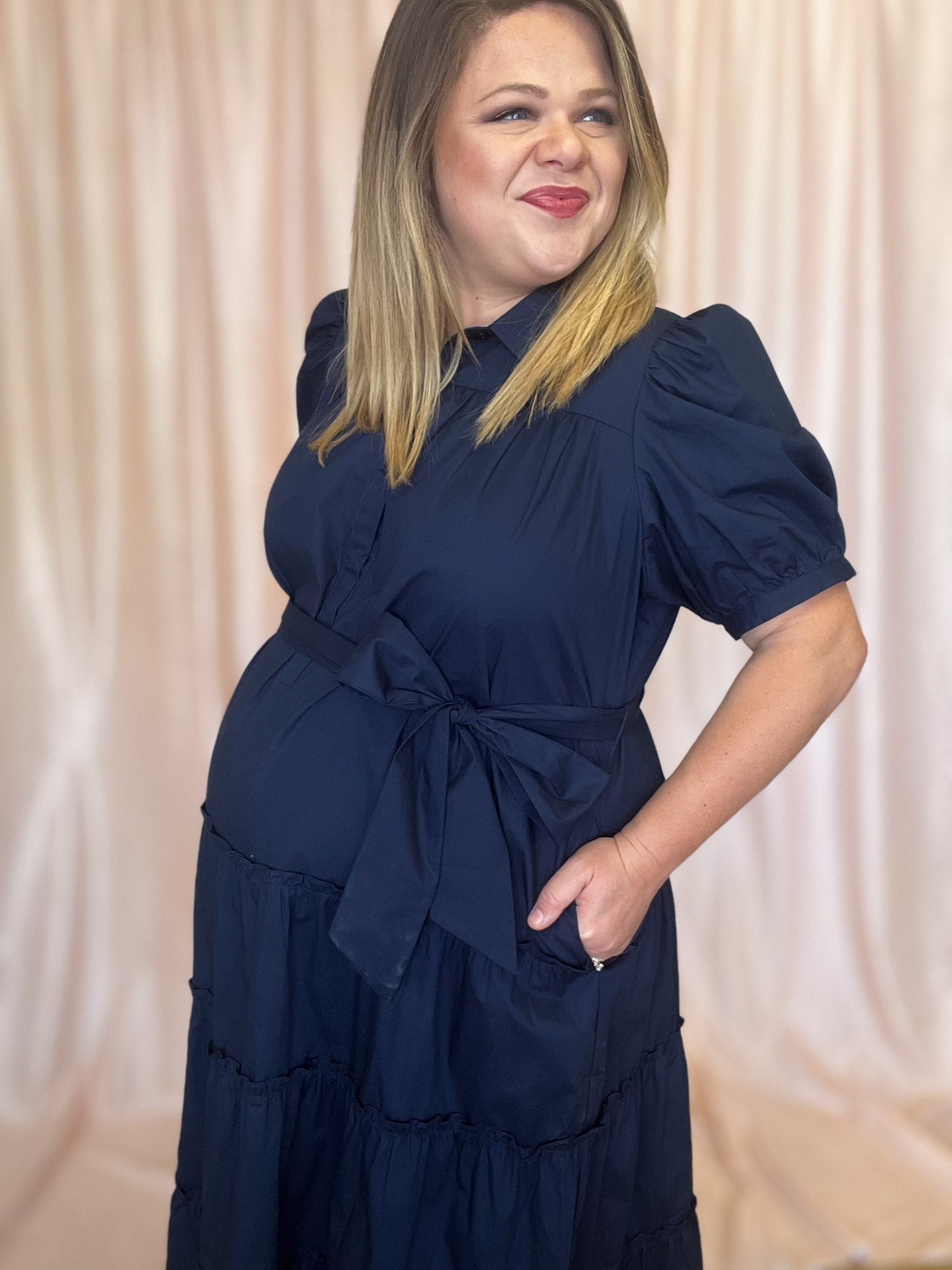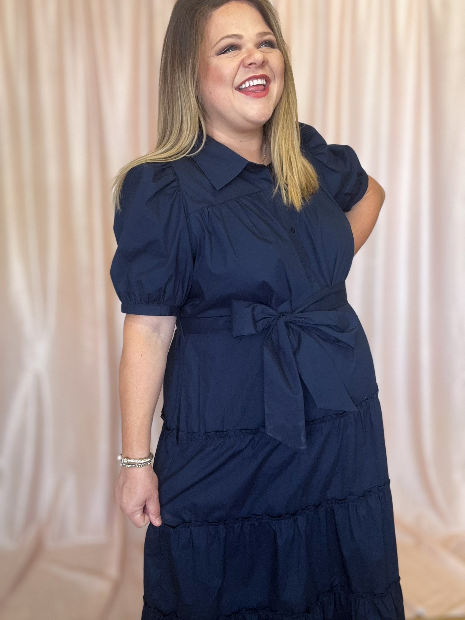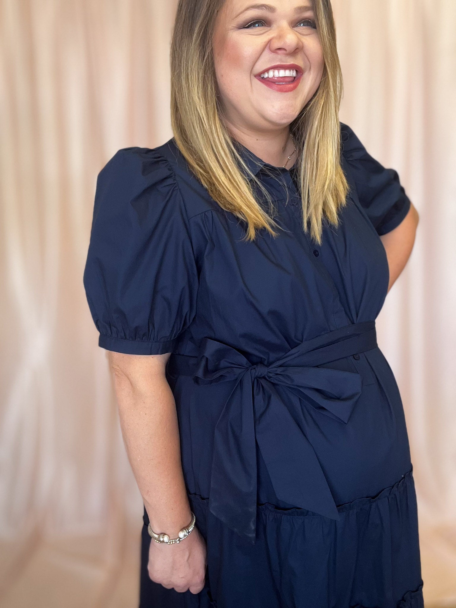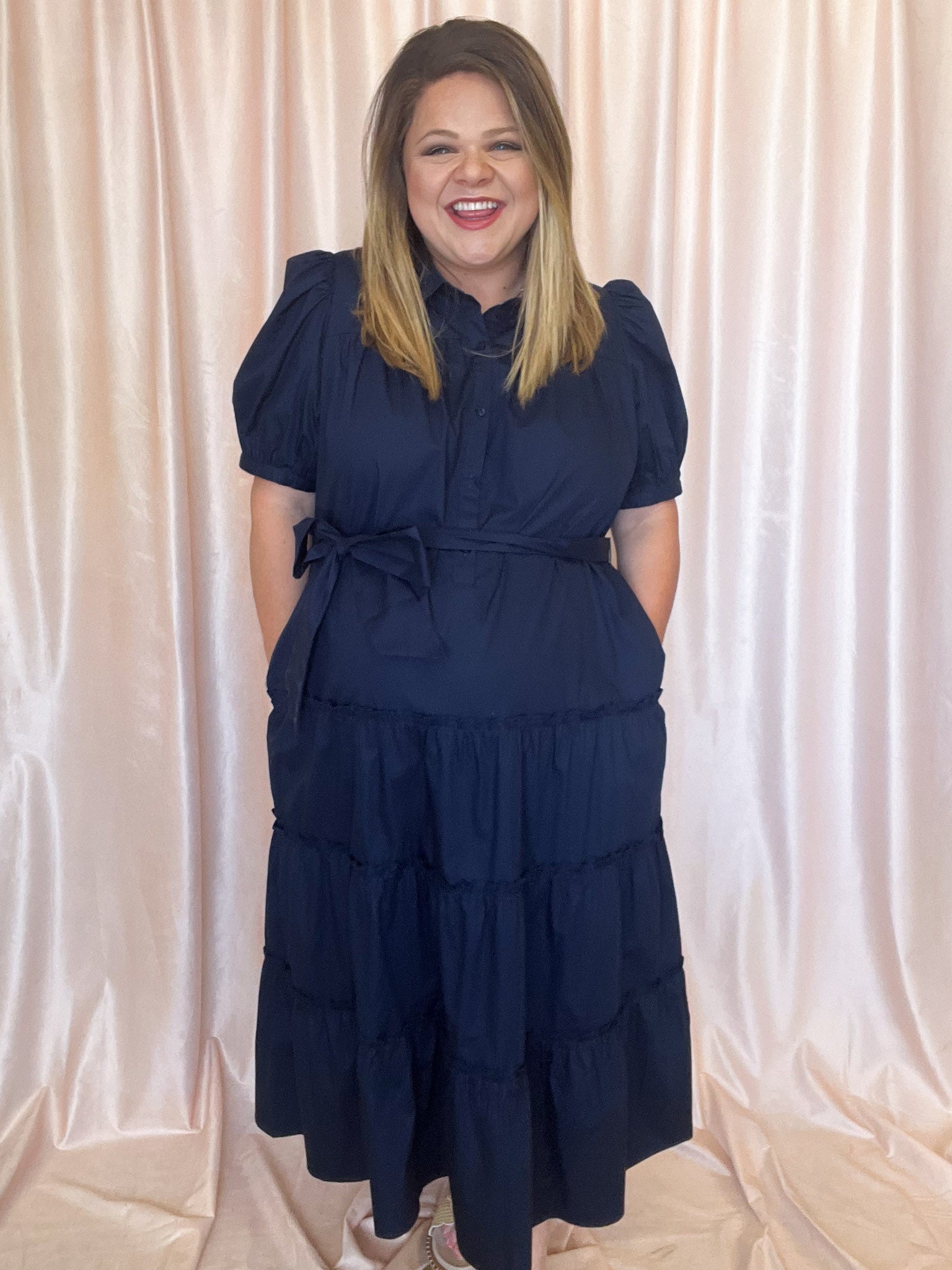Every plus-size gal needs that solid go-to dress that effortlessly transitions from work to play. That is exactly what The Maine Event Plus-Size Navy Tiered Midi Dress does! Featuring a crisp 100% cotton material, tailored puff sleeves, a flattering v-neck with buttons down to the waist, classic collar, removable tie at waist, functional pockets and tiered midi skirt, this is a dress to impress! Versatile for so many occasions - from church, to work, to baby showers, to daytime/nighttime wear, you will not regret adding this piece to your closet!