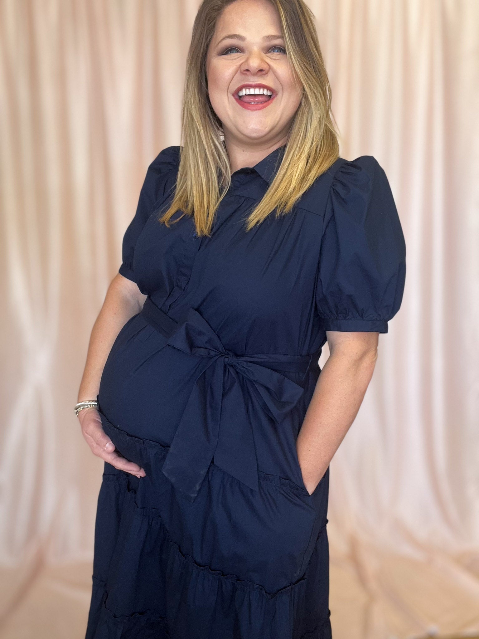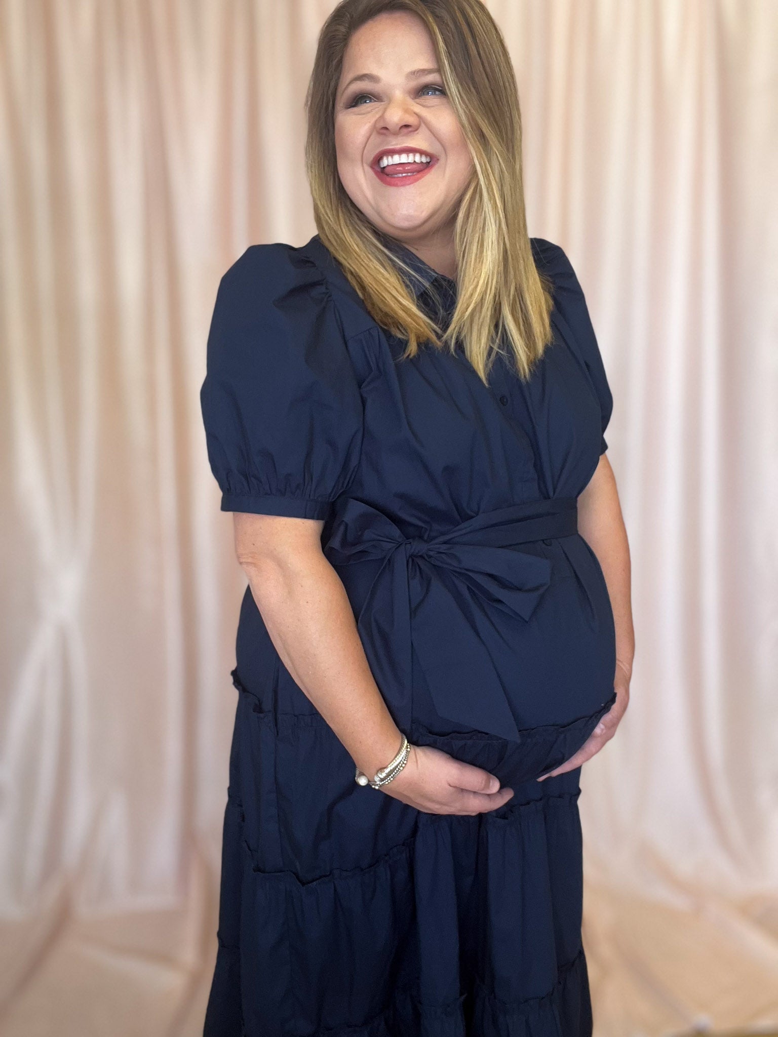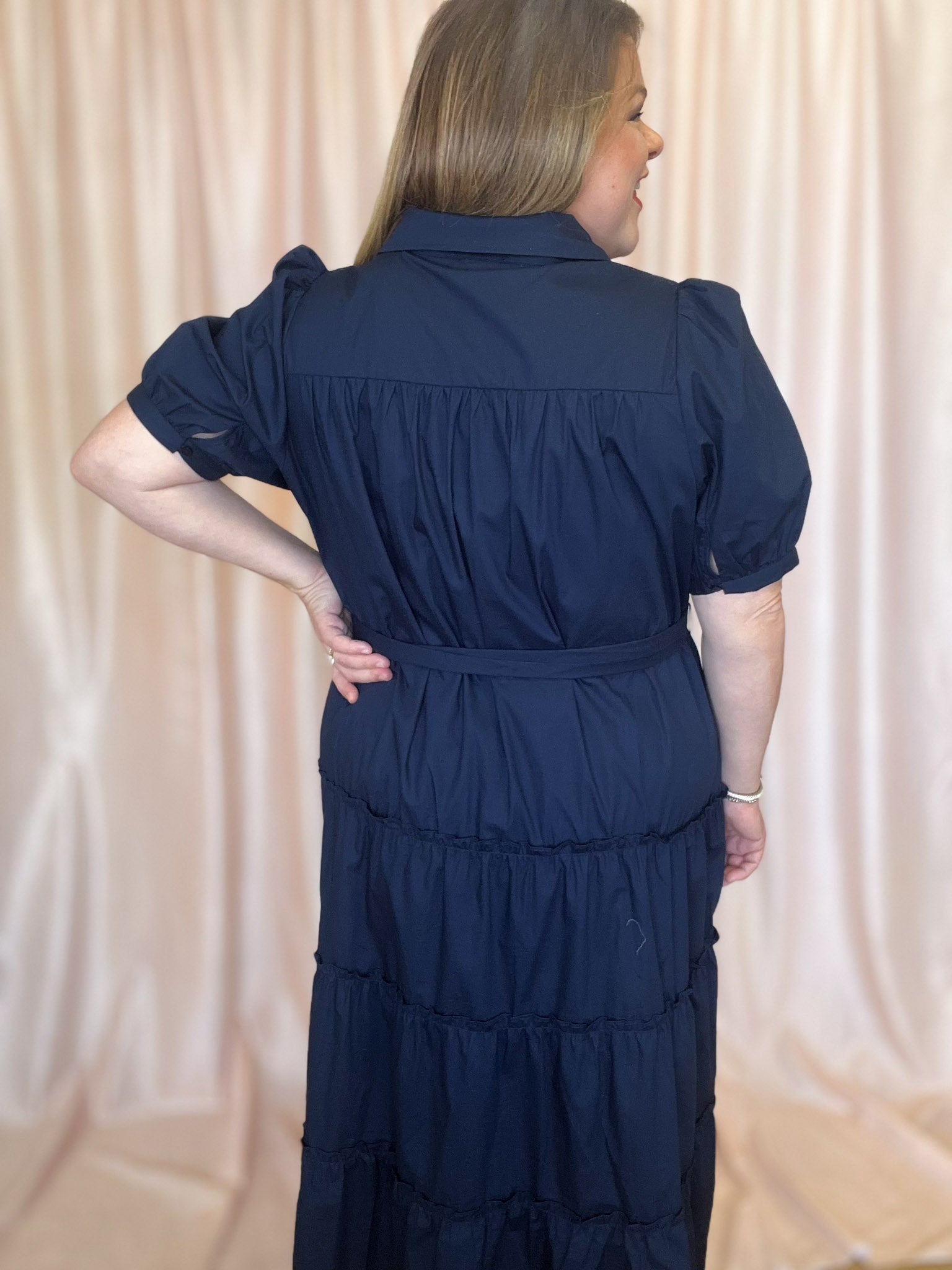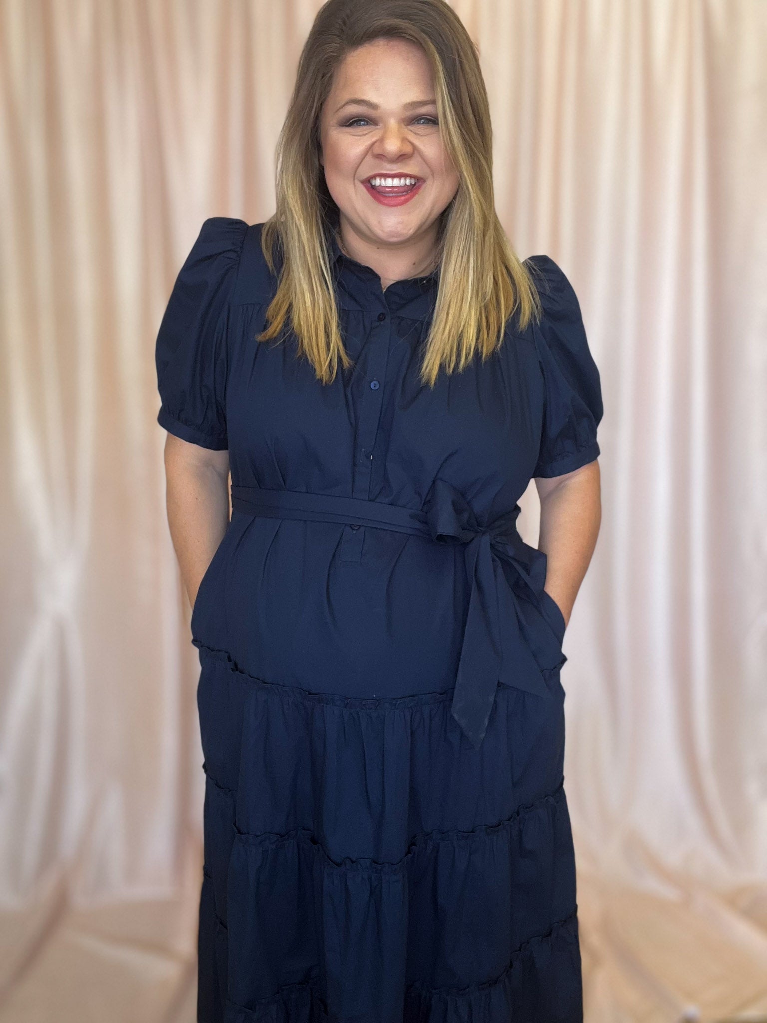 Every plus-size gal needs that solid go-to dress that effortlessly transitions from work to play. That is exactly what The Maine Event Plus-Size Navy Tiered Midi Dress does! Featuring a crisp 100% cotton material, tailored puff sleeves, a flattering v-neck with buttons down to the waist, classic collar, removable tie at waist, functional pockets and tiered midi skirt, this is a dress to impress! Versatile for so many occasions - from church, to work, to baby showers, to daytime/nighttime wear, you will not regret adding this piece to your closet!