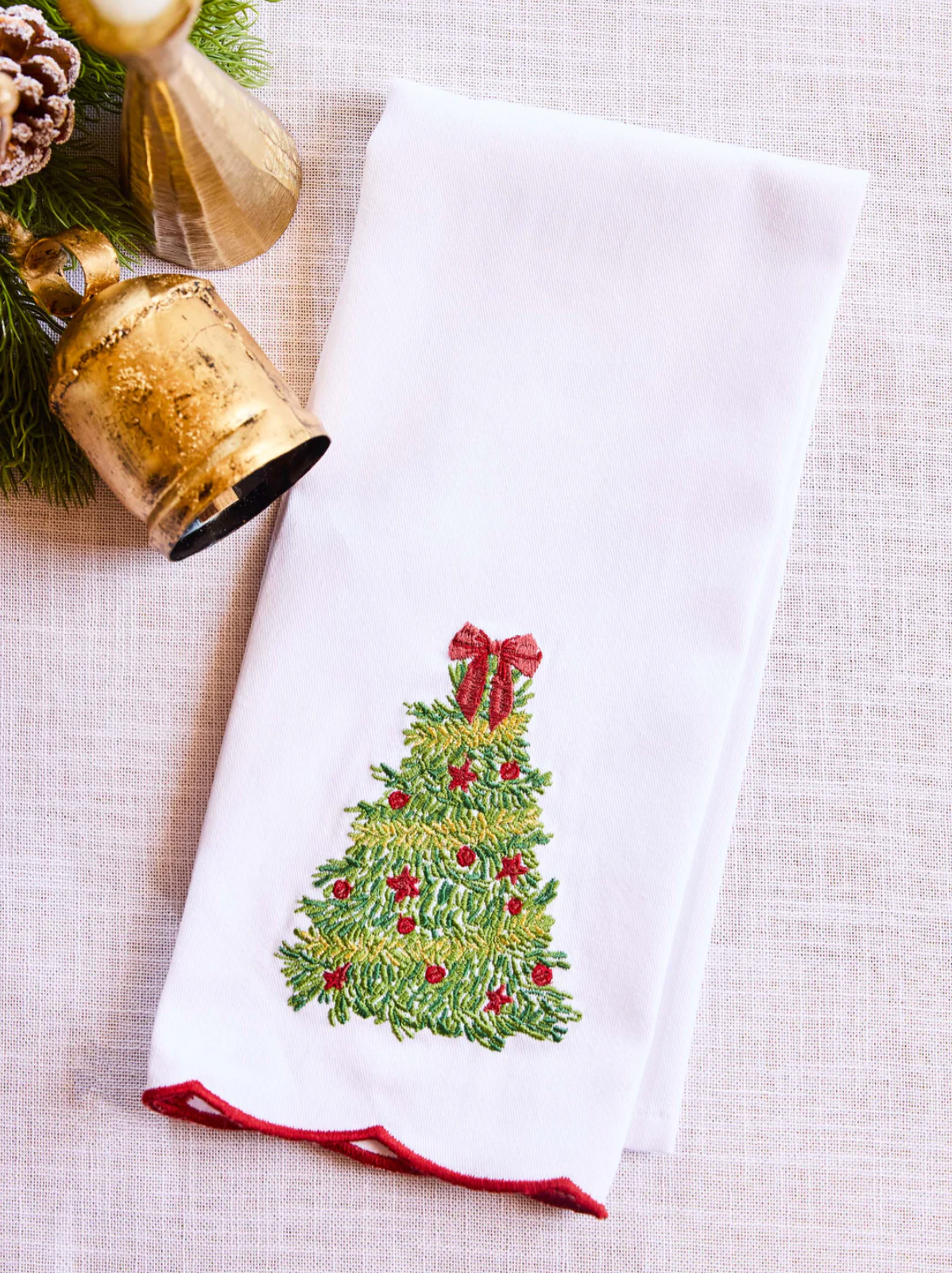 Transform your kitchen into a festive haven with this charming embroidered tea towel! Showcasing an intricately stitched Christmas tree design with a whimsical scalloped trim, it's the perfect way to sprinkle holiday magic throughout your home. Whether you're hosting gatherings, wrapping up a thoughtful gift, or simply wanting to keep the seasonal spirit alive in your kitchen, this delightful towel brings warmth and character to every corner of your space.