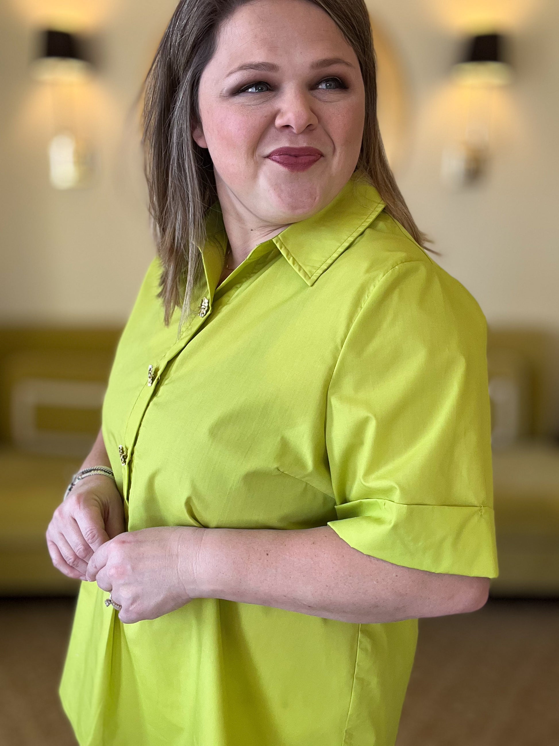 A true closet staple you’ll reach for again and again! Elegance meets ease in this must-have chartreuse blouse. Designed with a relaxed, curve-friendly silhouette, this beauty features a polished collared neckline, short sleeves, and eye-catching gold snaps that add just the right touch of glam. The lightweight fabric drapes beautifully without clinging, making it as practical as it is chic. Dress it up with heels and statement jewelry or keep it casual with flats—this timeless top will be your new go-to!
