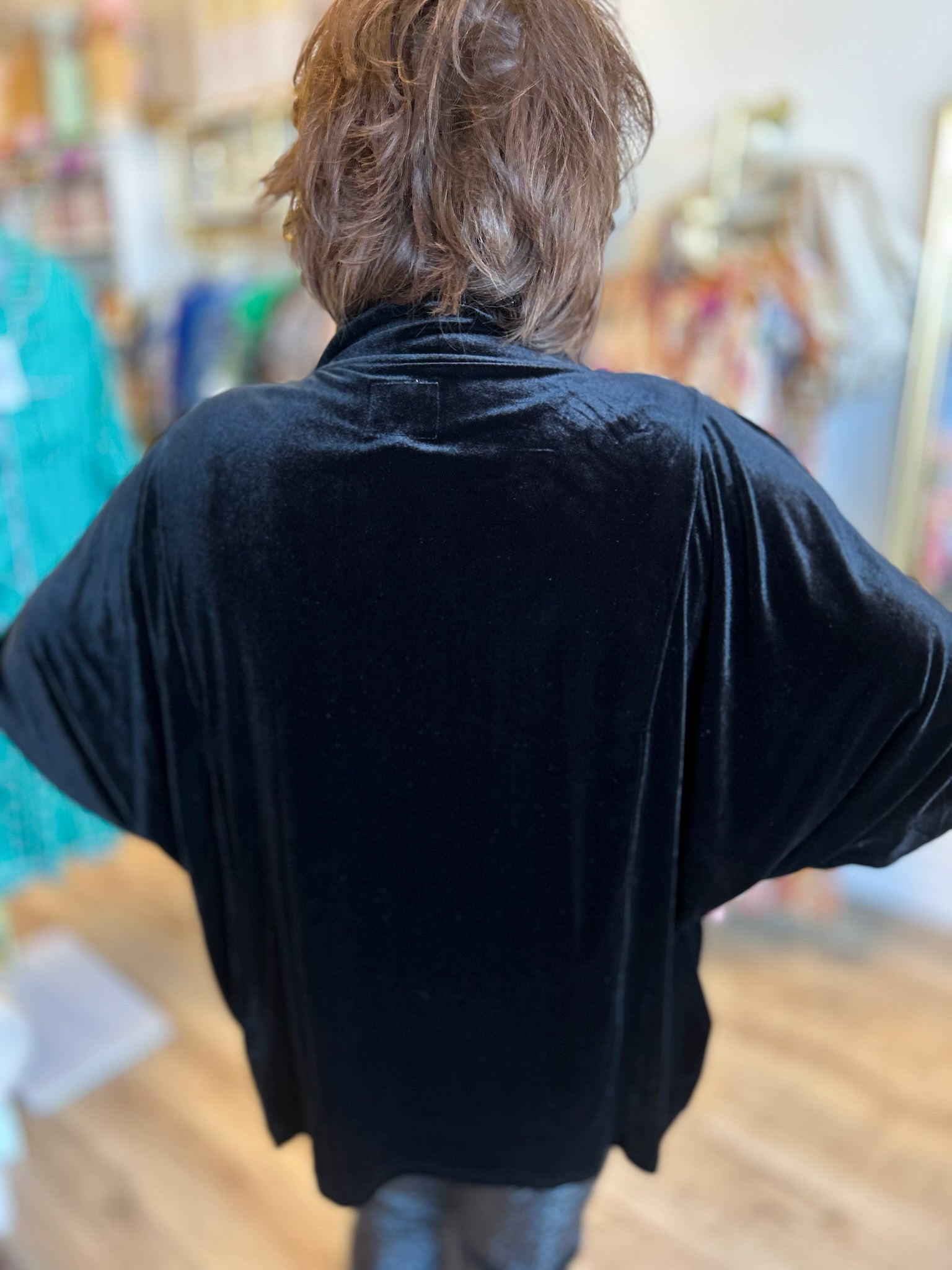 Meet your new favorite winter top—a luxurious black velvet piece that's equal parts cozy and chic. The elegant cowl neck adds a touch of sophistication while the distinctive sleeve design gives this top serious personality. Crafted to flatter curvy silhouettes, it's the kind of versatile essential that works dressed up for holiday parties or paired with your favorite jeans for a night out. Soft, sumptuous velvet feels as amazing as it looks, making this top an instant wardrobe MVP that'll have you reaching for it again and again!