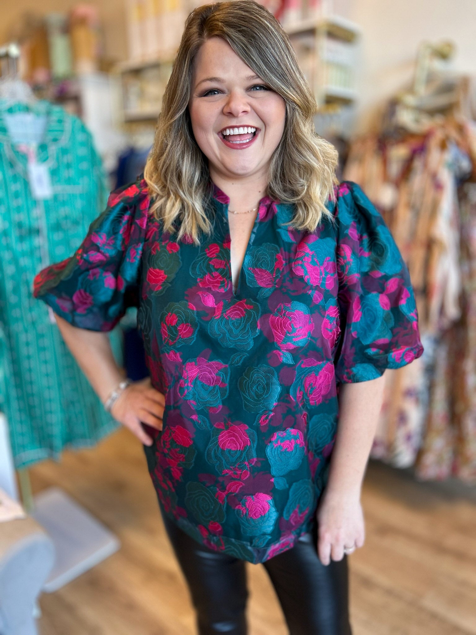 Wrap yourself in style with this enchanting jacquard top, where winter florals dance across luxurious fabric in dreamy jade and pink hues. The intricate jacquard weave creates dimensional texture that catches the light beautifully, while the curvy silhouette flatters and celebrates your shape. Perfect for adding a touch of fanciful elegance to your seasonal wardrobe—whether you're heading to a holiday gathering or simply want to feel magical in your everyday moments.